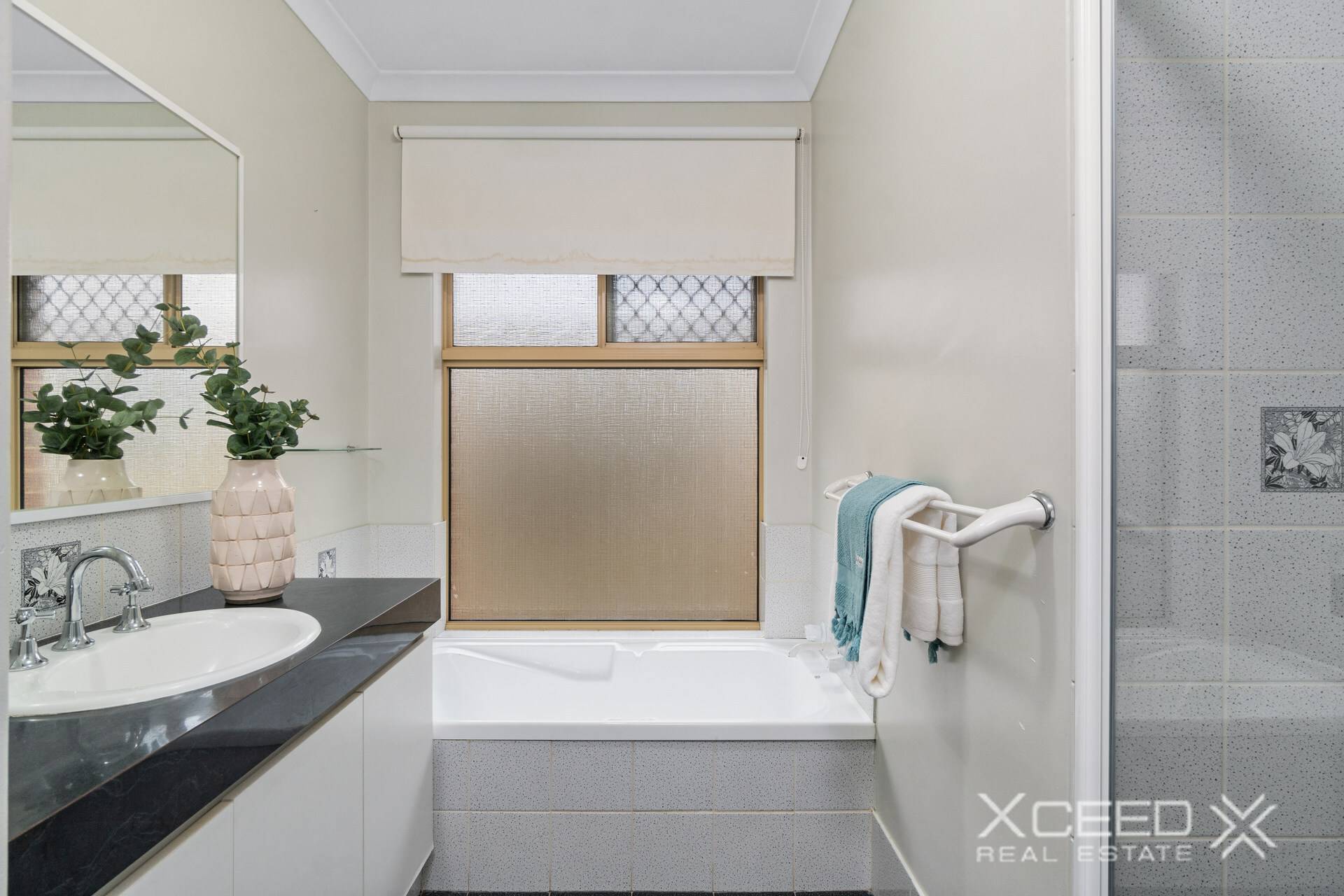 There are stainless steel appliances in the kitchen, a double sink, breakfast bar and a clear outlook across to the lagoon-style swimming pool. There’s a large laundry with direct side access, and both bathrooms are modern and neat, with a bath in the family bathroom. This home also enjoys a bright and airy atmosphere, thanks to sliding doors and plenty of windows opening to the rear garden.