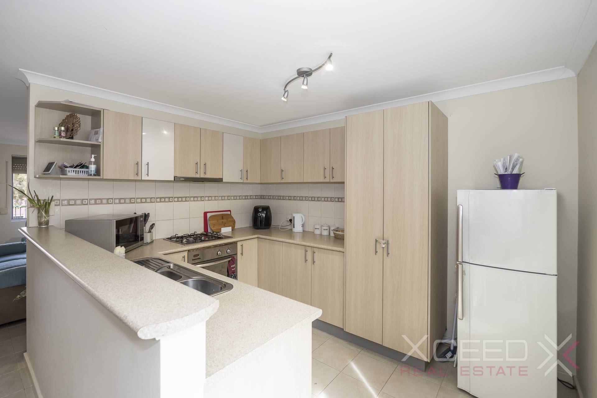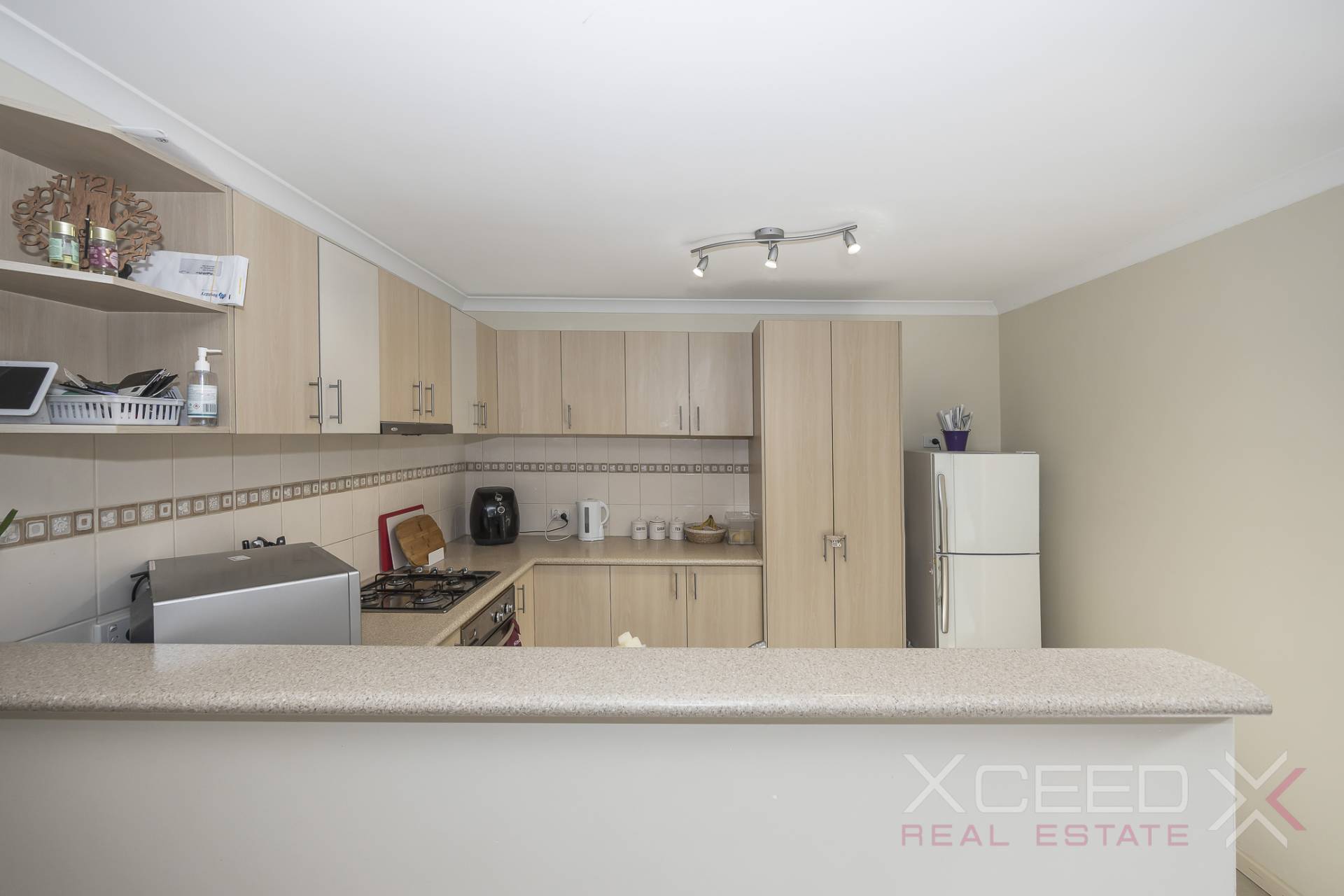 The open plan kitchen/ dining area looks out on to the private, spacious paved outdoor area which has a retractable shade for those warmer months. The kitchen boasts neutral décor, a tiled splashback and plenty of cupboard space.