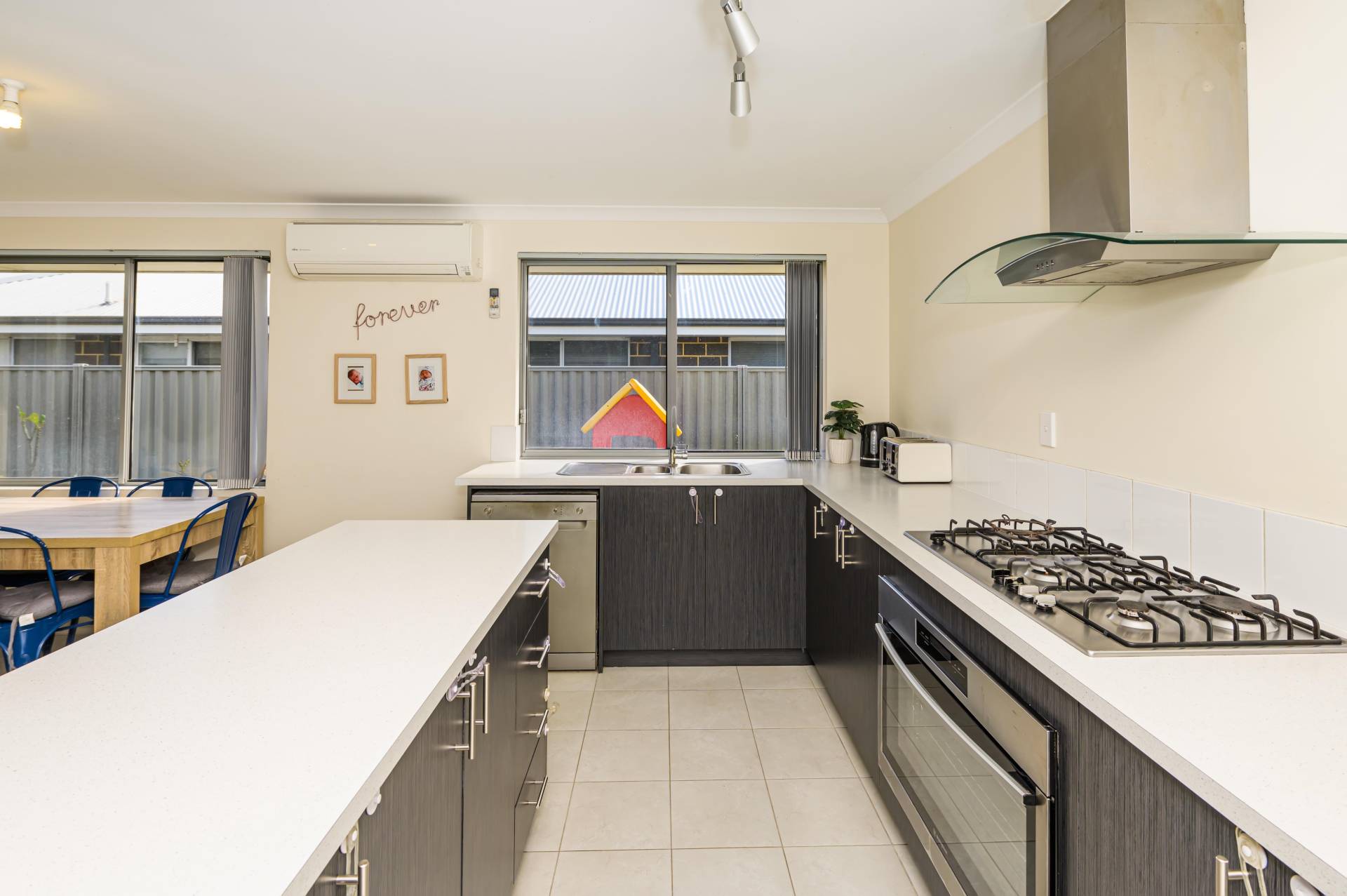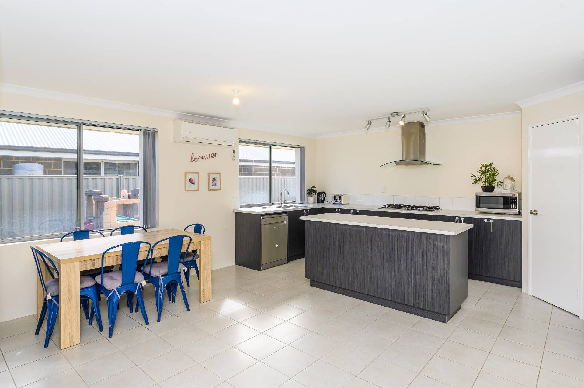 Split system air conditioning units have been added for a comfortable internal climate. Communal areas are tiled for longevity and easy cleaning, and the kitchen is a home chef’s dream. There’s a substantial island bench for prep and presentation, as well as a 900mm oven, 5-burner gas cooktop, and plenty of storage space for pantry items, kitchen tools and appliances. This section of the home is open-planned with a cosy lounge and big, bright dining area which opens directly onto the alfresco.
