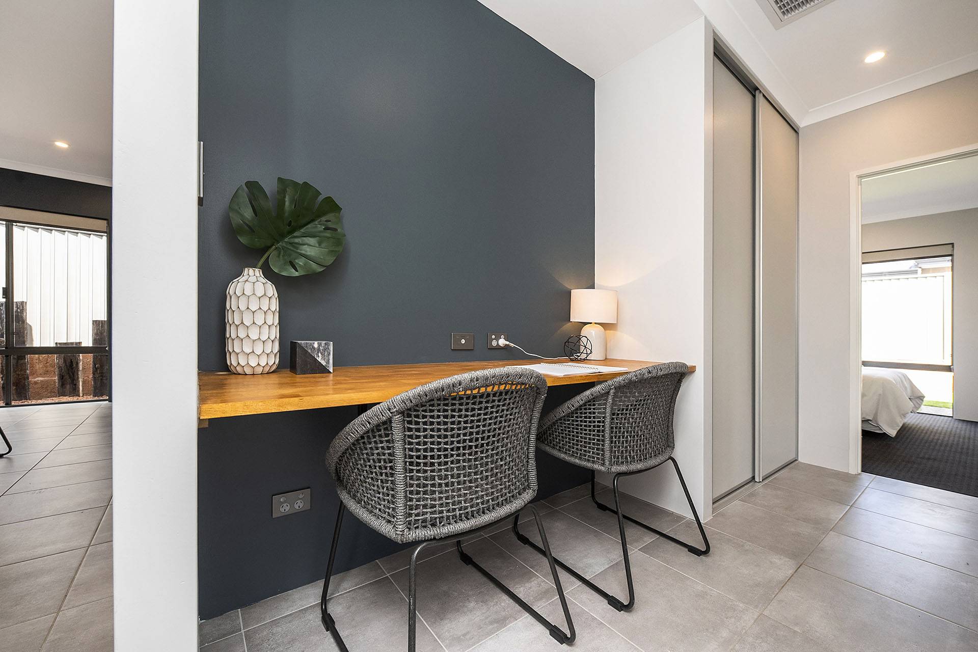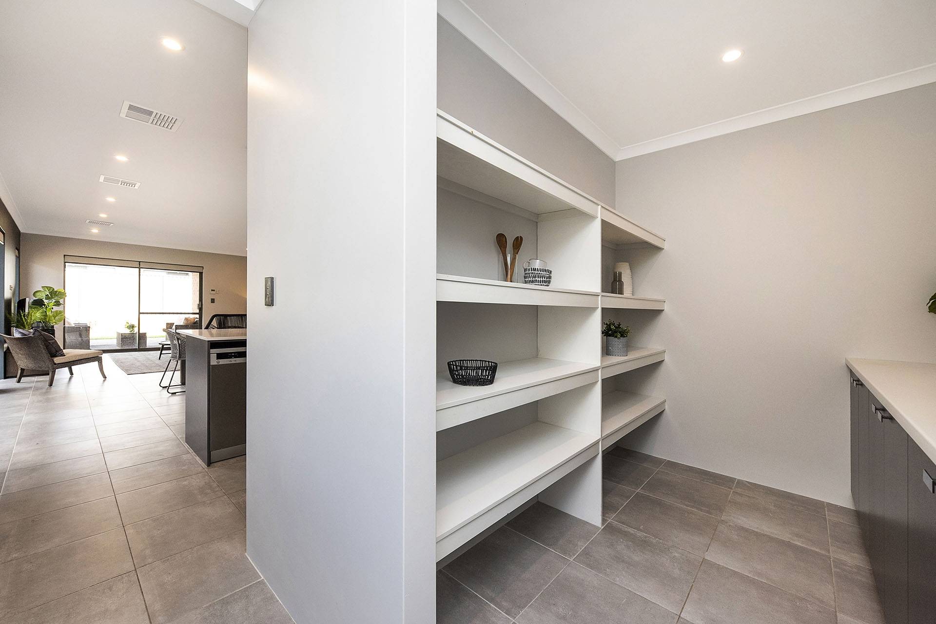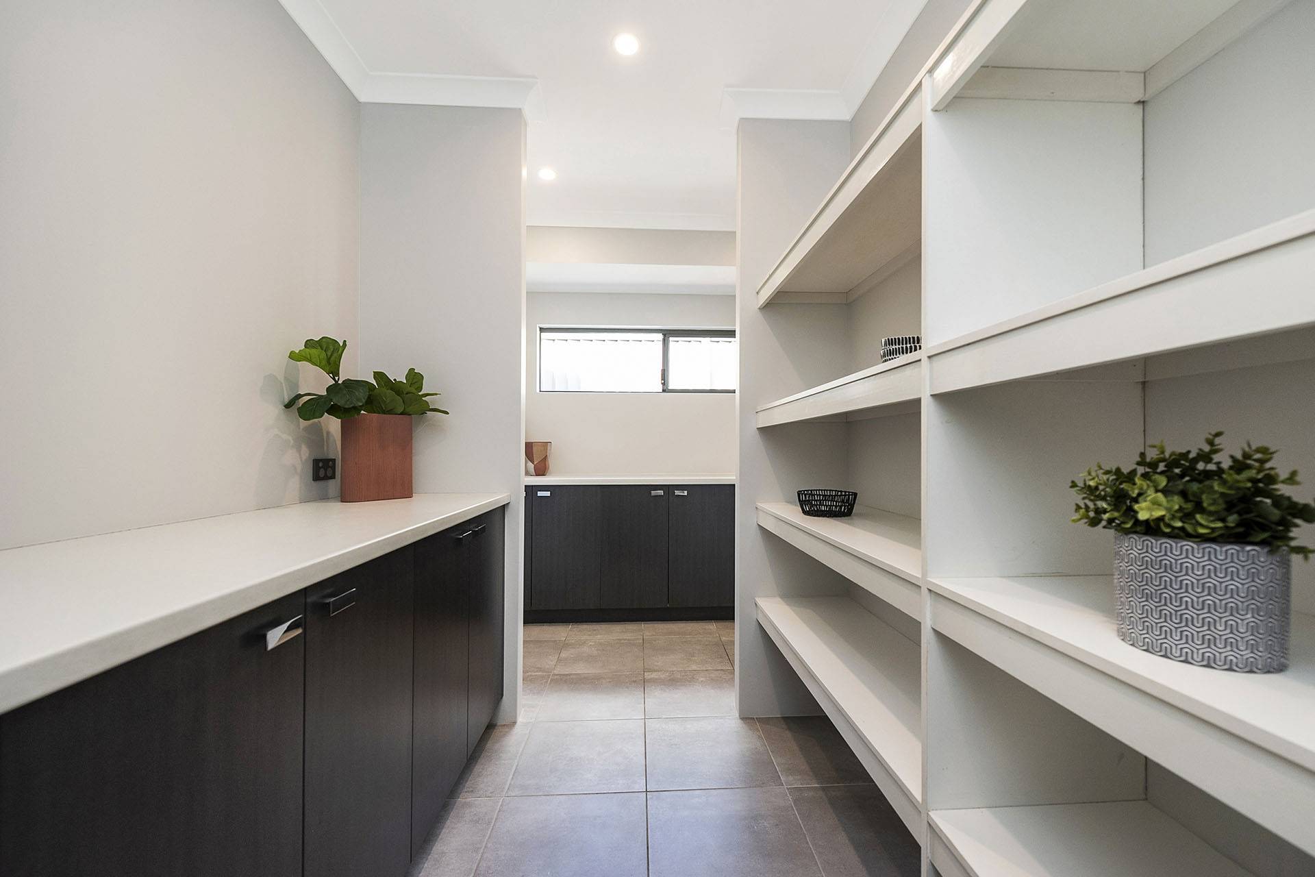 Mealtimes are made easier in this stylish galley kitchen, with stainless steel fixtures, subway splashback tiles, and a dishwasher set into the island bench. Tucked behind this area is a walk-in pantry and powered appliance shelf, only a few steps away from the shopper’s entry. An open plan layout combines the kitchen with dining and living areas to keep conversation flowing, and plate glass picture windows face nature-based landscaping outside. The home also has a media room with blockout curtains, ideal for movies and gaming.