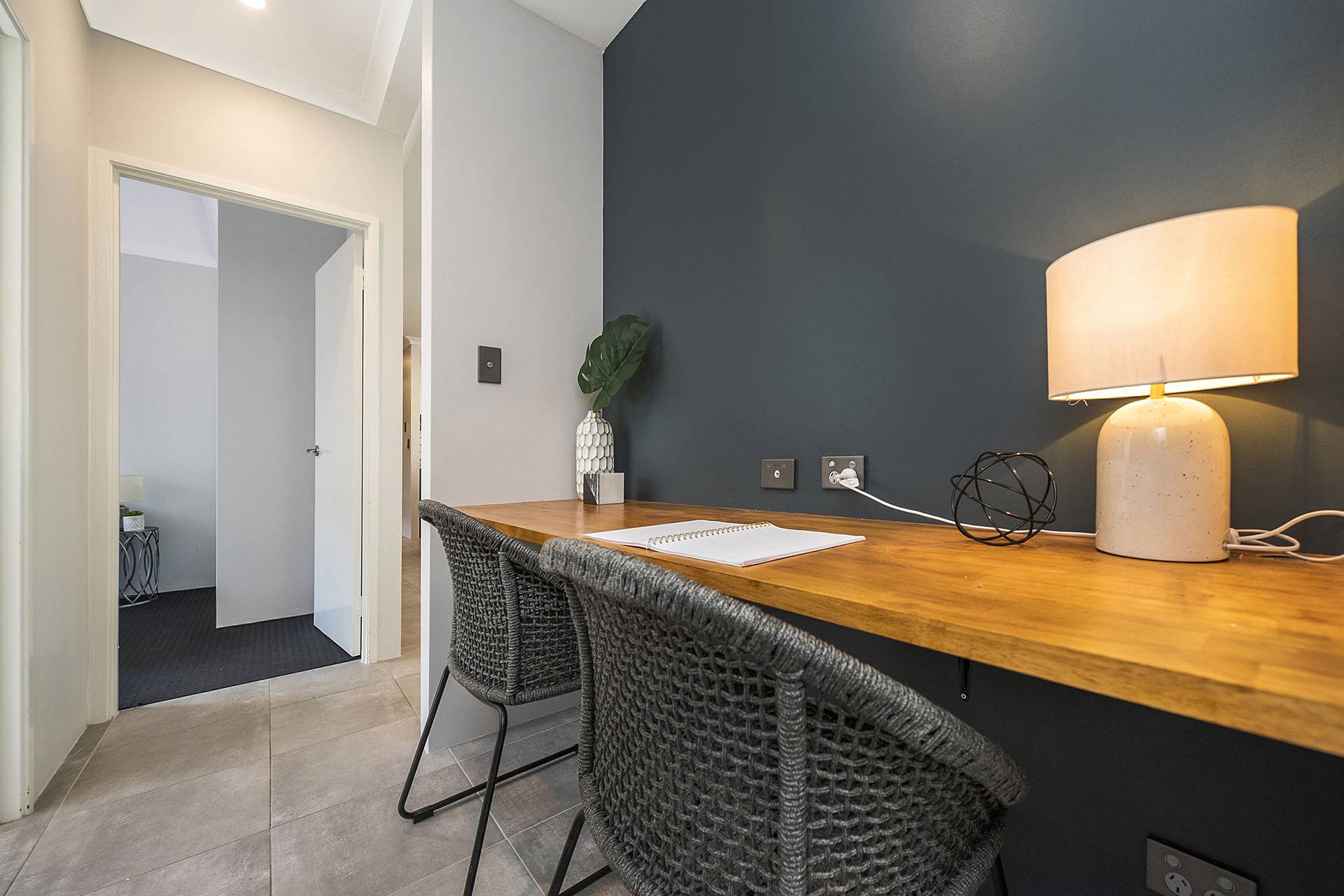 The spacious main bedroom features opaque window treatments over front-facing windows, with highlite windows inviting in more natural light. You’ll love the contemporary ensuite, complete with a semi-frameless shower, twin basins and a separate WC. Three further bedrooms with built-in robes surround a shared family bathroom – equally refined, and with a bathtub for soaking off those hectic days. There’s also an inbuilt study nook and a linen closet in the hallway.