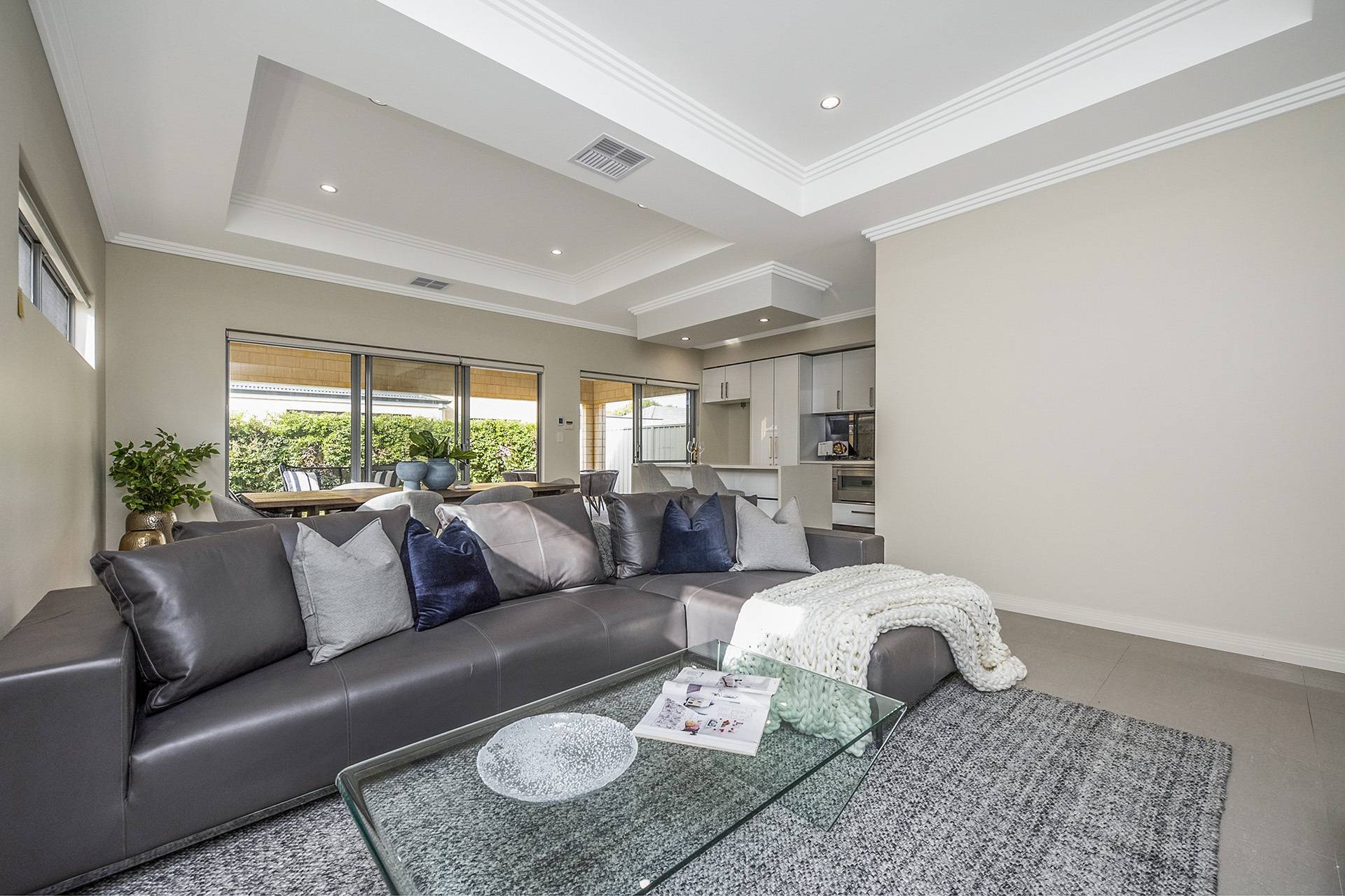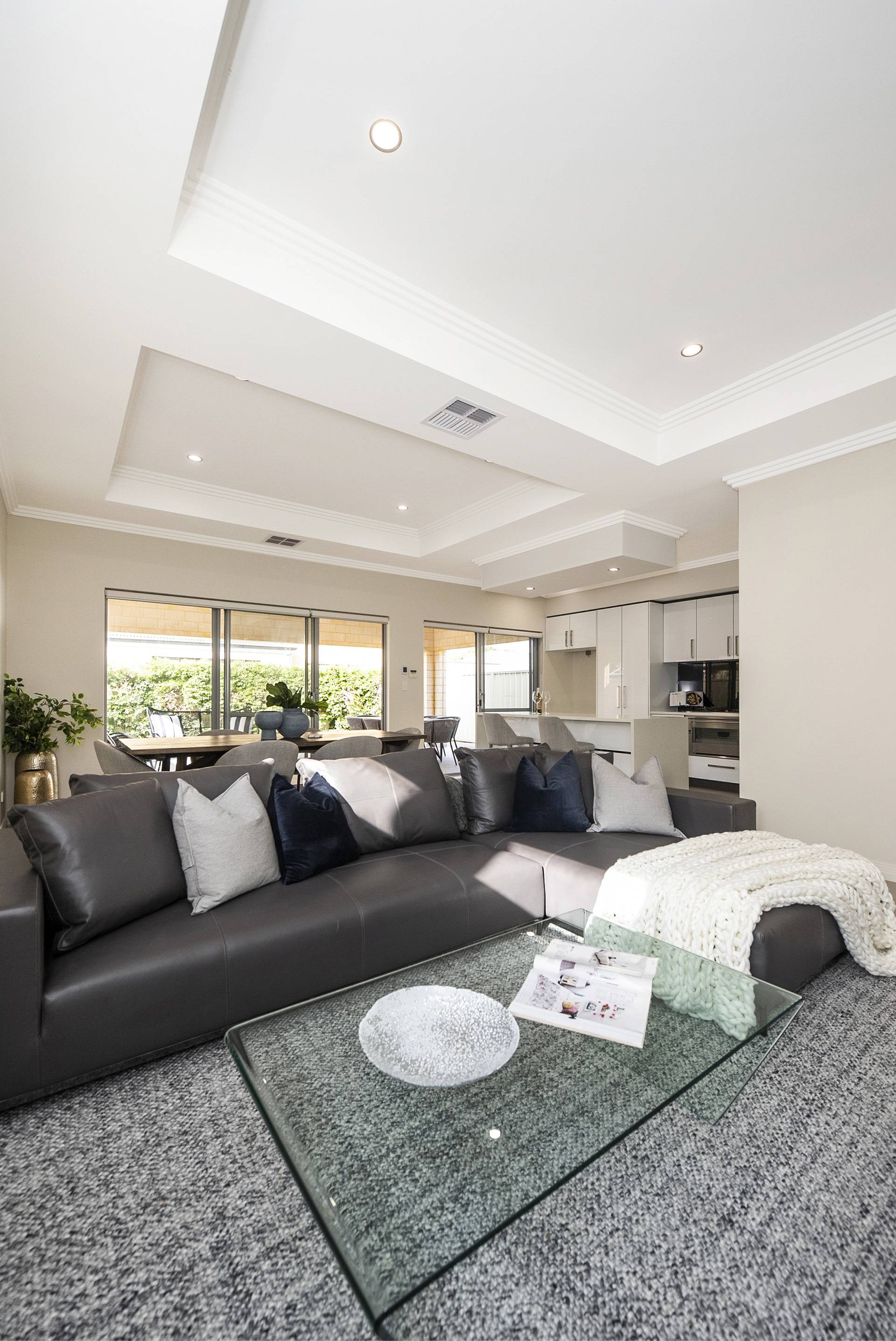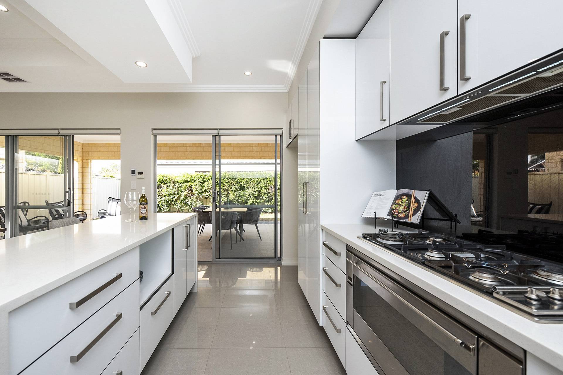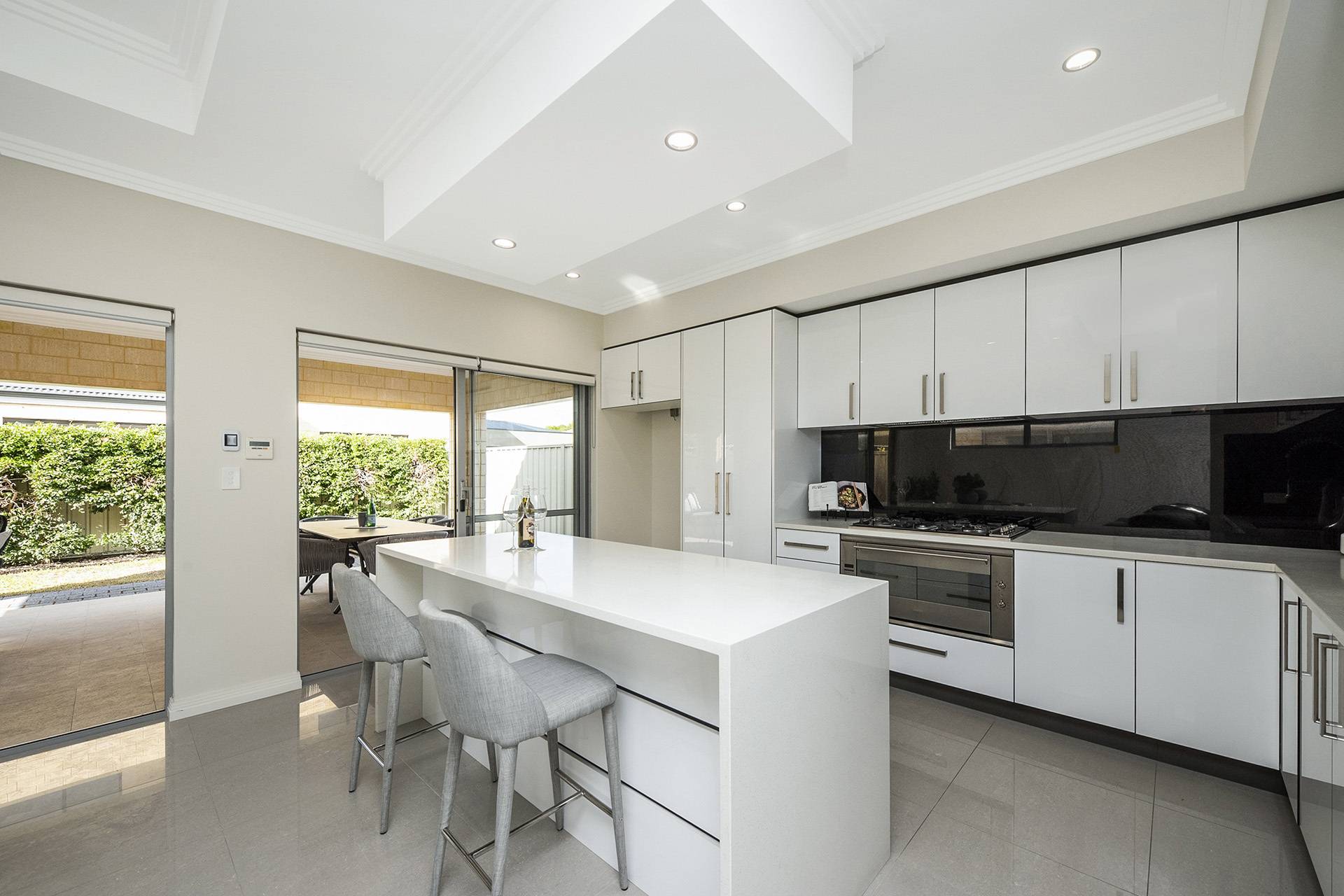 You'll be over the moon with the gourmet kitchen, brimming with soft-closing drawers and cabinetry, stone benchtops, stainless-steel Smeg appliances and striking black glass splashbacks. Immediately outside, the huge covered alfresco area is the ultimate outdoor entertaining space, complete with a cedar-lined coffered ceiling and outlook over the easy-care reticulated lawn and garden beds.