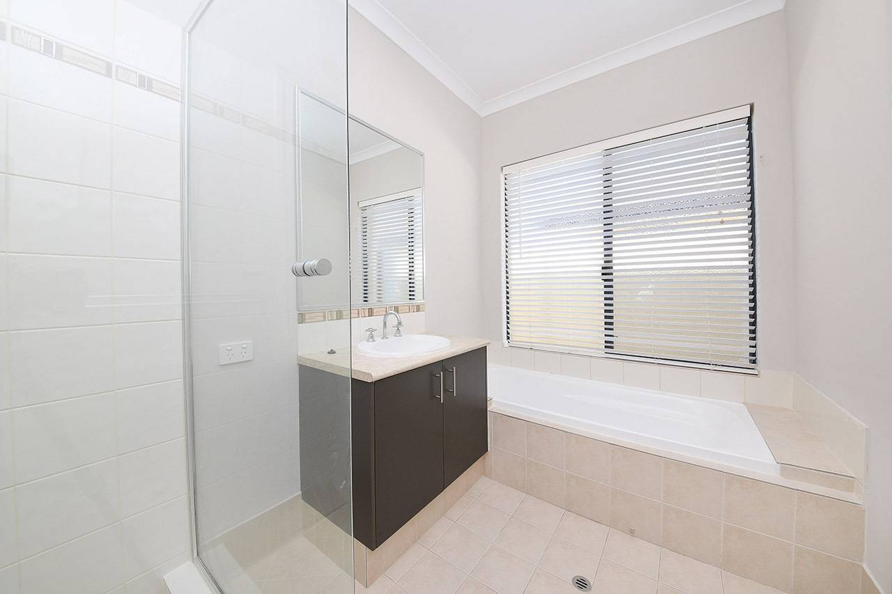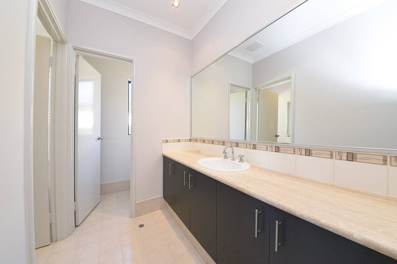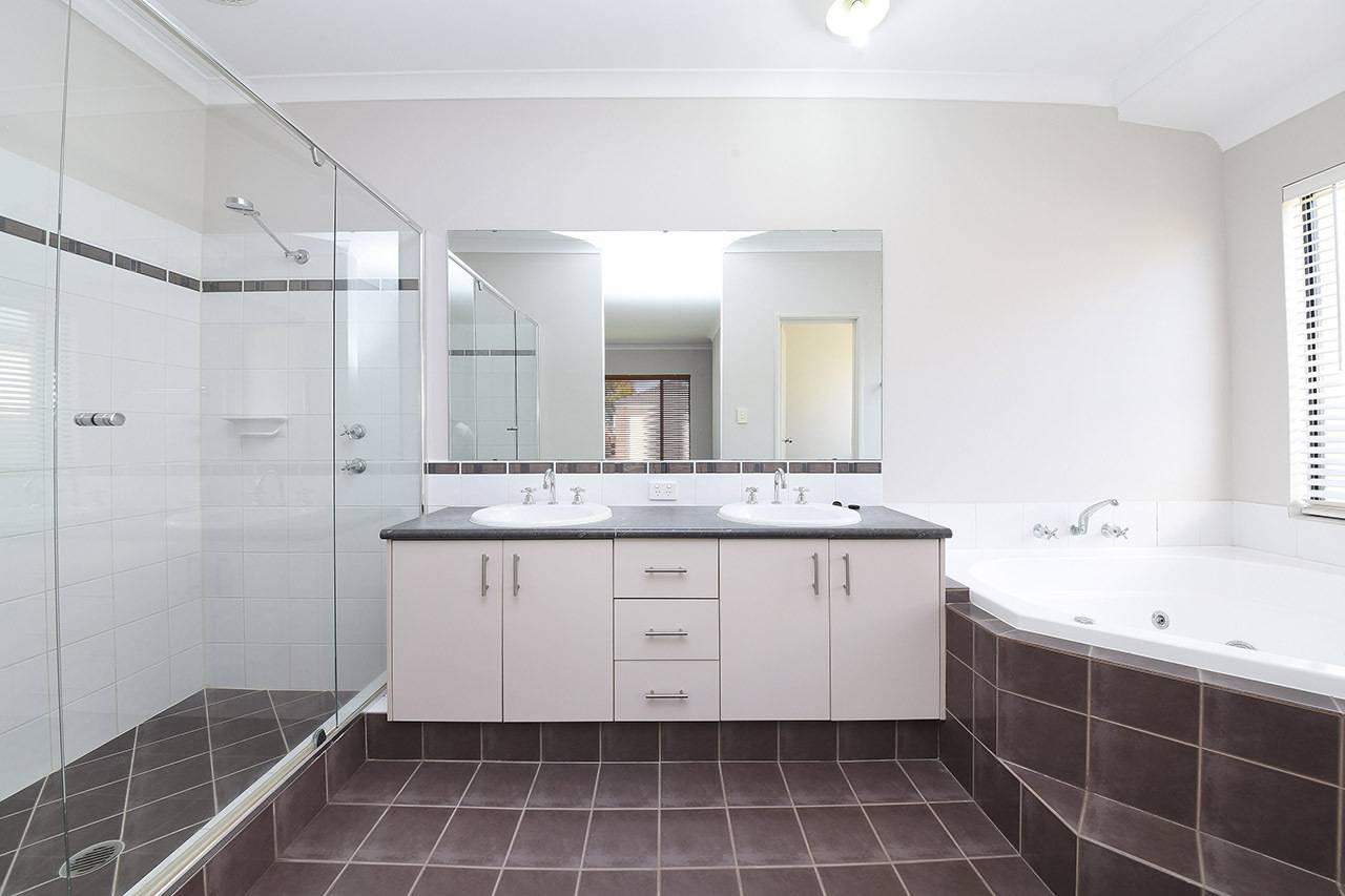 Large ensuite with twin vanities, extra length bench and cupboards, shower with glass screen, corner spa bath and separate WC
