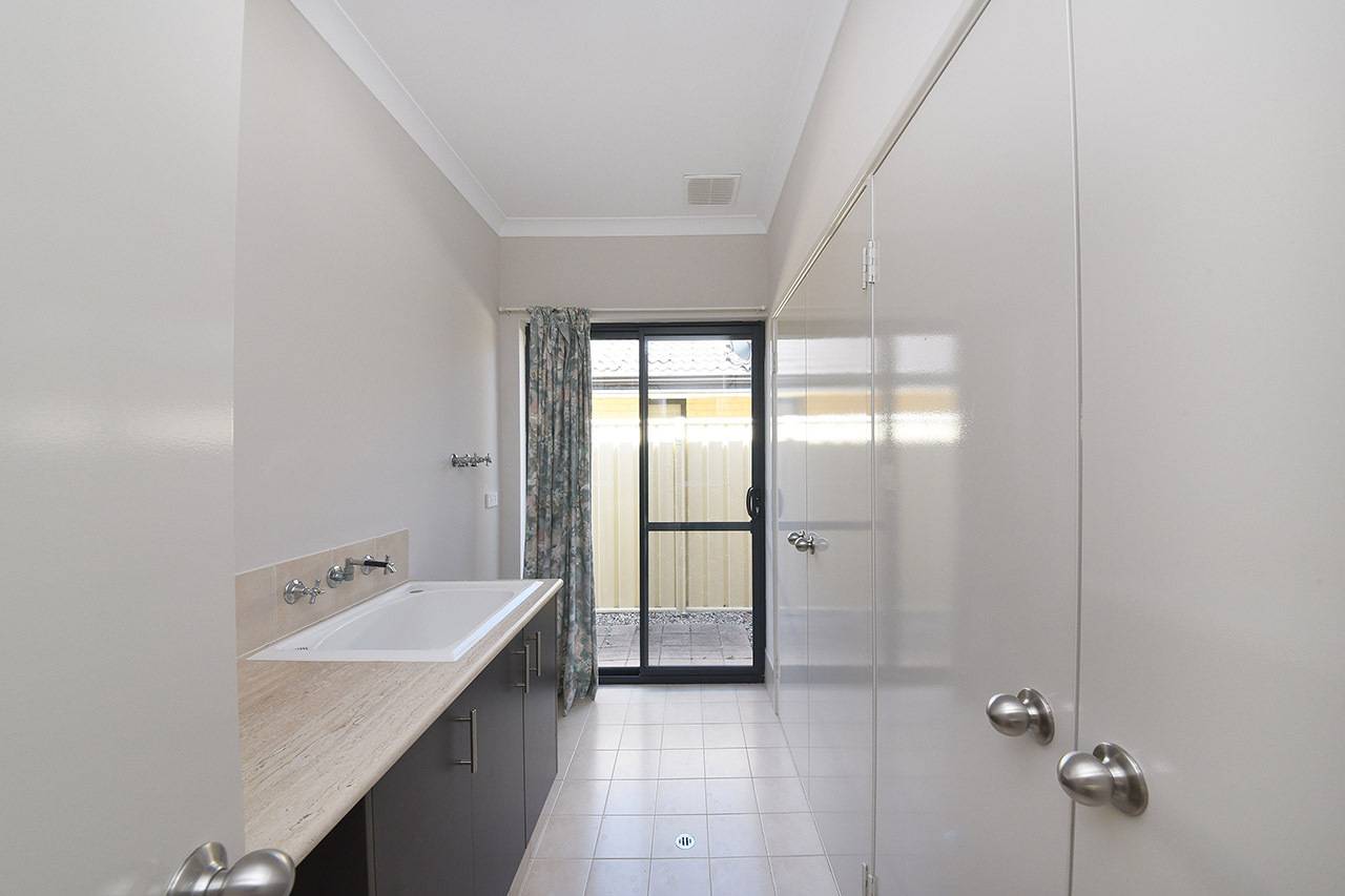 Spacious laundry with inbuilt bench and cupboards plus 4 door wall storage cupboards