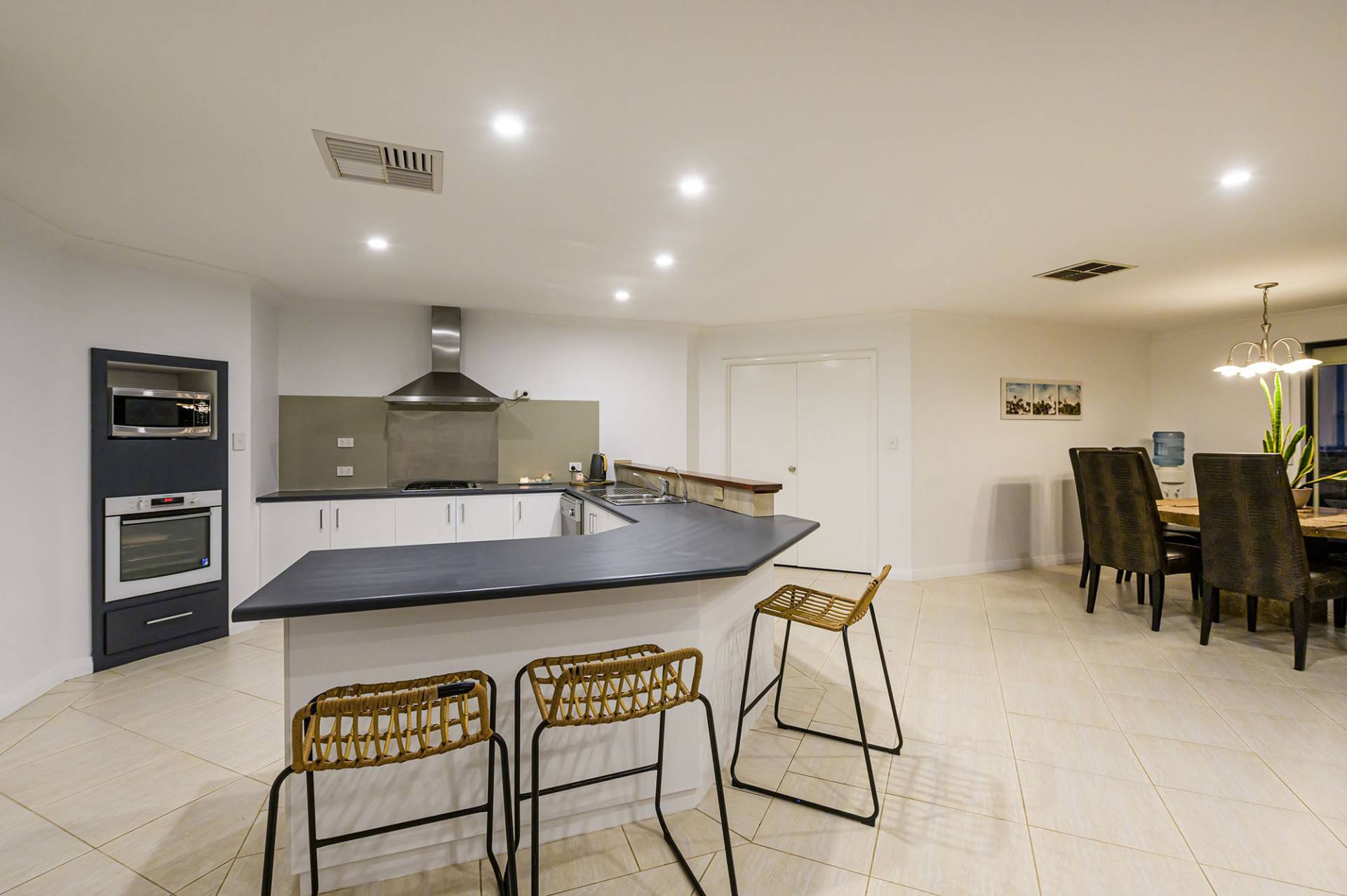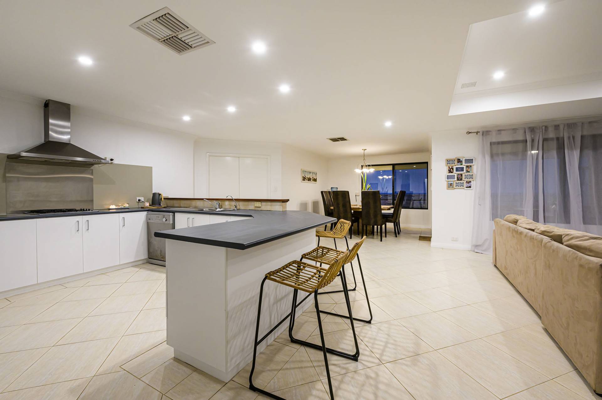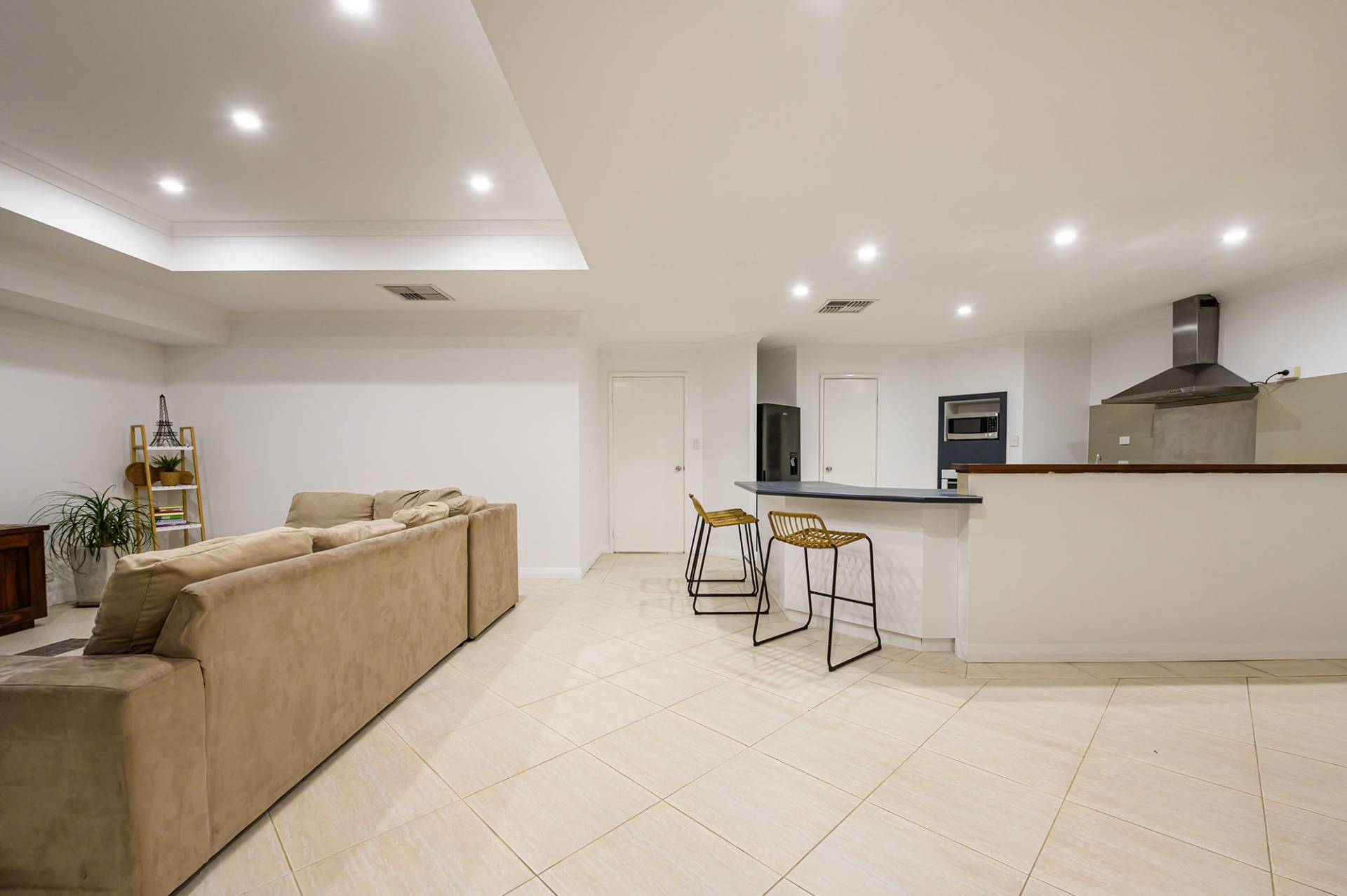 The open plan living area is welcoming and creates an inviting space for family time, featuring downlights and a neutral décor scheme. Generous in size, the freshly revamped kitchen provides plenty of bench space, cupboards and stainless-steel appliances.