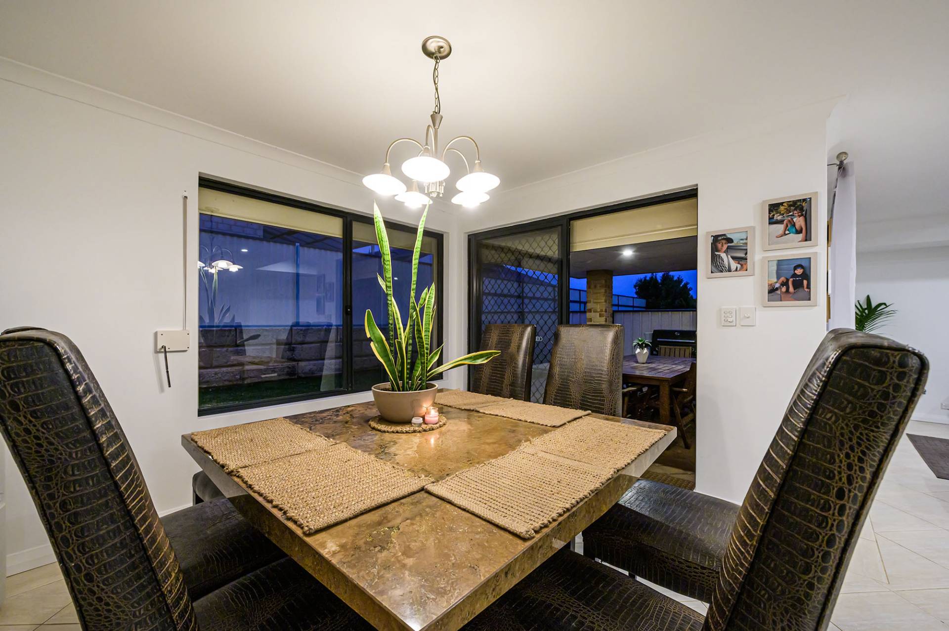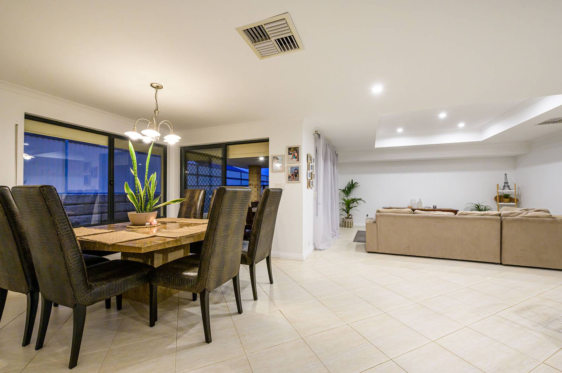 The dining room easily accommodates a large table and has a double sliding door which leads out to the paved alfresco area. The outdoor area is perfect for entertaining all year round featuring beautiful low maintenance reticulated gardens.