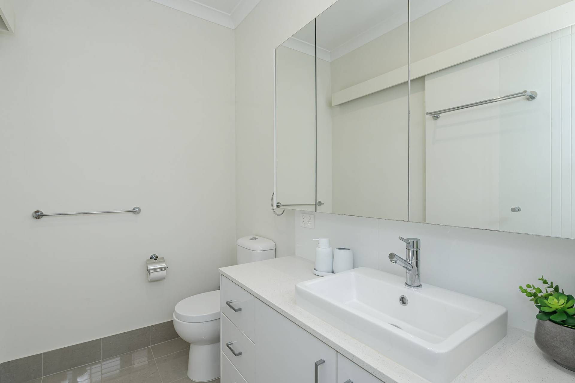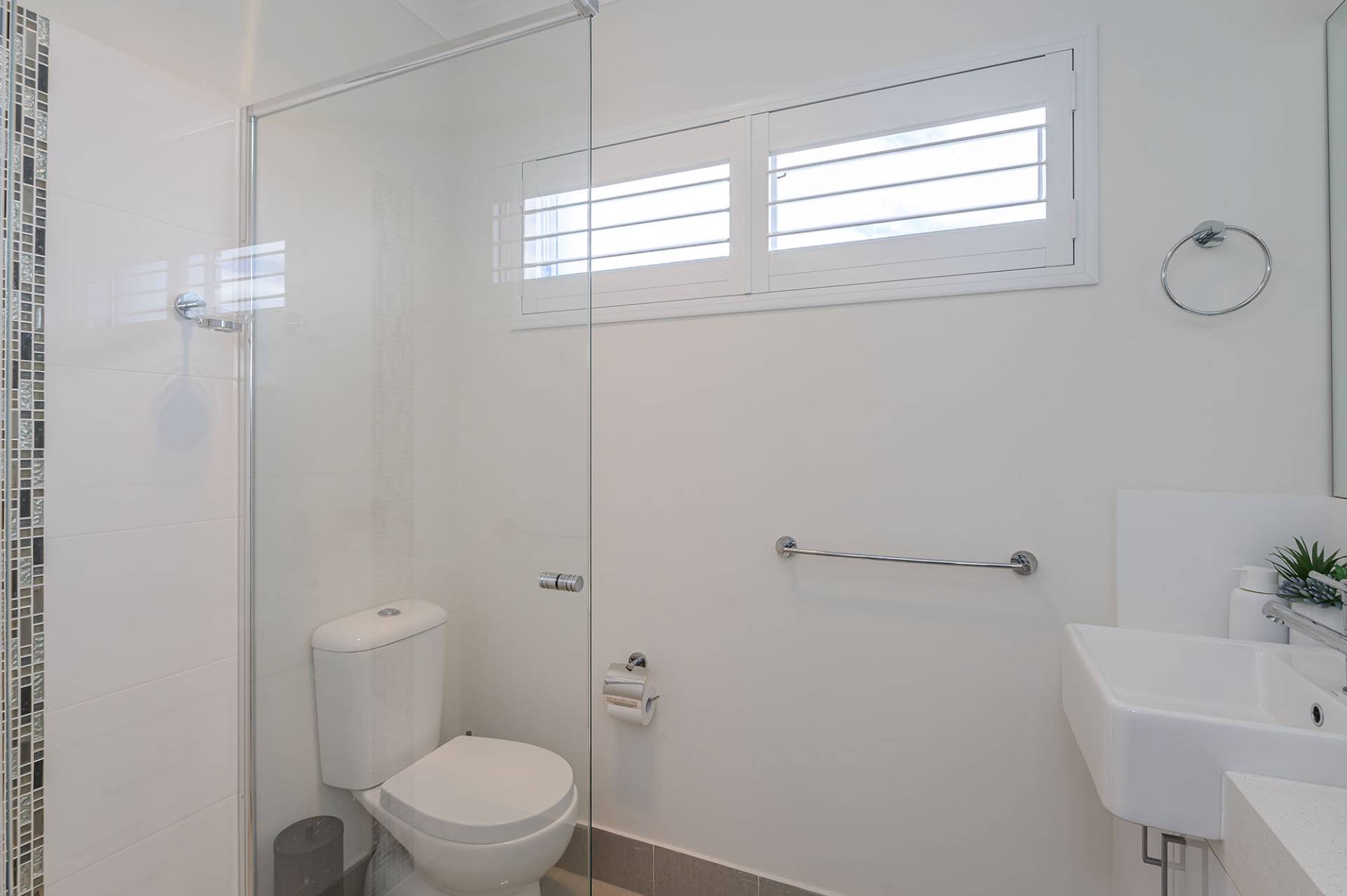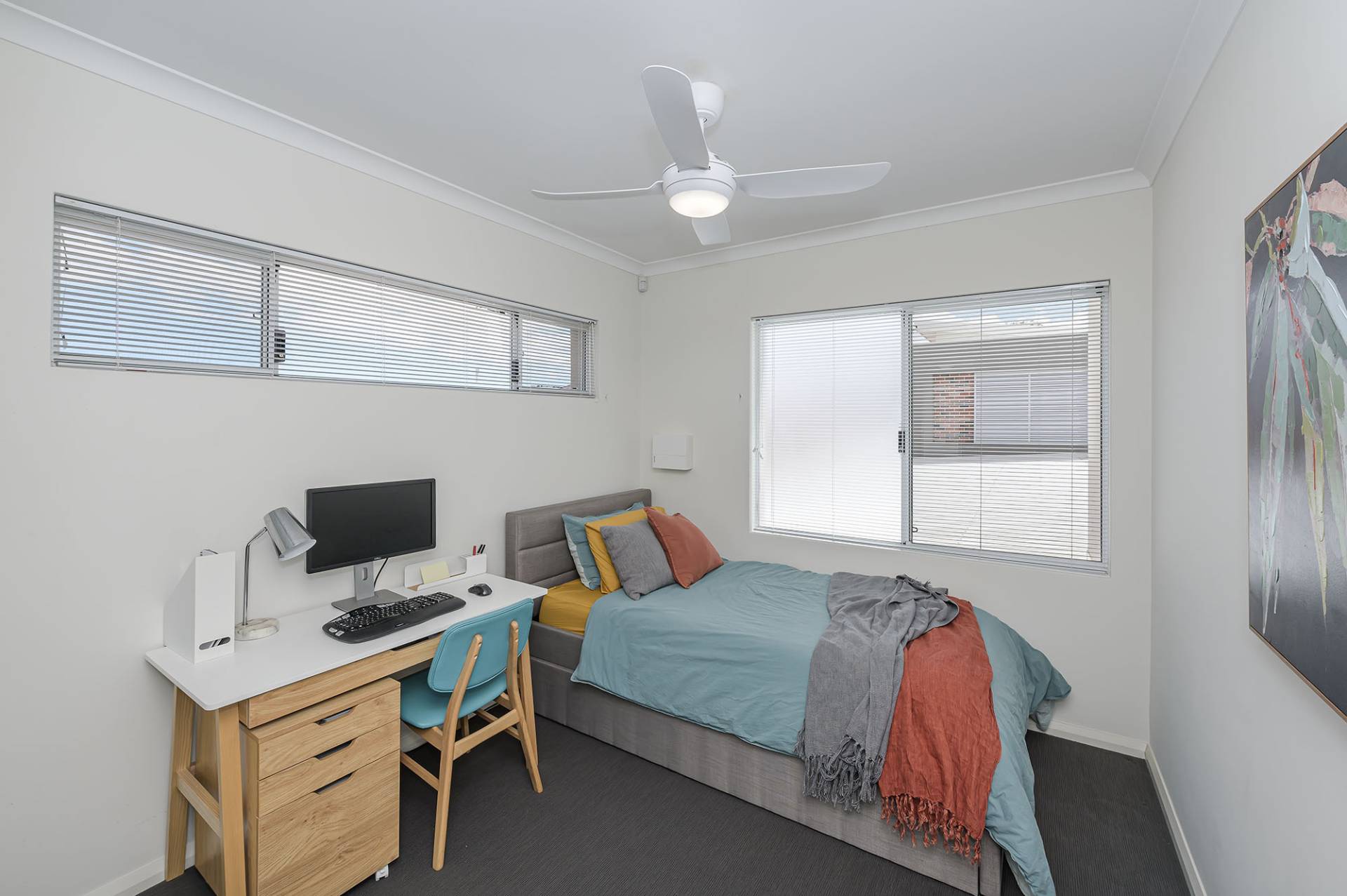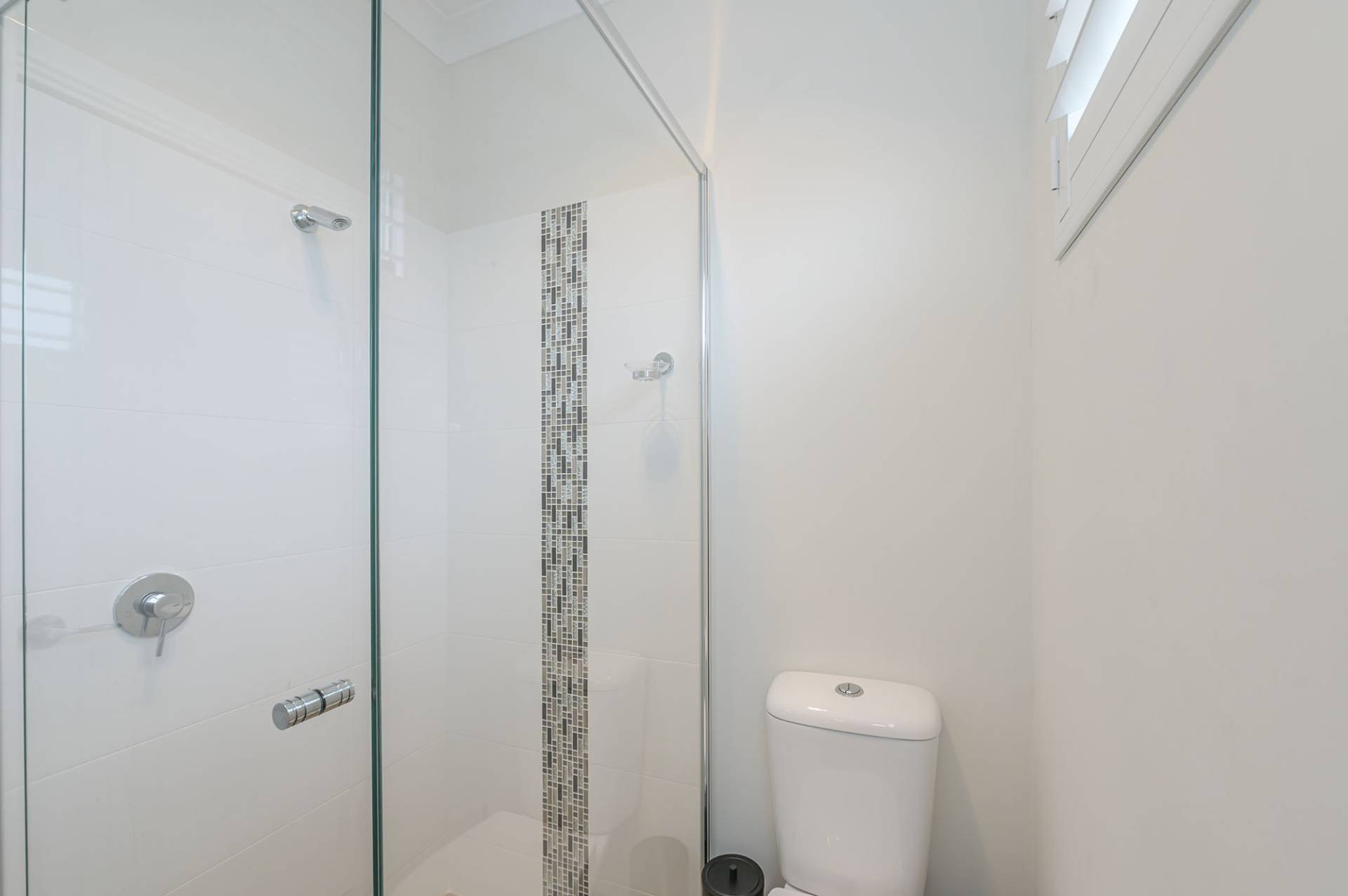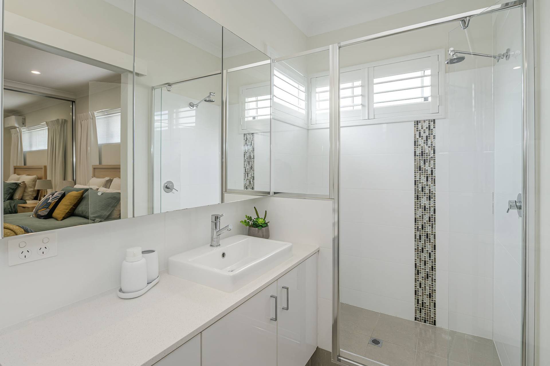 The air-conditioned main bedroom boasts an ensuite with a large shower, mirrored overhead cupboards, stone-topped vanity and smart plantation shutters. The good-sized secondary bedroom has a ceiling fan and mirrored sliding robes, and utilises a separate bathroom with shower, vanity, WC and plantation shutters on a highlight window.