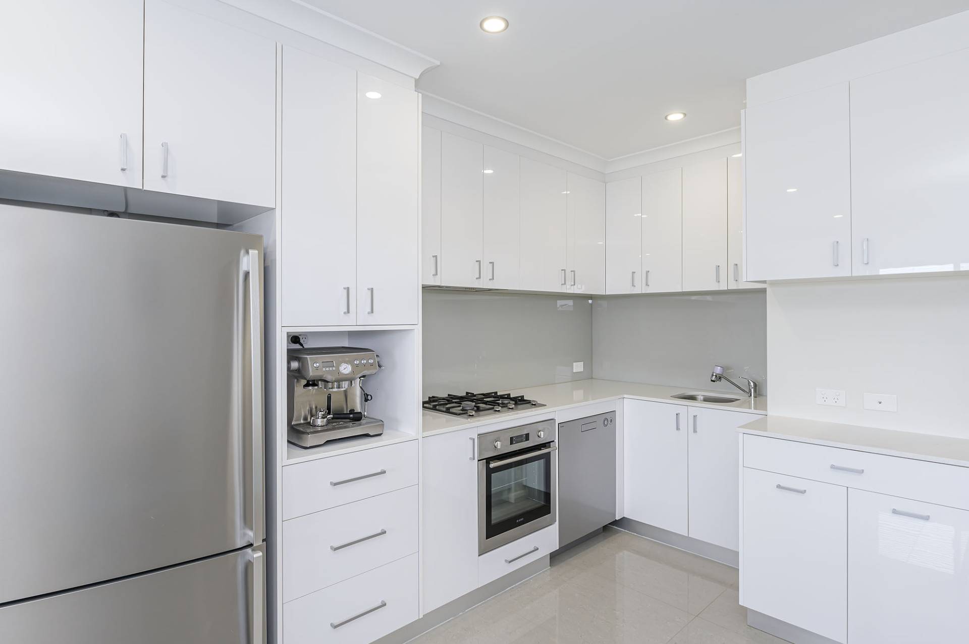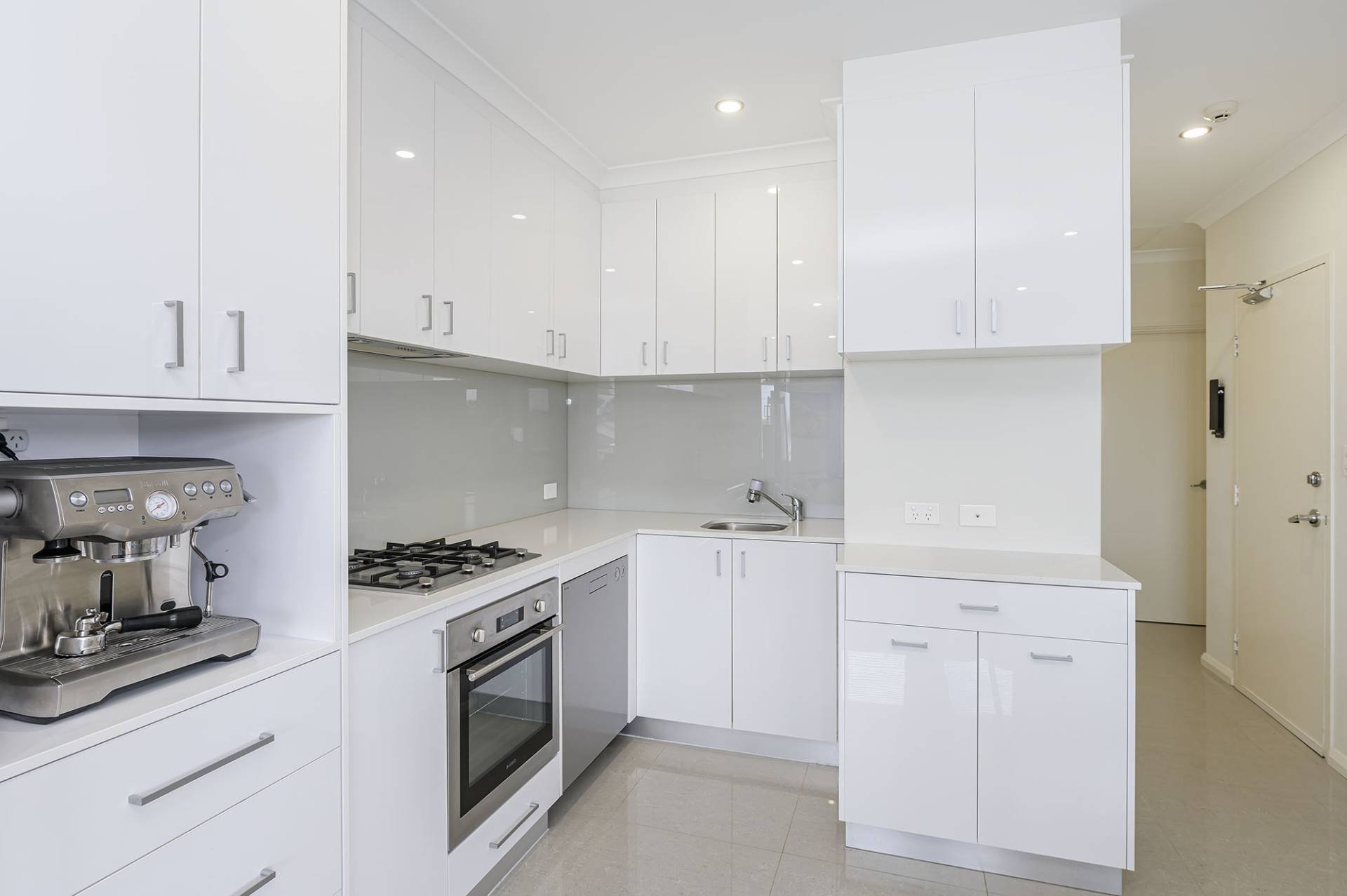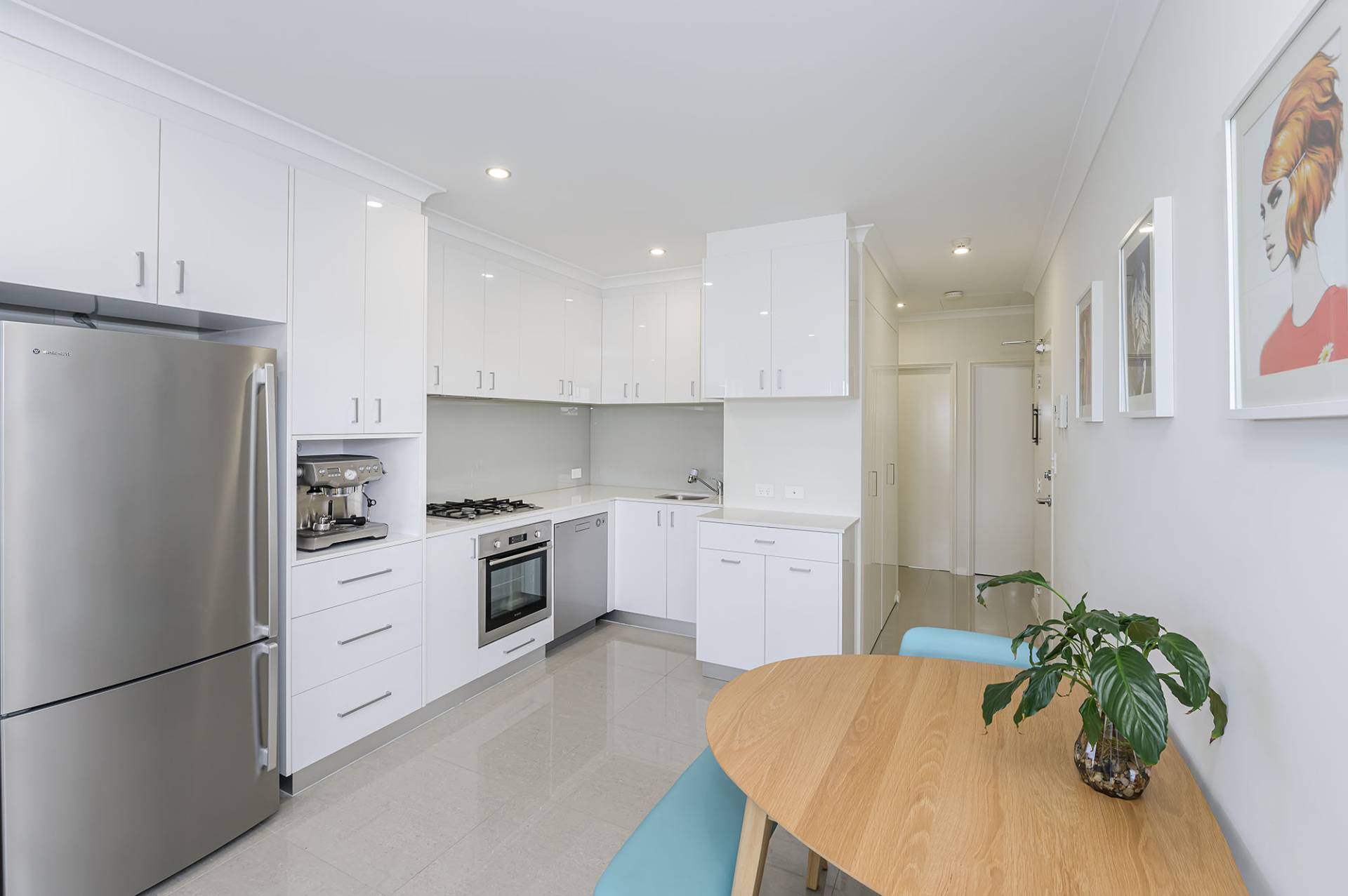 After buzzing yourself in via the electric security gate with intercom, enter into a sunny tiled front living room with sliding door balcony access and wide windows taking in the surrounds. Adjoining is a handy dining space and ultra-modern, open plan kitchen with stone bench tops, gas stove top, ample top and bottom cupboards, microwave recess and glass splashback.