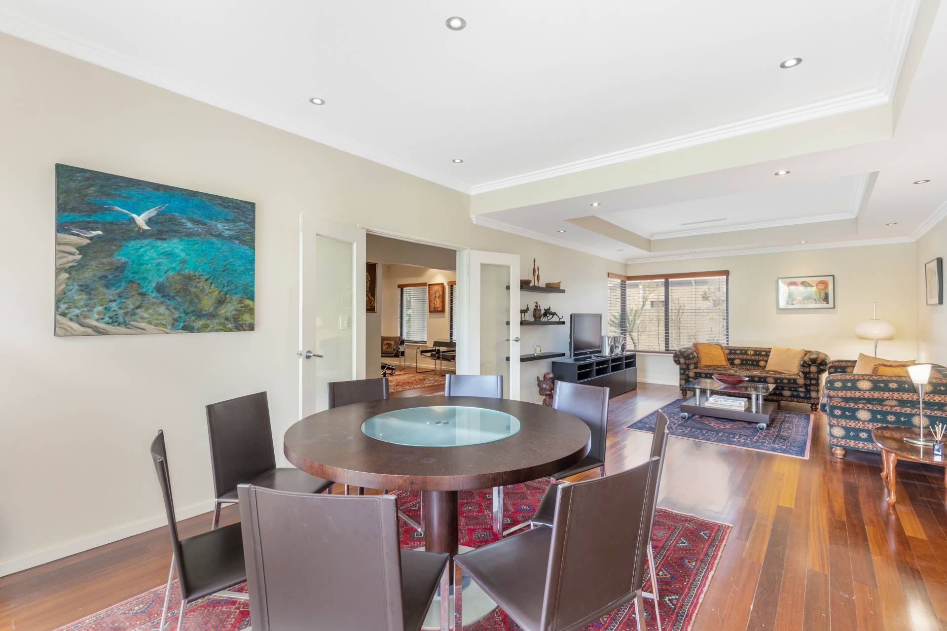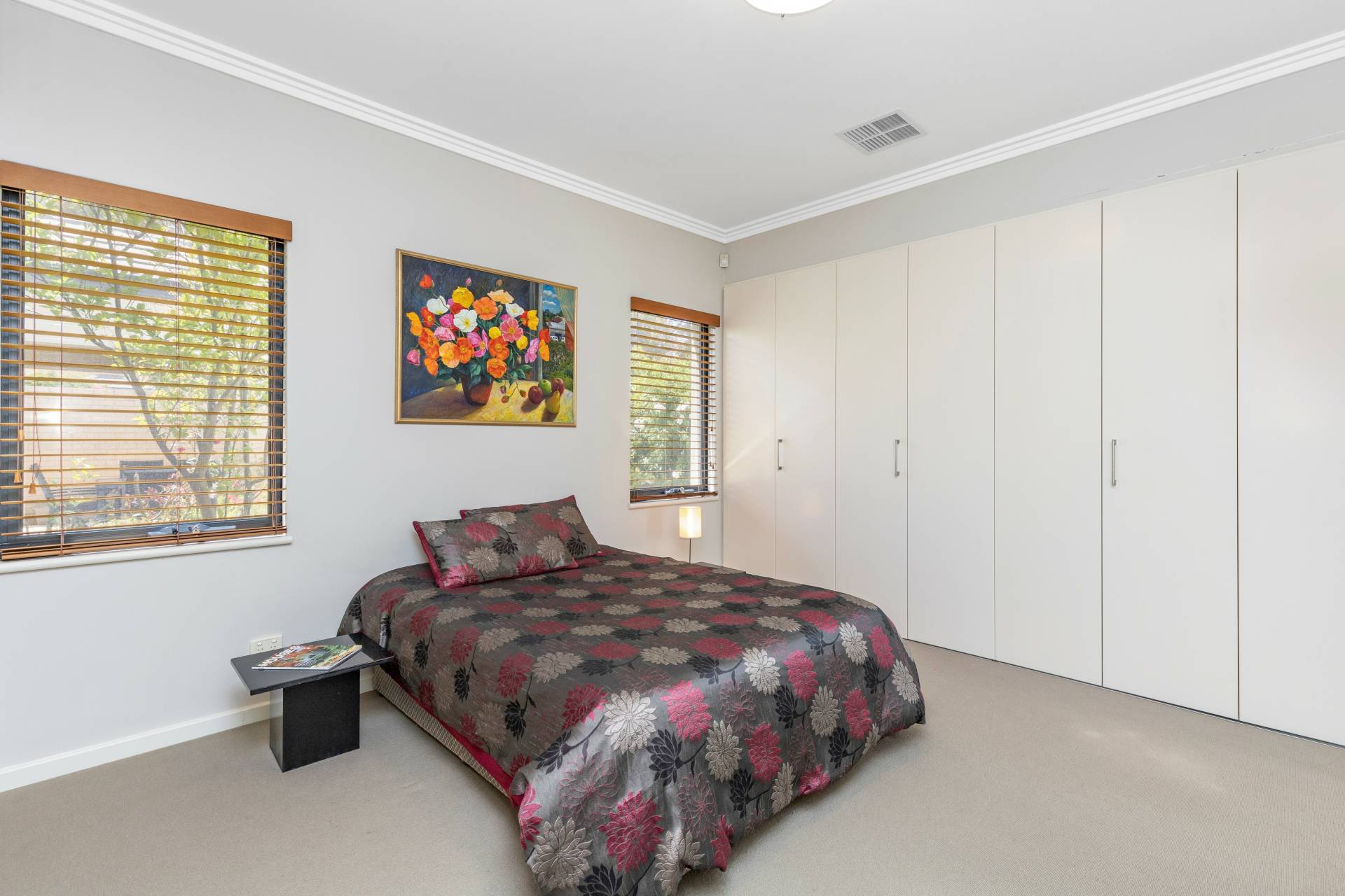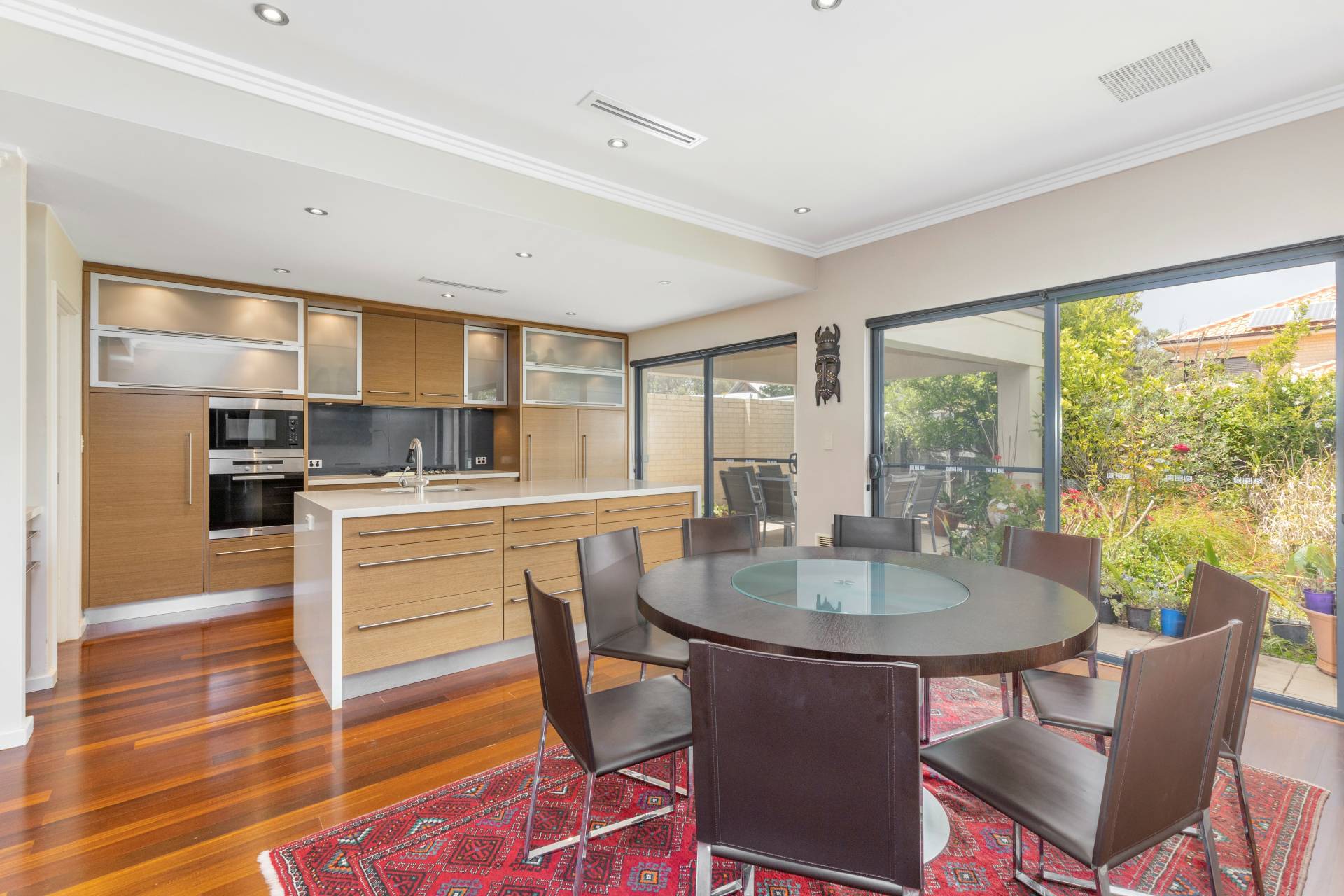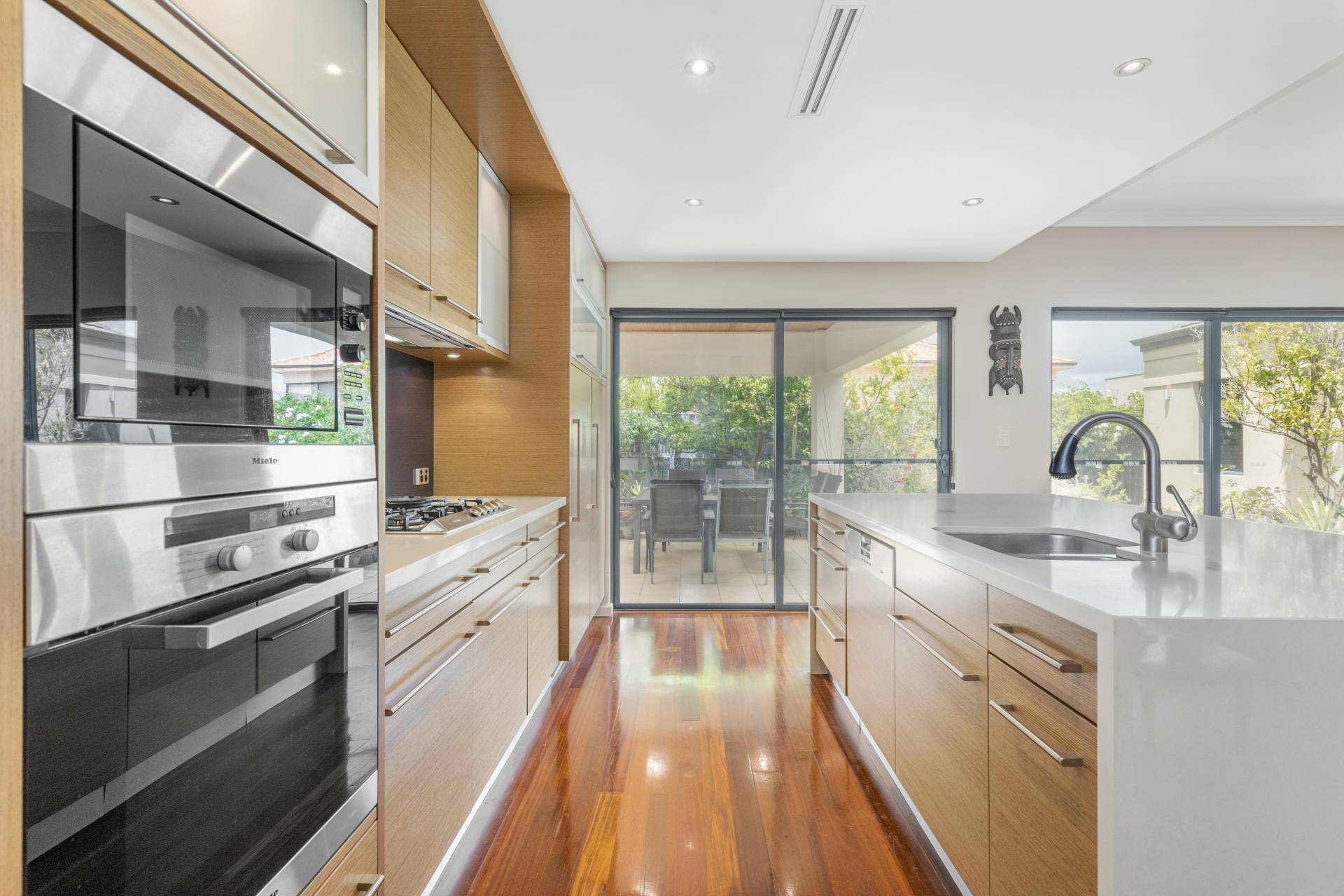 A welcoming entry foyer with gleaming polished jarrah floor boards open onto an open plan living room and the adjoining main family/meals and kitchen. The quality fully fitted kitchen features Miele appliances, stone bench-tops and ample cupboard space. An adjoining laundry is also fitted with ample cupboards. Two sets of sliding doors open onto a private rear alfresco and low maintenance garden. This garden could easily be grassed as a play area for children and dogs if desired.