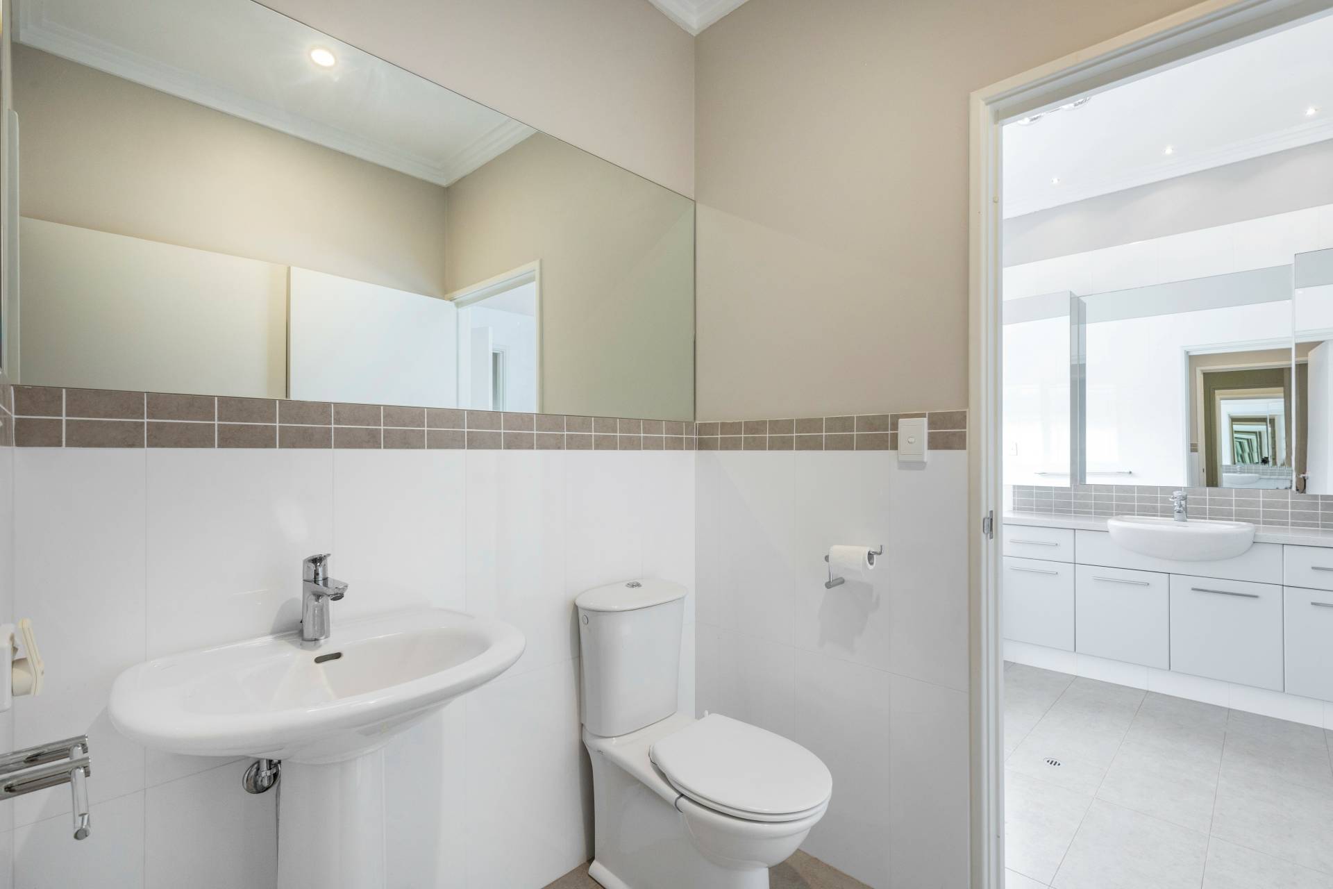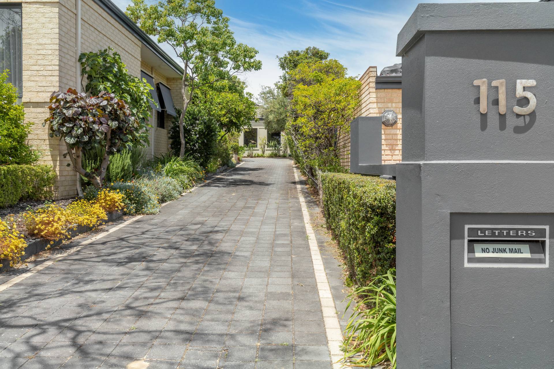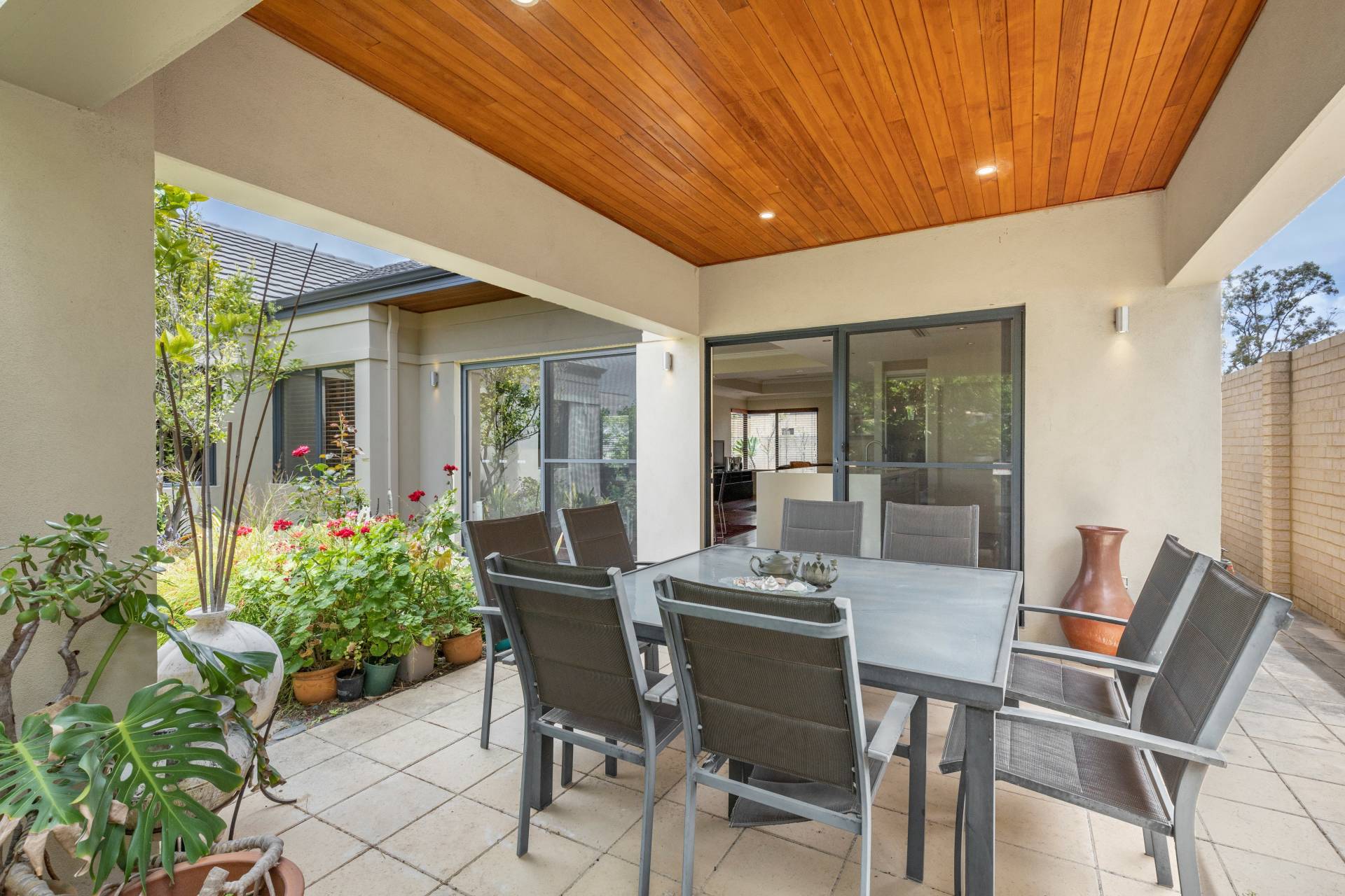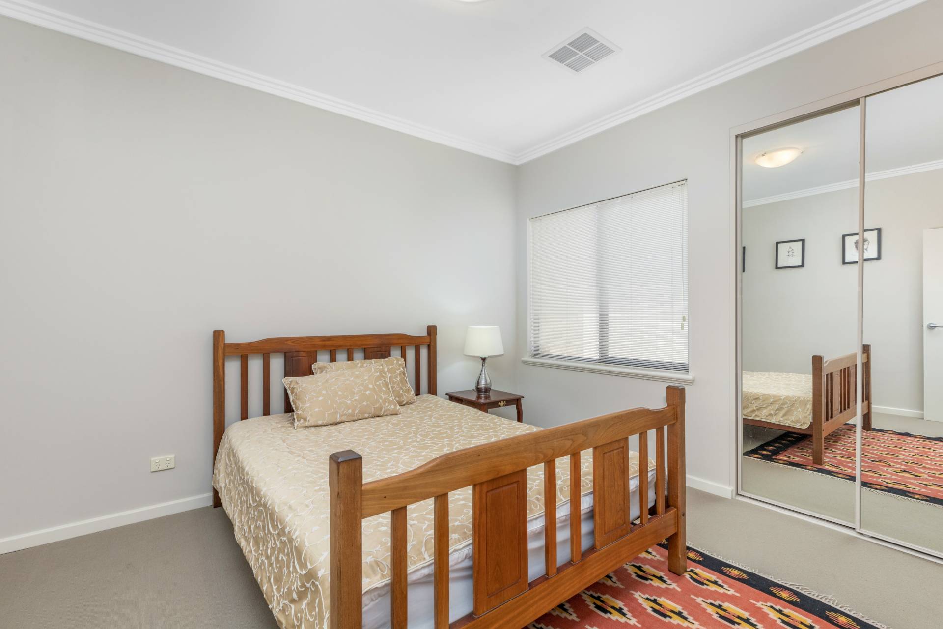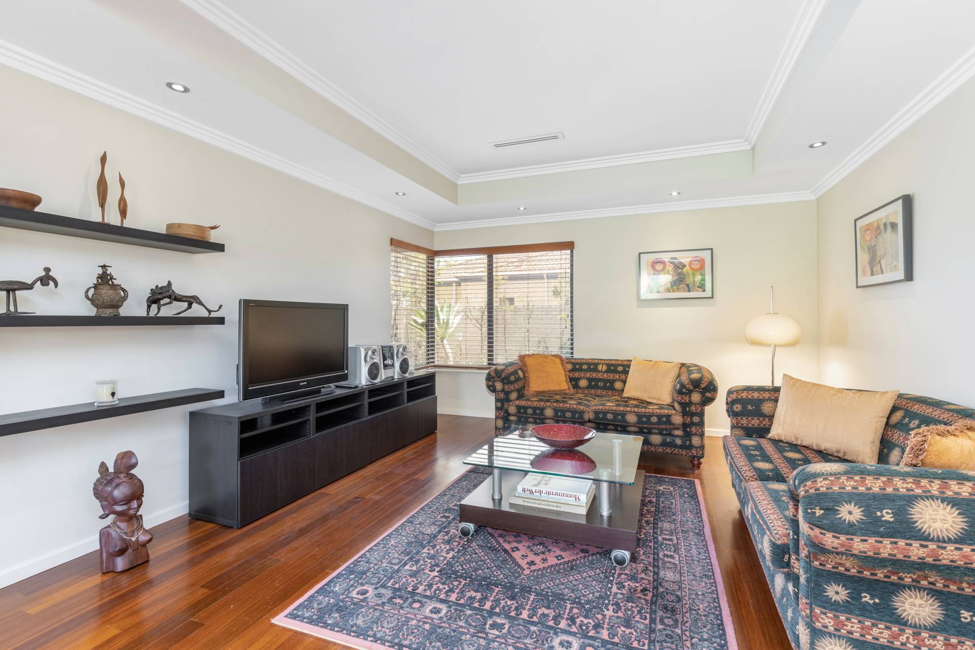 A welcoming entry foyer with gleaming polished jarrah floor boards open onto an open plan living room and the adjoining main family/meals and kitchen. The quality fully fitted kitchen features Miele appliances, stone bench-tops and ample cupboard space. An adjoining laundry is also fitted with ample cupboards. Two sets of sliding doors open onto a private rear alfresco and low maintenance garden. This garden could easily be grassed as a play area for children and dogs if desired.