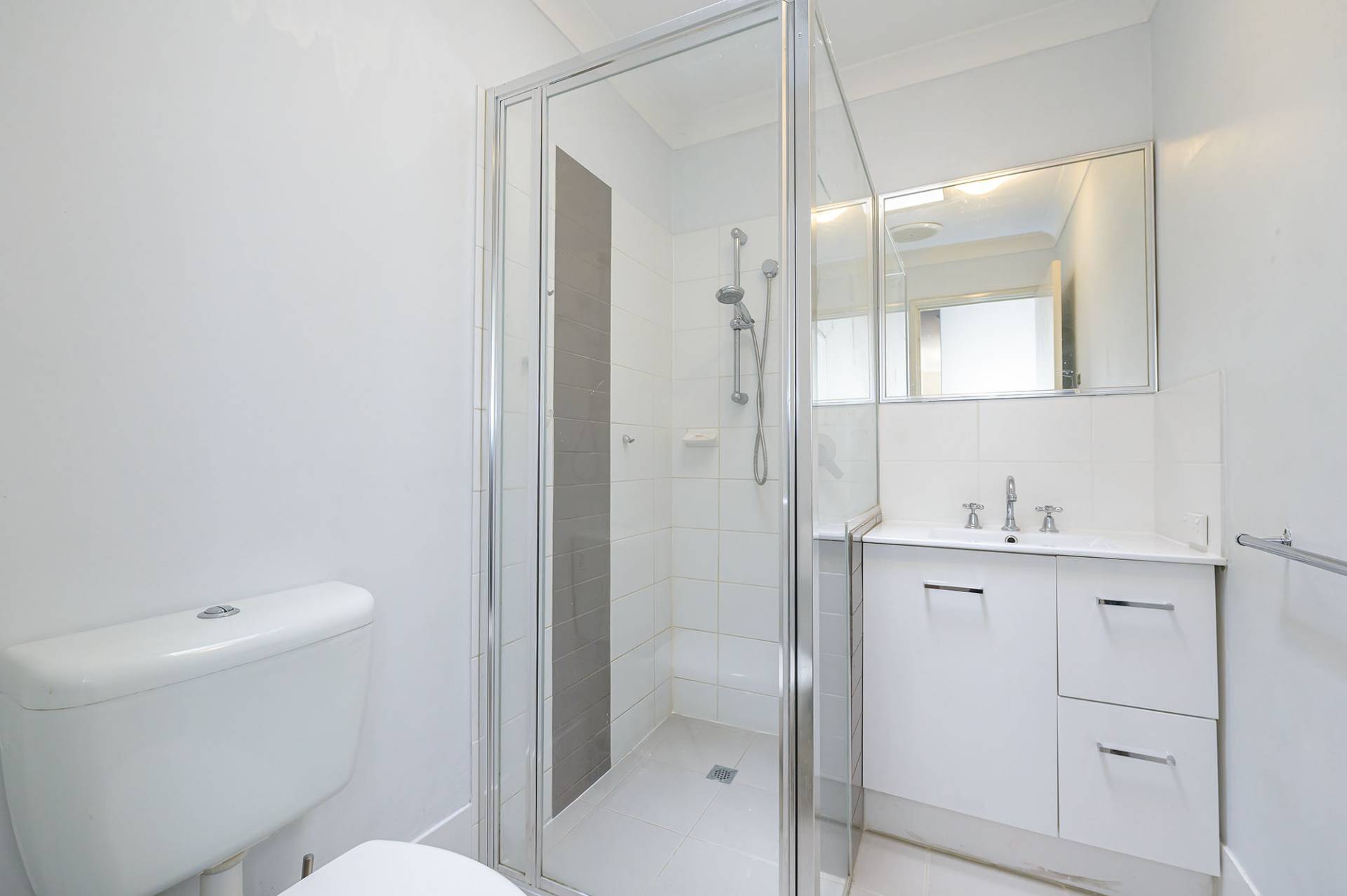 The modern bathroom has been tastefully finished and features a vanity, shower and toilet.