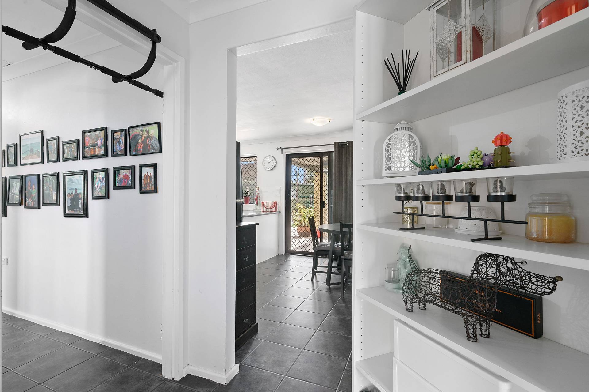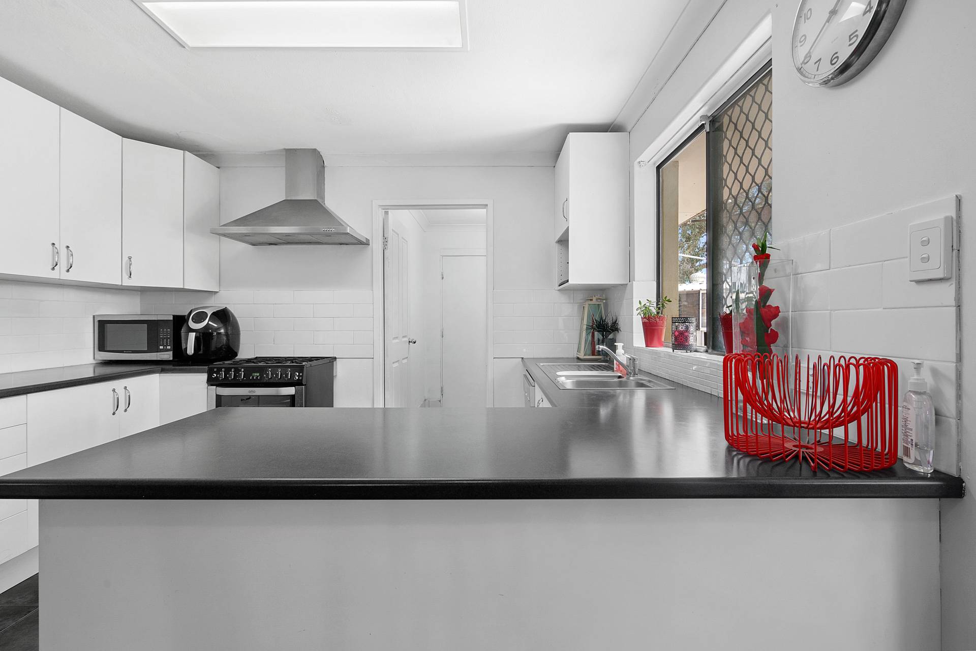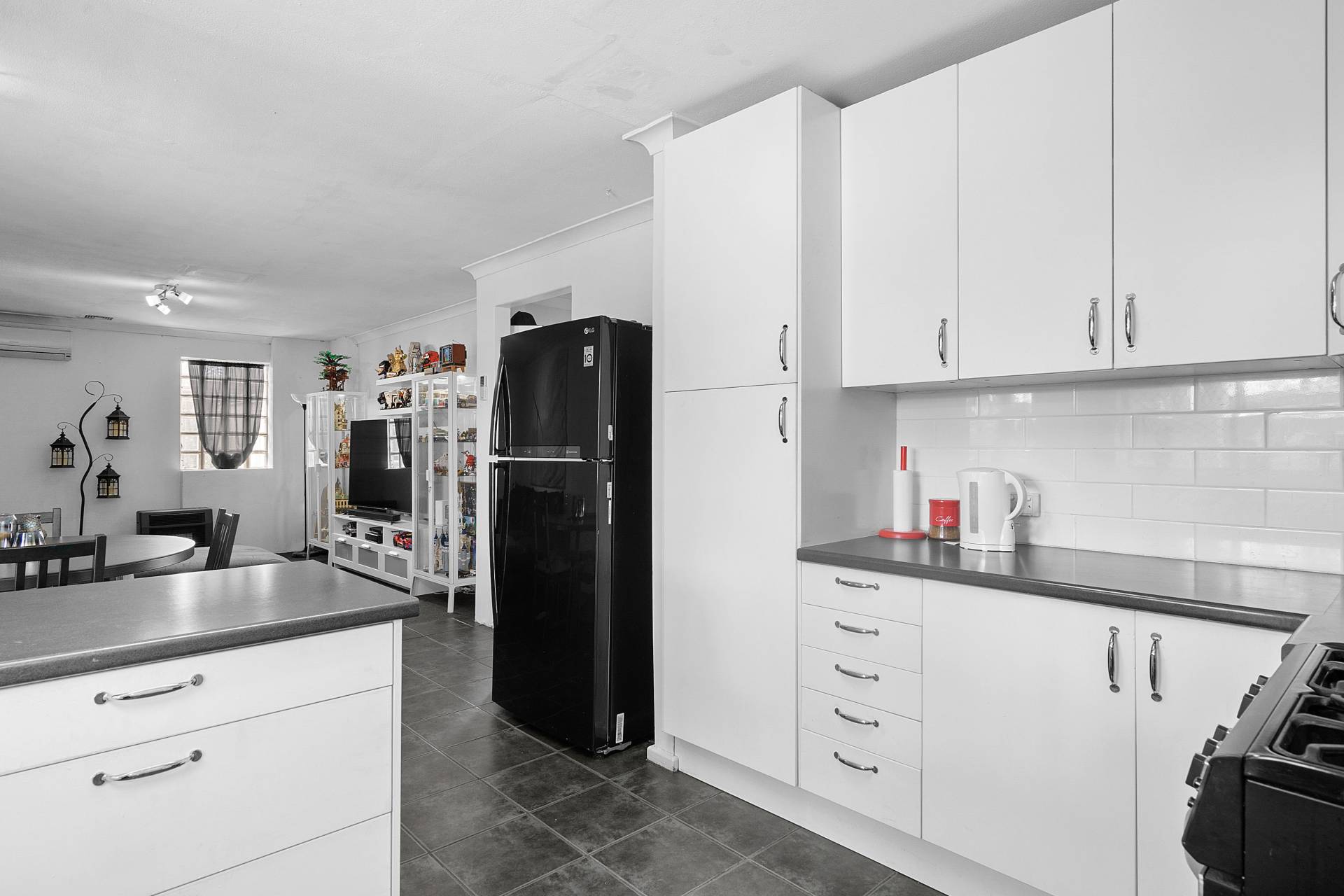 • Open kitchen space with gas cooking and overhead storage