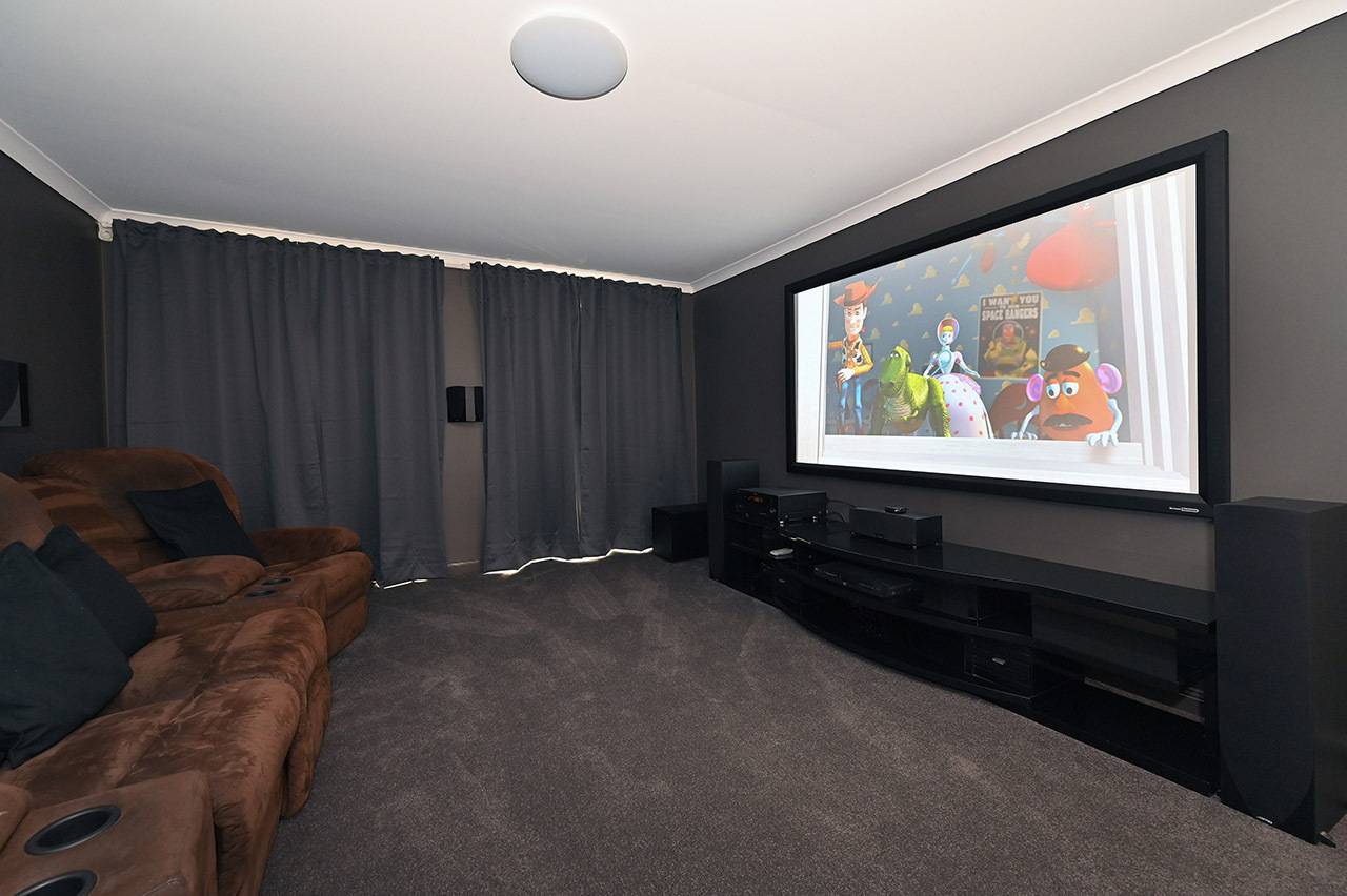 The living spaces include a carpeted home theatre complete with blackout blinds, projector and screen, and a sound system.