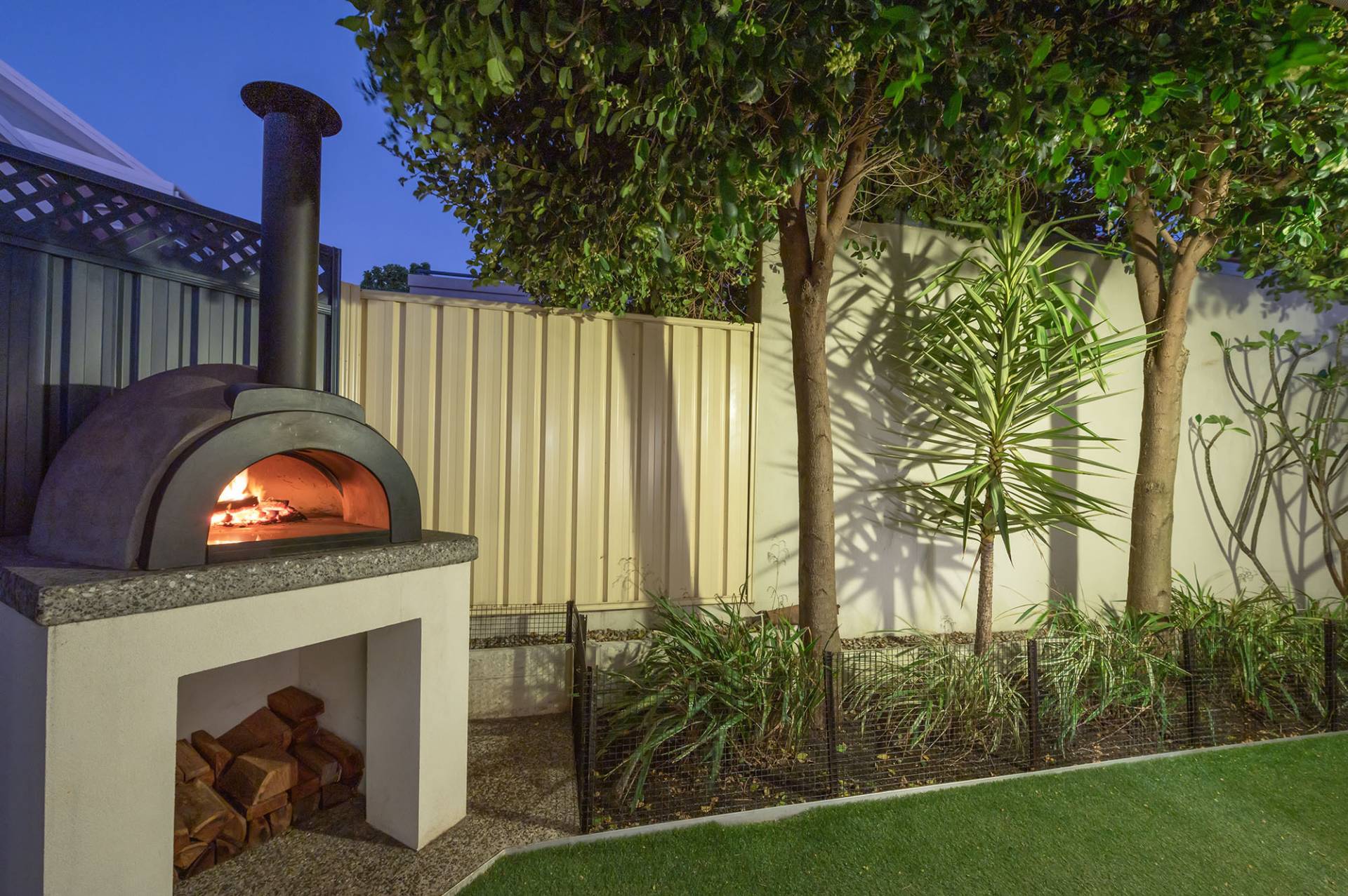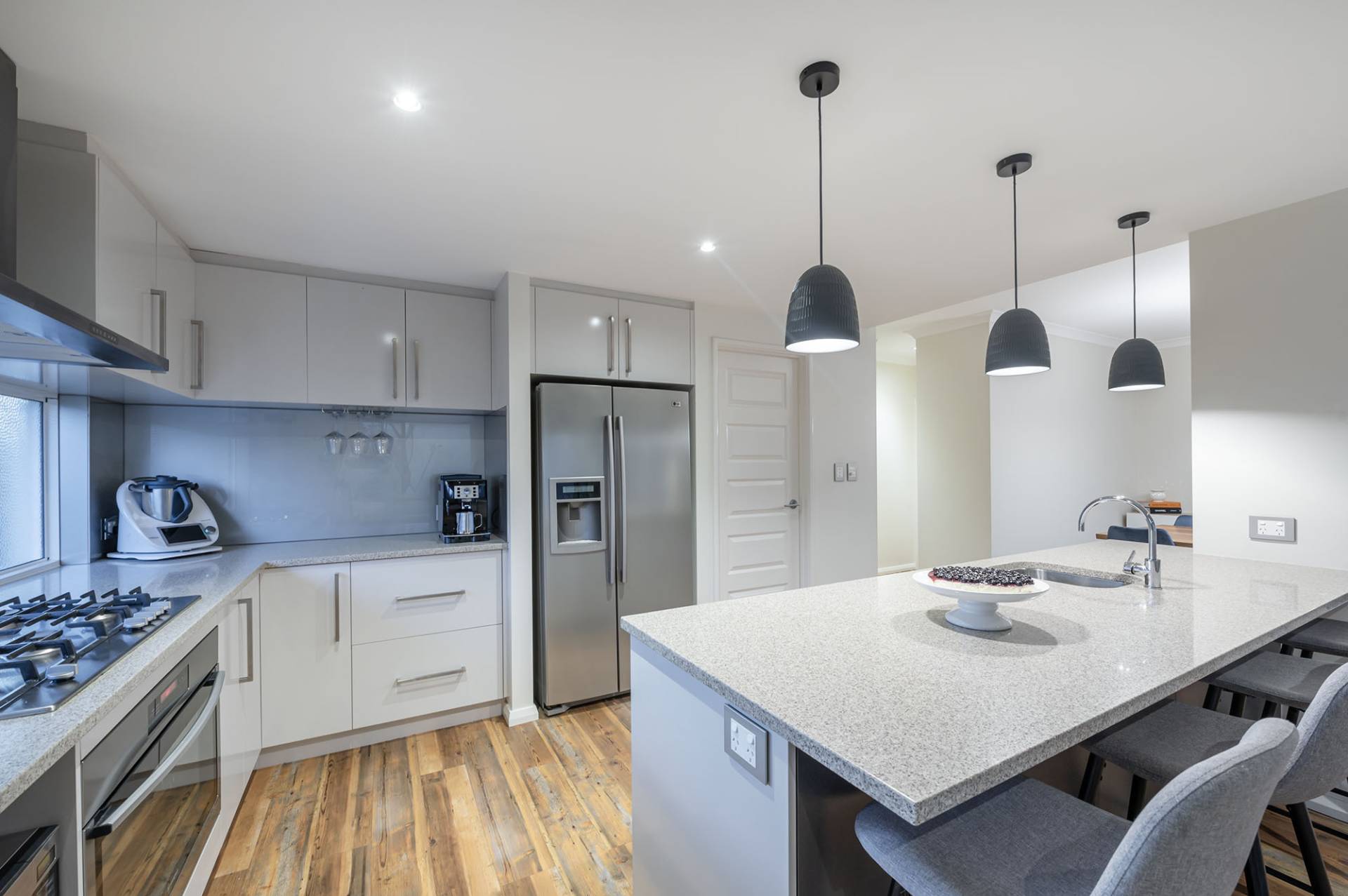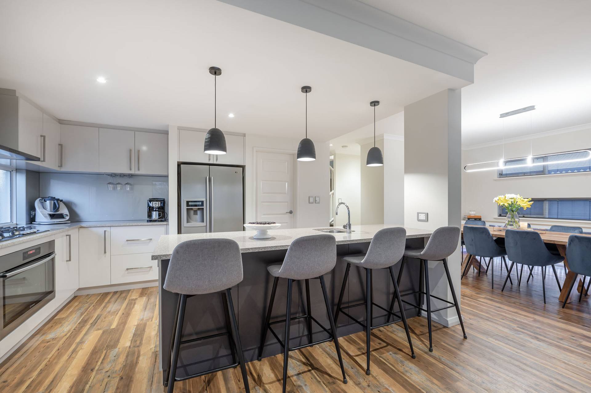A large entry foyer escorts you through to the light filled open plan kitchen, living and dining area with feature ceilings, lavish light fittings, built in floating cabinetry and LED lighting. The stunning chef’s kitchen is equipped with all the latest appliances featuring stunning Caeserstone bench tops, Westinghouse 900mm oven and gas hotplates, water plumbing for fridge, walk-in pantry, Miele dishwasher and ample storage. Adjoining the kitchen, meals and living area is an outdoor area with glass sliding doors that open out to an undercover alfresco entertaining area with woodfire pizza oven and grassed area to incorporate seamless indoor/outdoor living.
