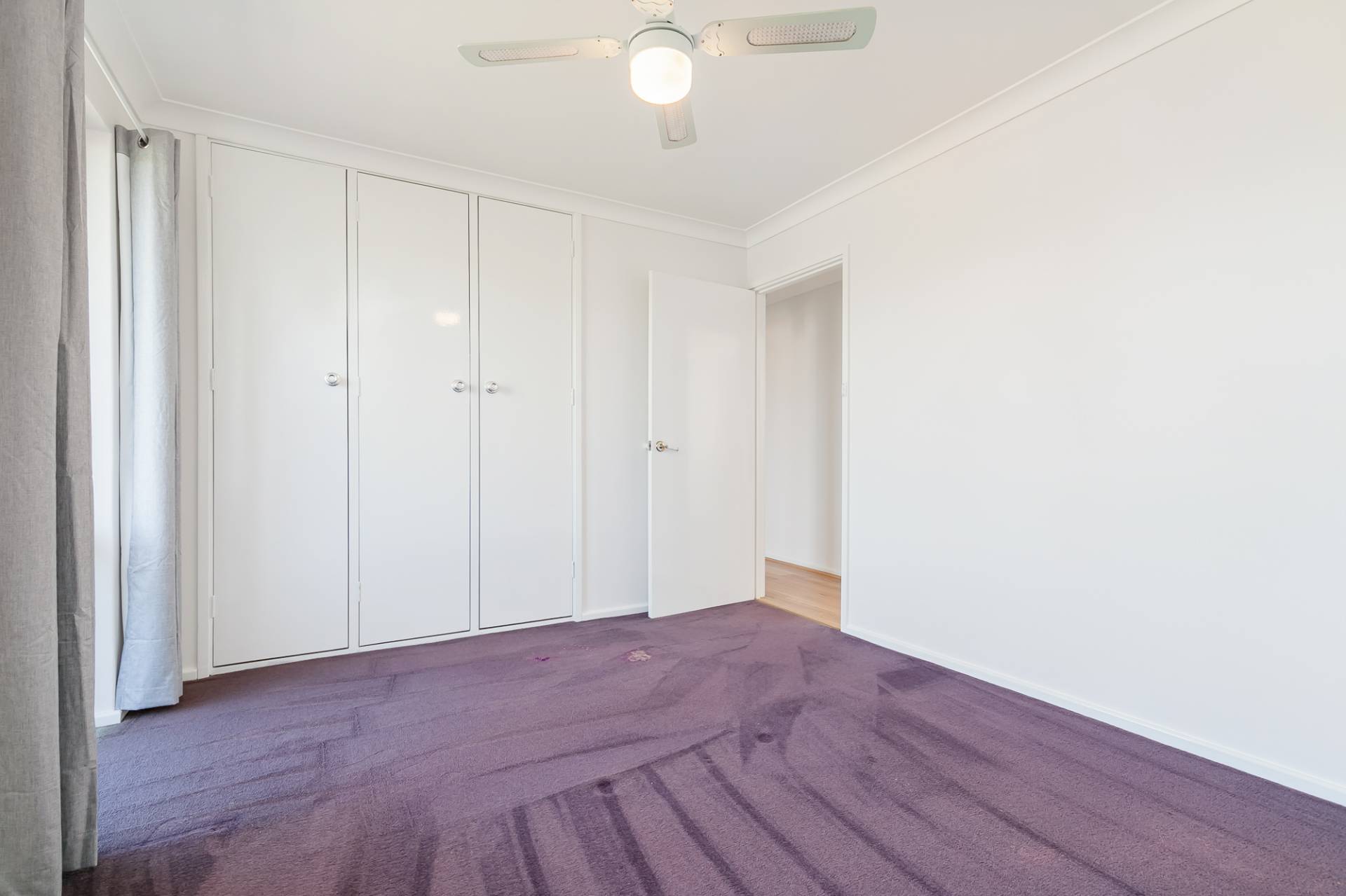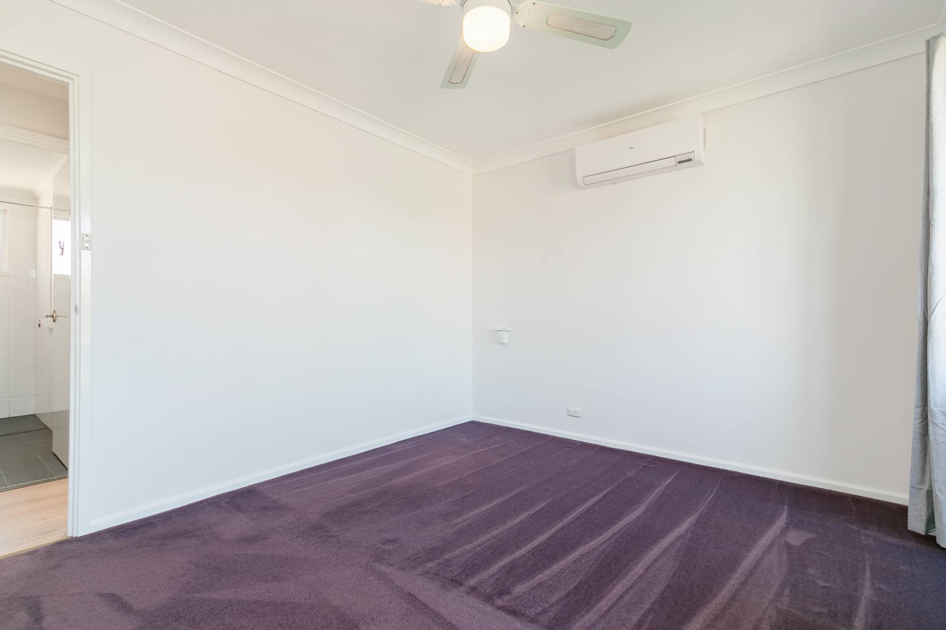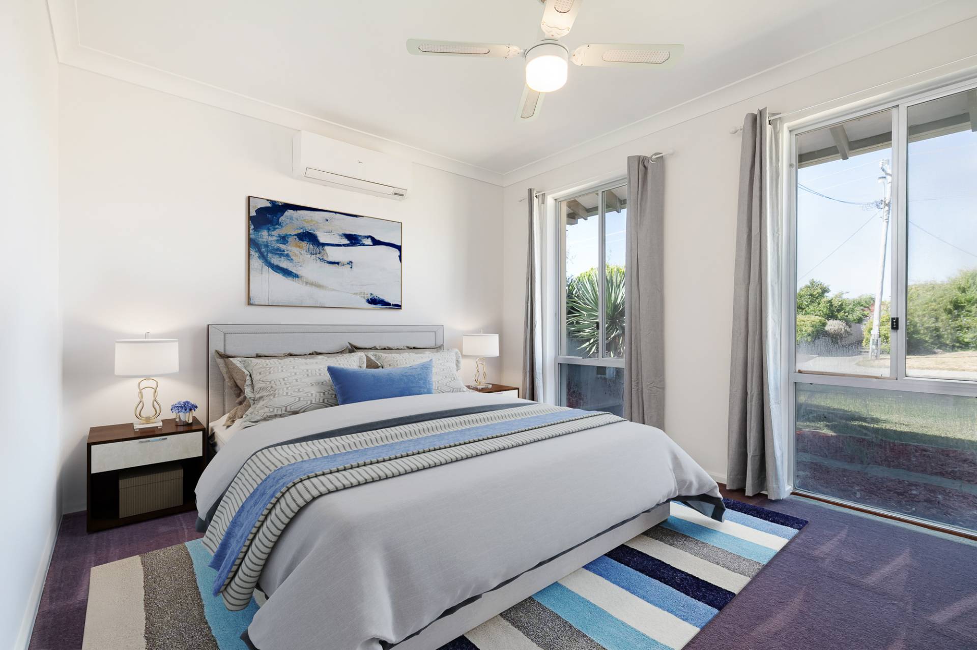 • Master bedroom equipped with floor-to-ceiling windows, built-in robe, ceiling fan, reverse cycle air conditioning