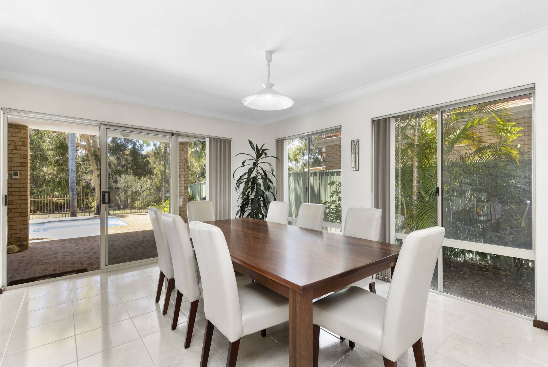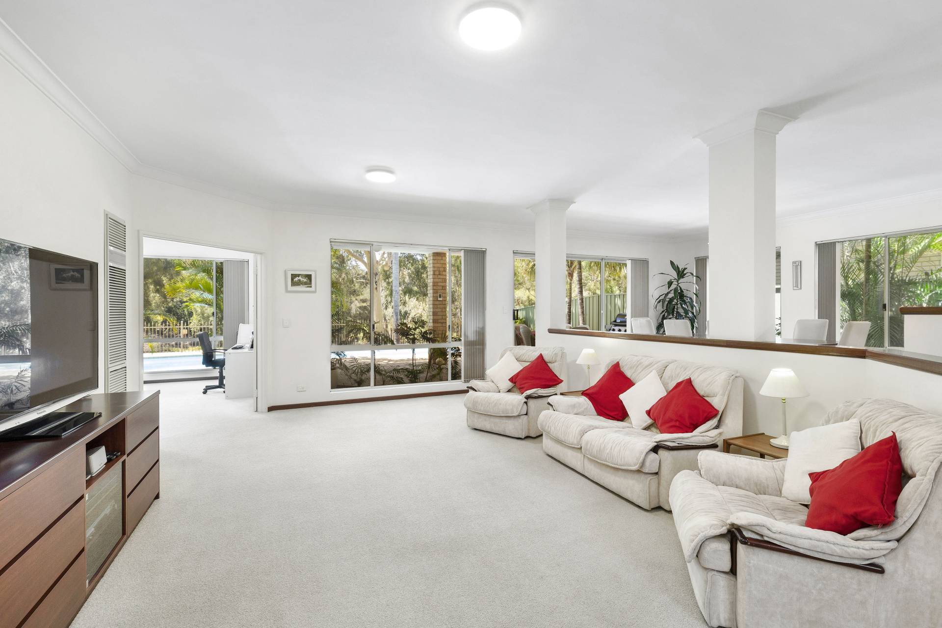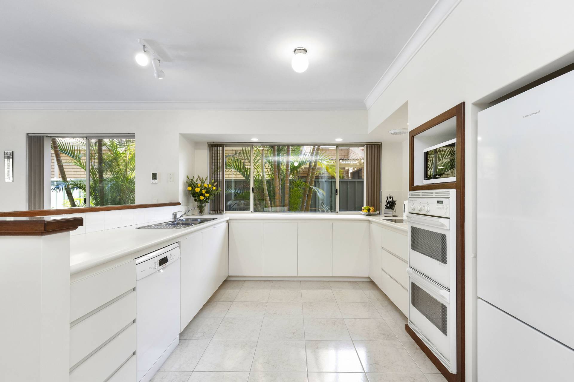 *Fully fitted white kitchen features double wall oven, ceramic electric cook-top, and dishwasher. It overlooks the dining and living area with the pool and parklands beyond