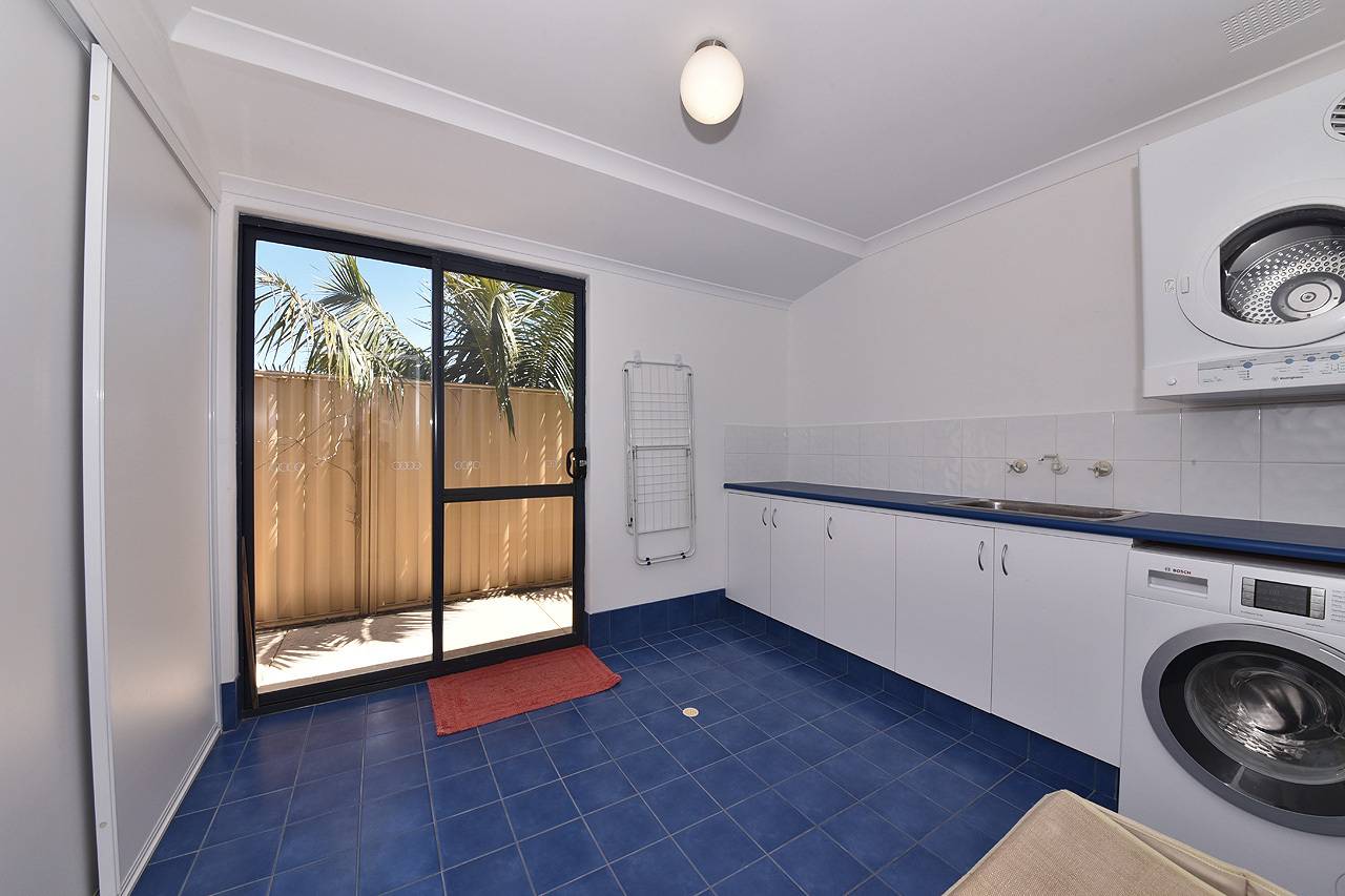 Extra large laundry with inbuilt bench and cupboards and sliding door storage space