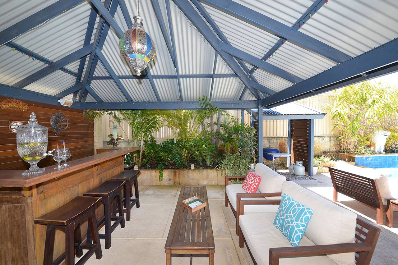 Resort style outdoor alfresco with inbuilt bench, cupboards and fridge recess (fridge included),  and zip lock blinds for all year entertaining,  plus a second pitched patio BBQ area with inbuilt bar