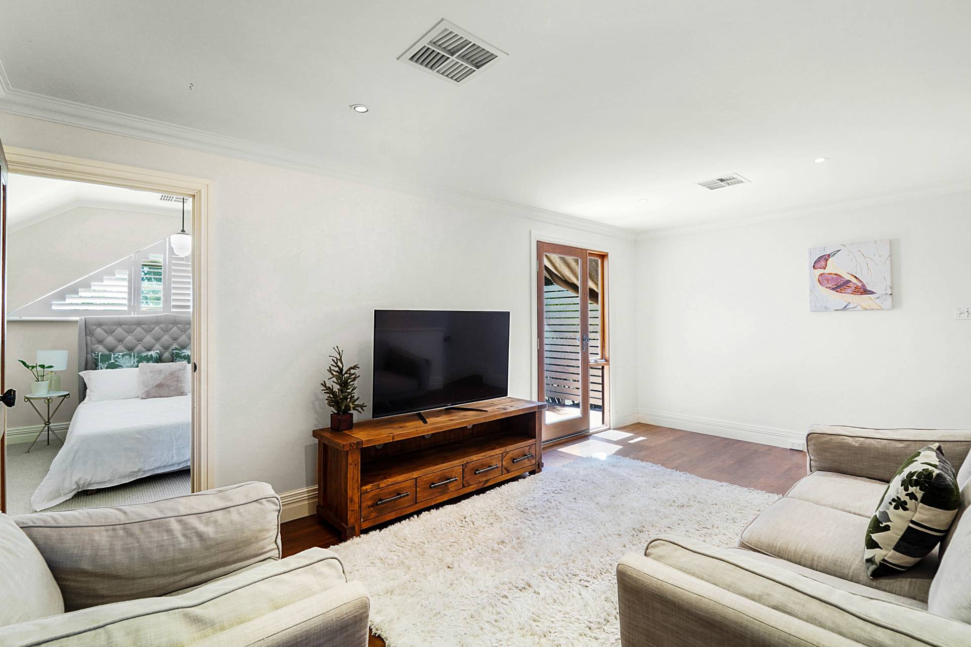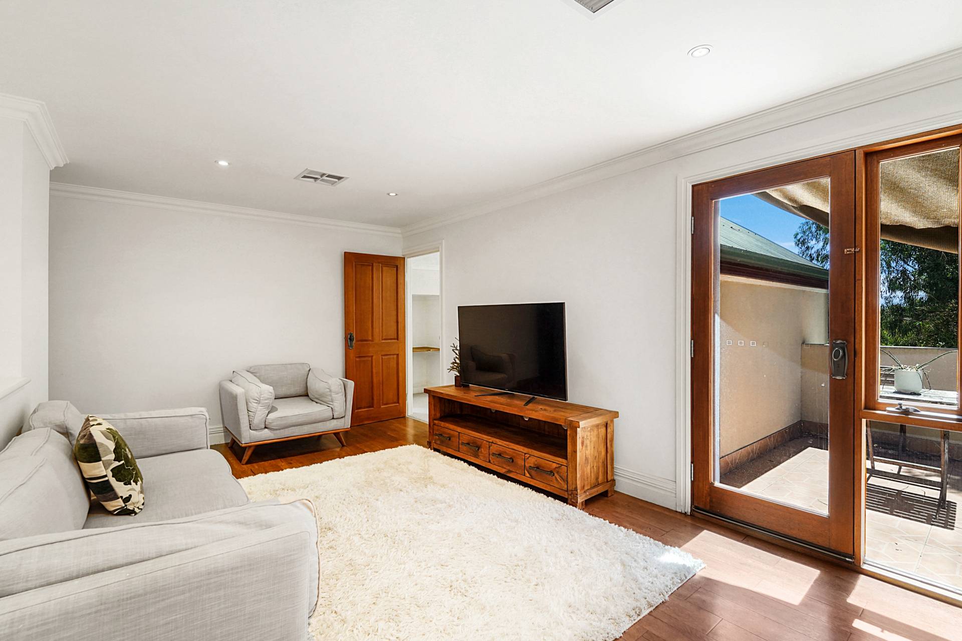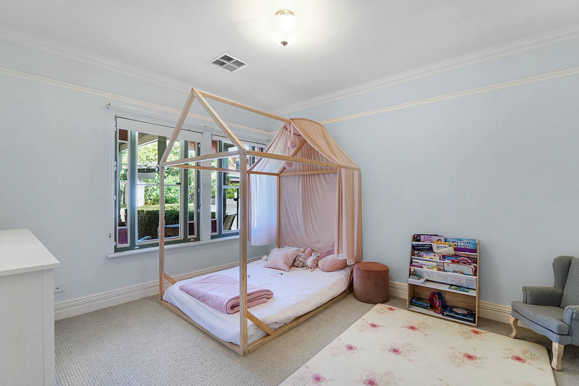 Upstairs, you'll discover a teenager's retreat or additional living area, with a sunny tiled balcony providing leafy tree-top views. Two generous bedrooms with triple built-in robes, vaulted ceilings and white shutters share the large family bathroom, where you'll luxuriate in a freestanding oval bathtub.