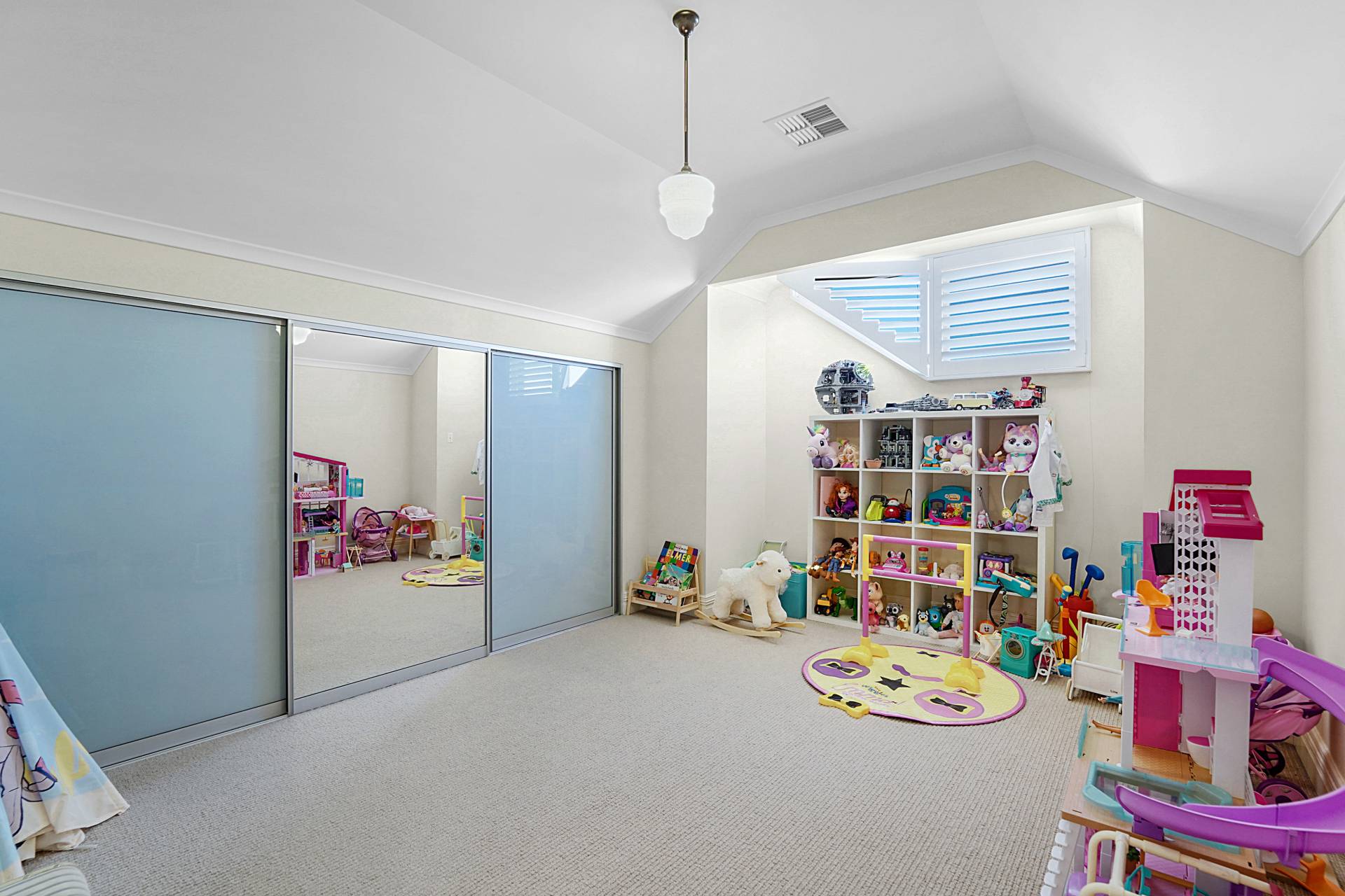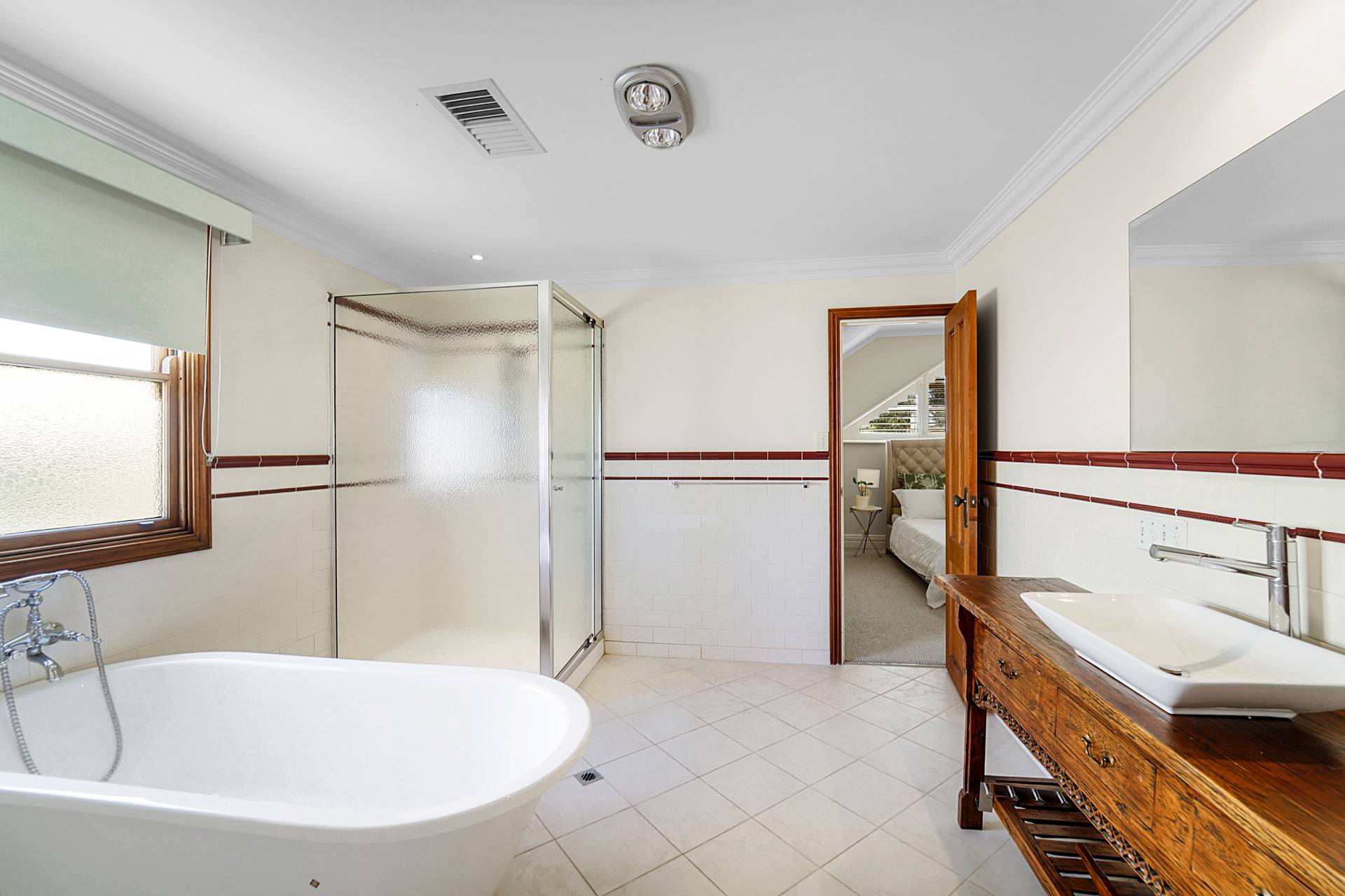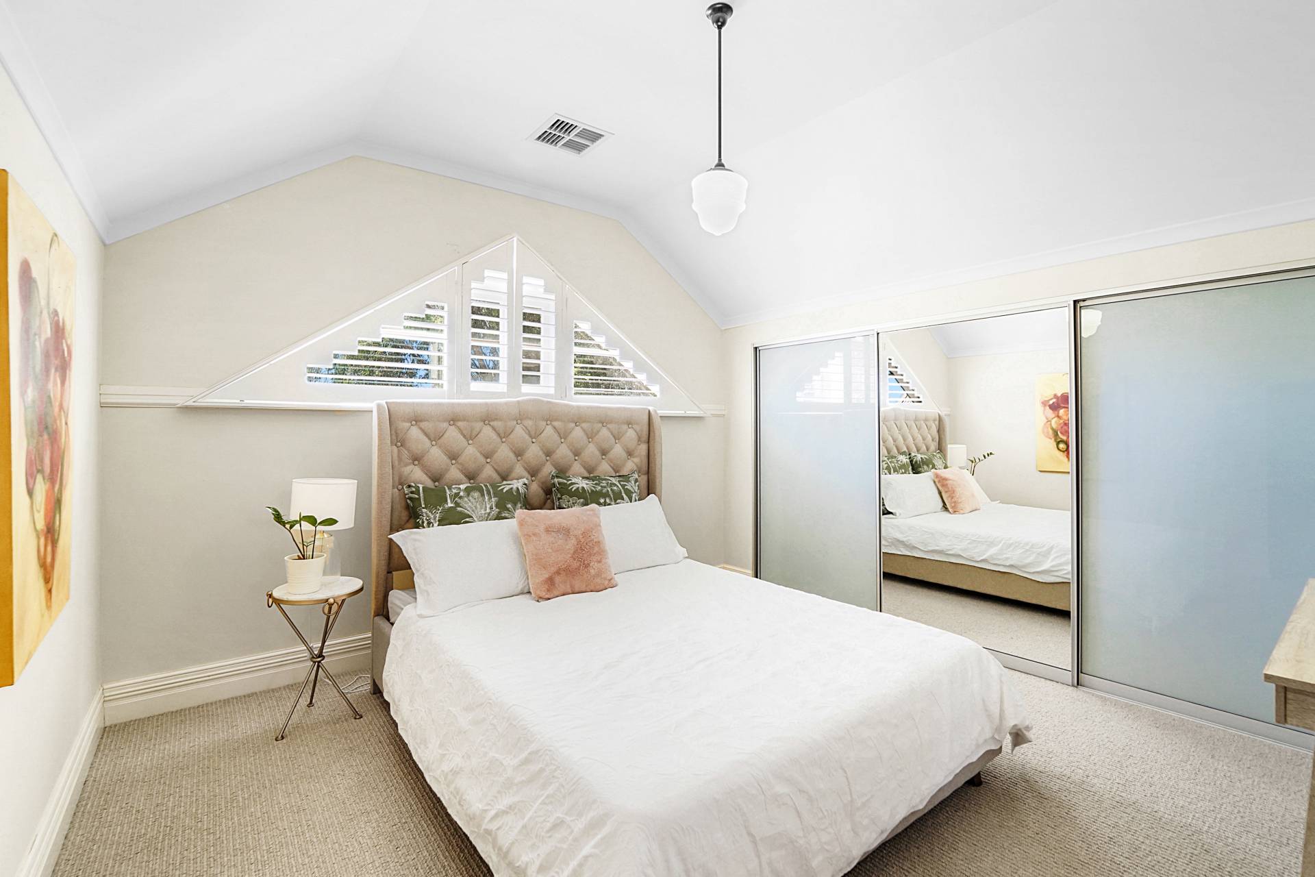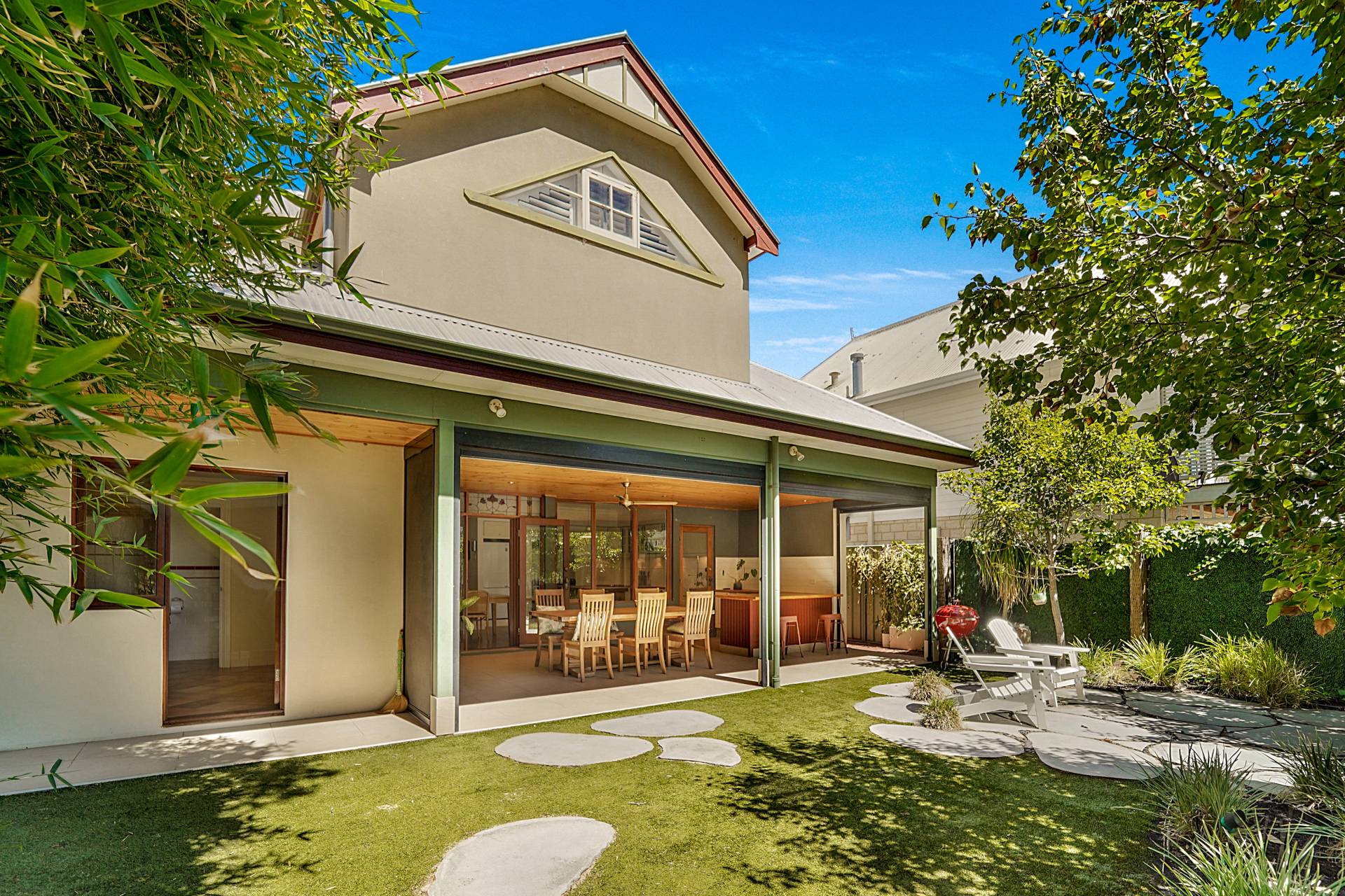 Upstairs, you'll discover a teenager's retreat or additional living area, with a sunny tiled balcony providing leafy tree-top views. Two generous bedrooms with triple built-in robes, vaulted ceilings and white shutters share the large family bathroom, where you'll luxuriate in a freestanding oval bathtub.