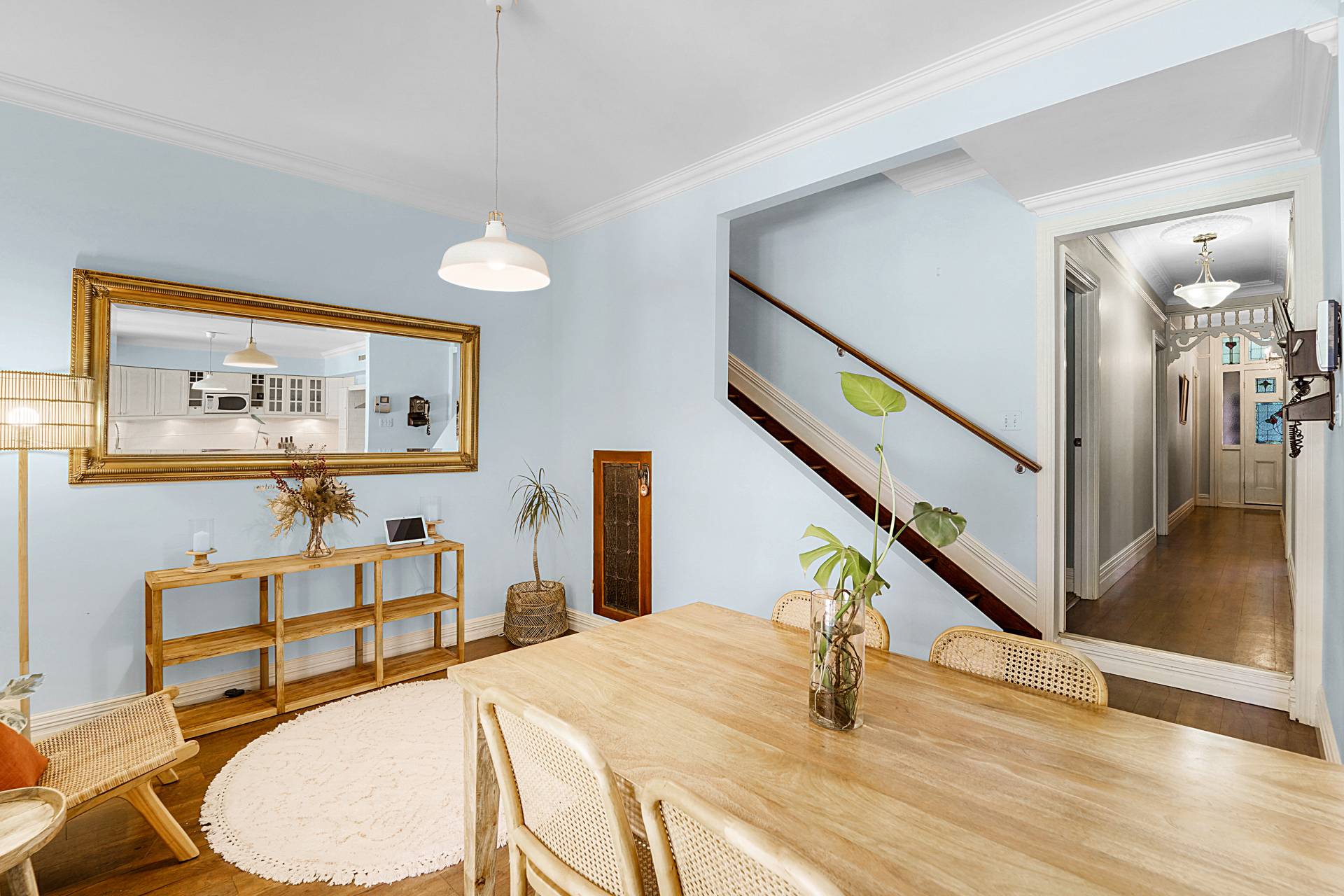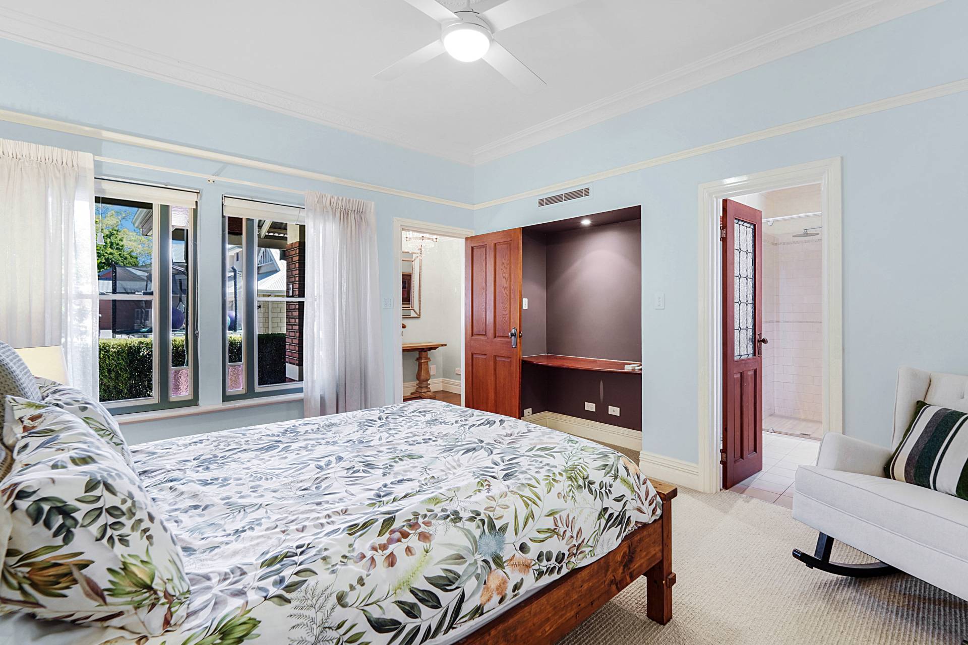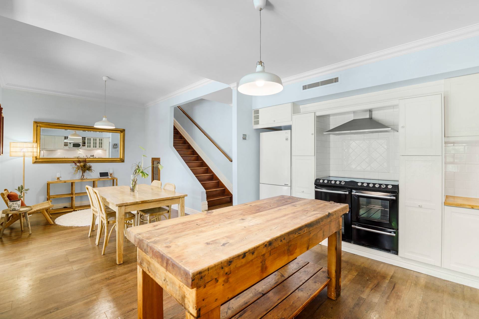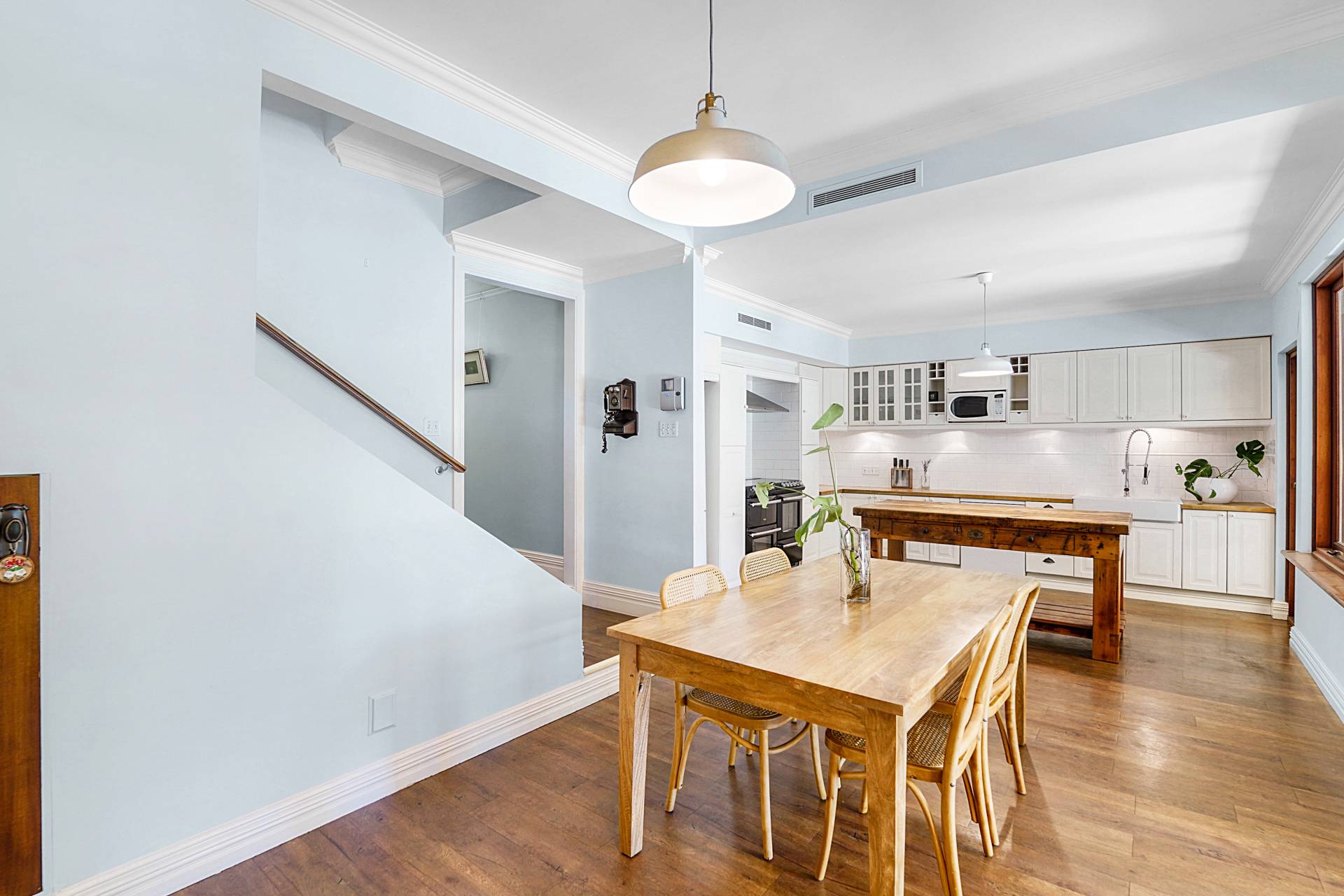 A central timber hallway, typical of the era, leads to a spacious theatre room with restful blue hues, a recessed ceiling, highlight windows and a gas bayonet. Across the hall, bedroom two also has a private ensuite with a leadlight window, WC, shower and heat lamp. Step down to the light-filled kitchen and dining area, where the high ceilings and wooden floors continue past the staircase to the second level.