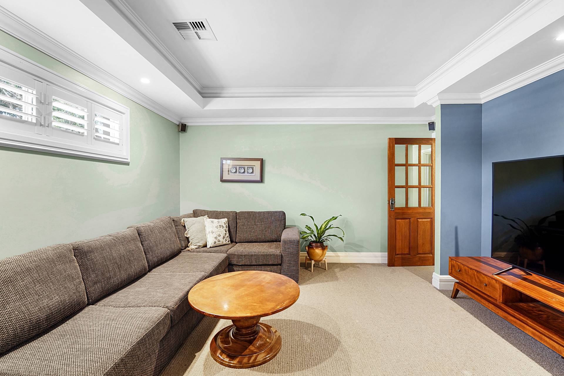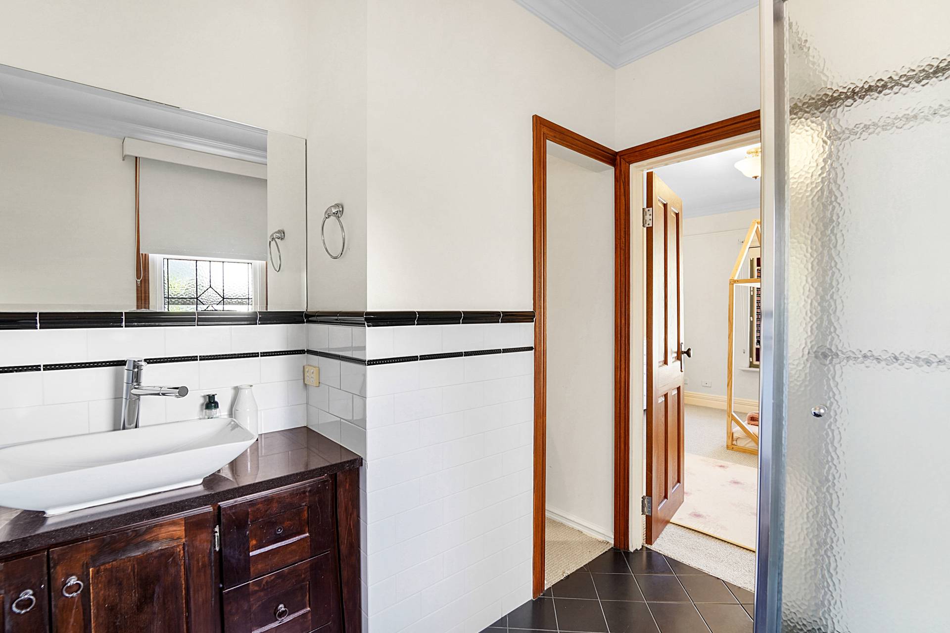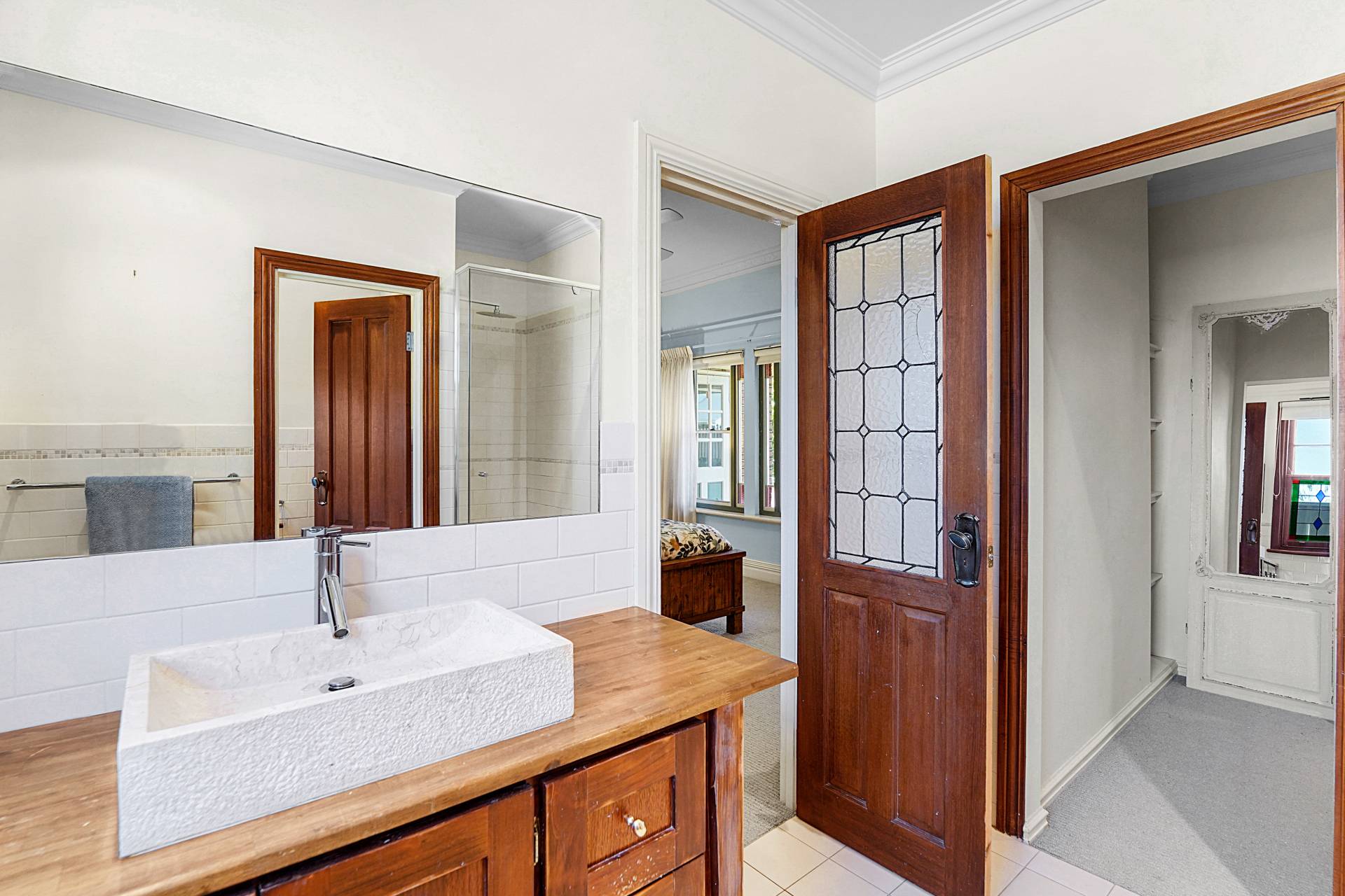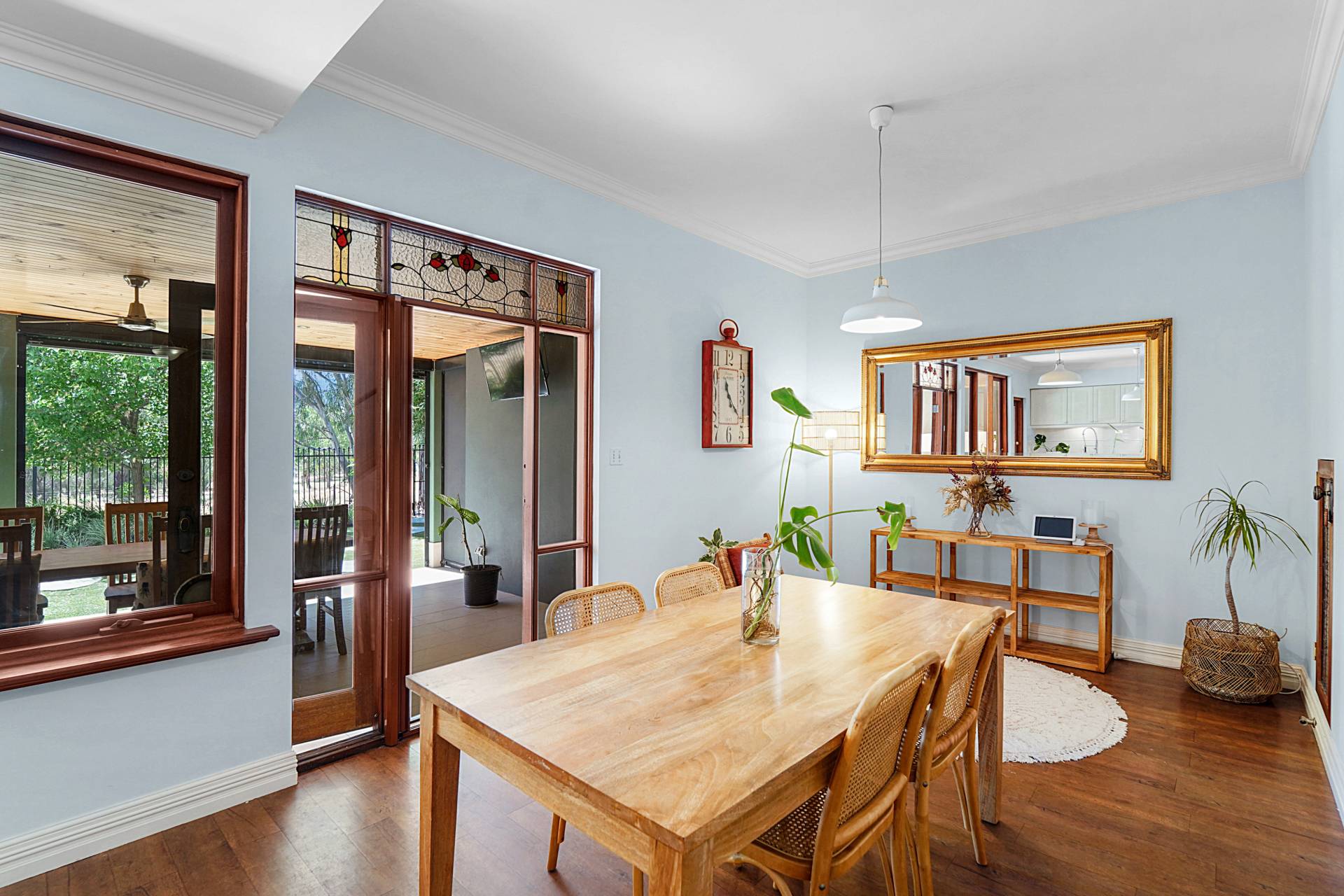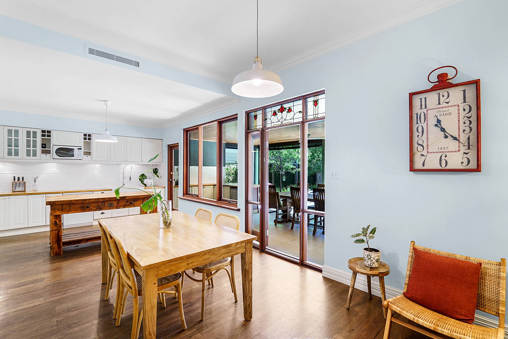 A central timber hallway, typical of the era, leads to a spacious theatre room with restful blue hues, a recessed ceiling, highlight windows and a gas bayonet. Across the hall, bedroom two also has a private ensuite with a leadlight window, WC, shower and heat lamp. Step down to the light-filled kitchen and dining area, where the high ceilings and wooden floors continue past the staircase to the second level.