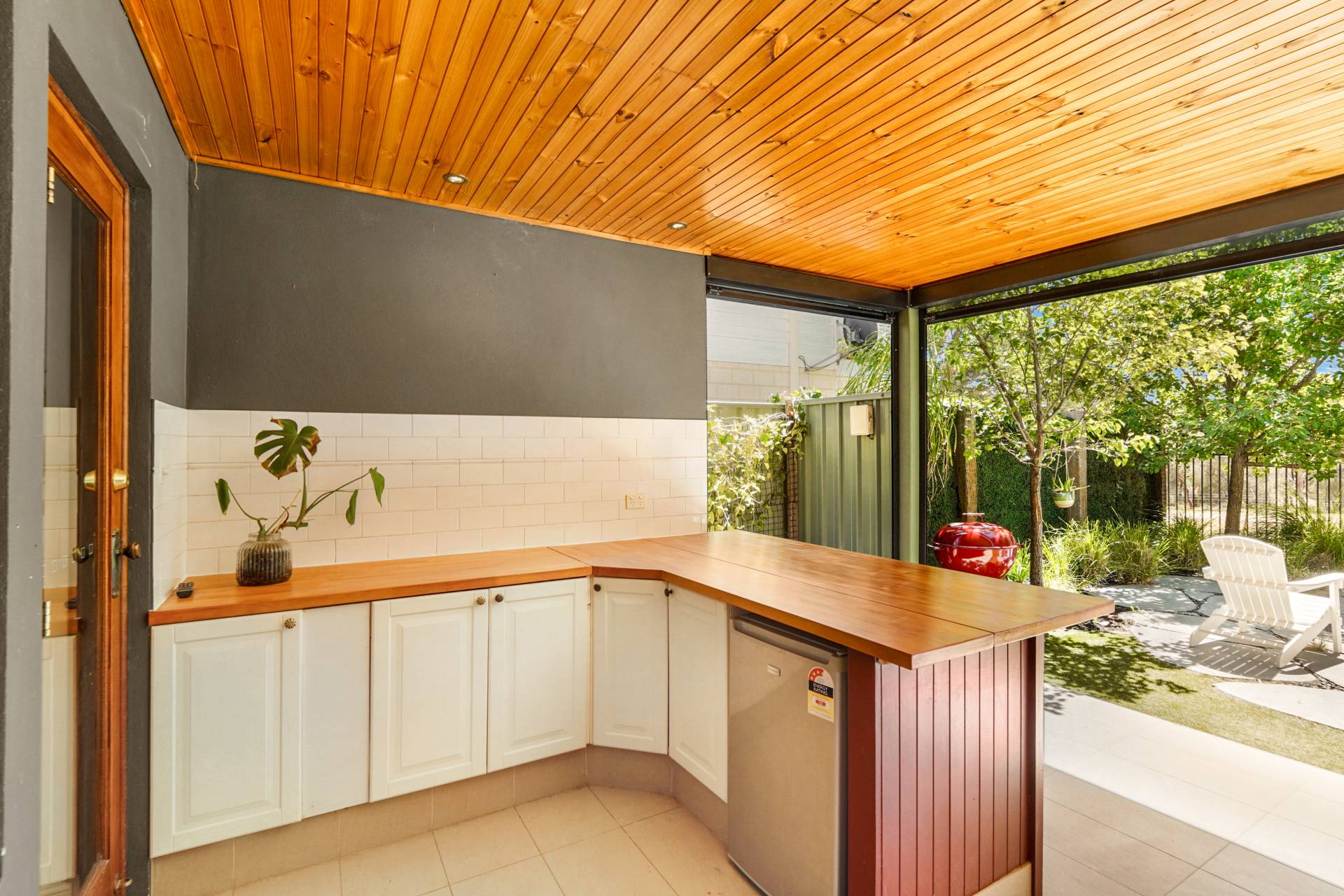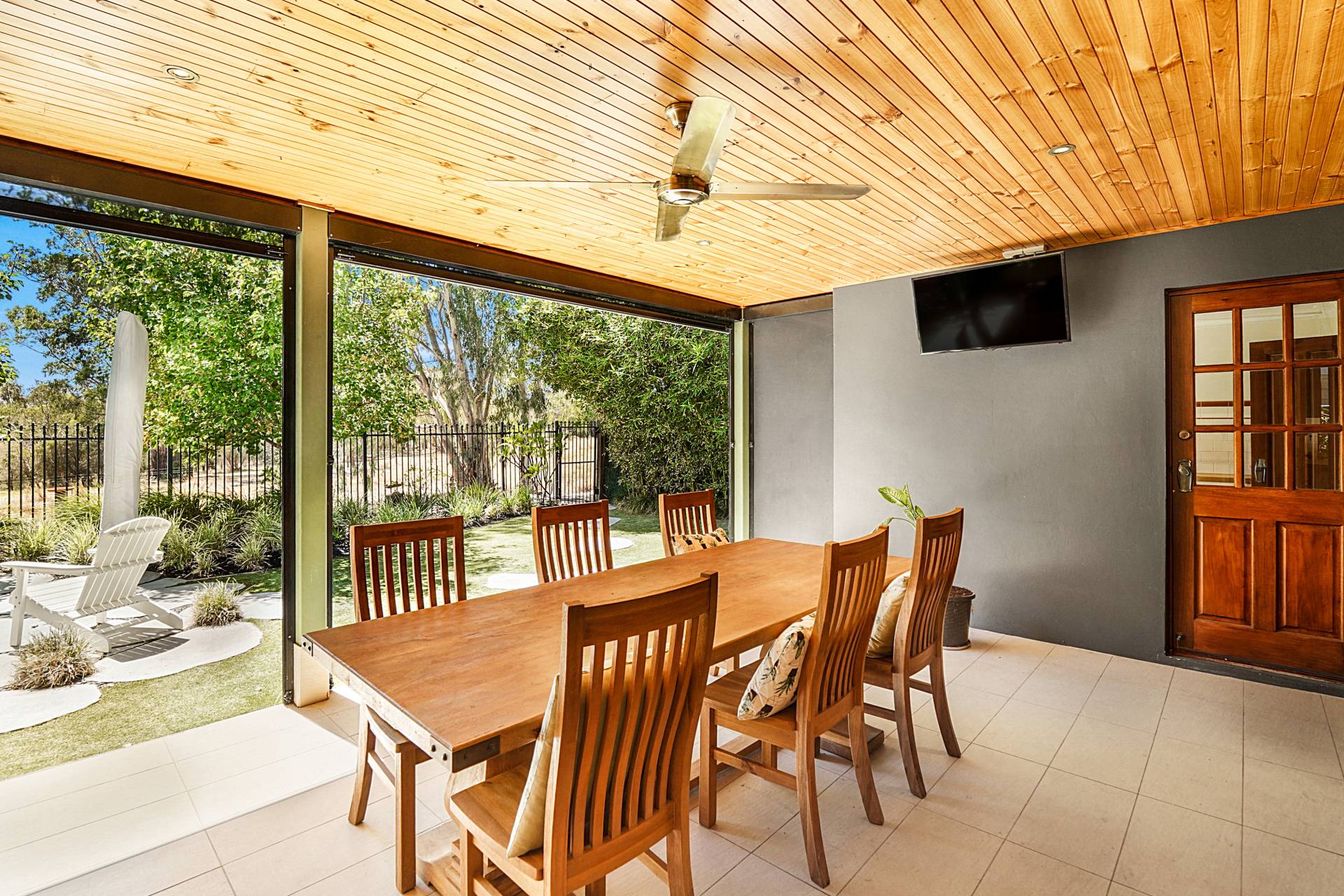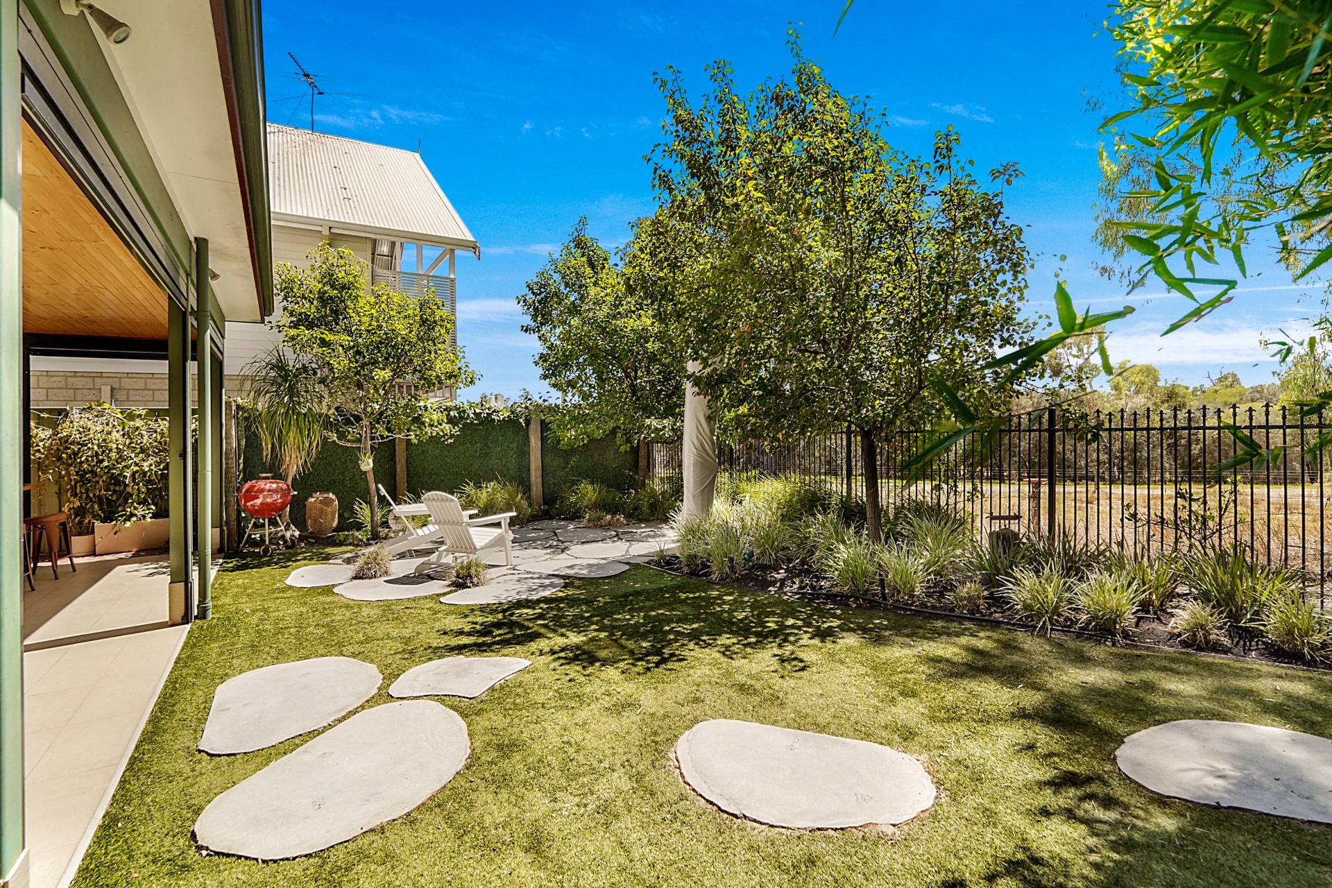 The north-east facing alfresco area provides an idyllic all-weather space to entertain and relax throughout the seasons. It features a timber-lined ceiling with a fan, built-in cupboards with a bar fridge, a wall-mounted TV, and picturesque wetland views. The easy-care gardens have established trees (including ornamental pears), quality artificial turf, large stepping stones, garden lighting, and retractable shade blinds - as well as a fixed market umbrella for those extra sunny days.