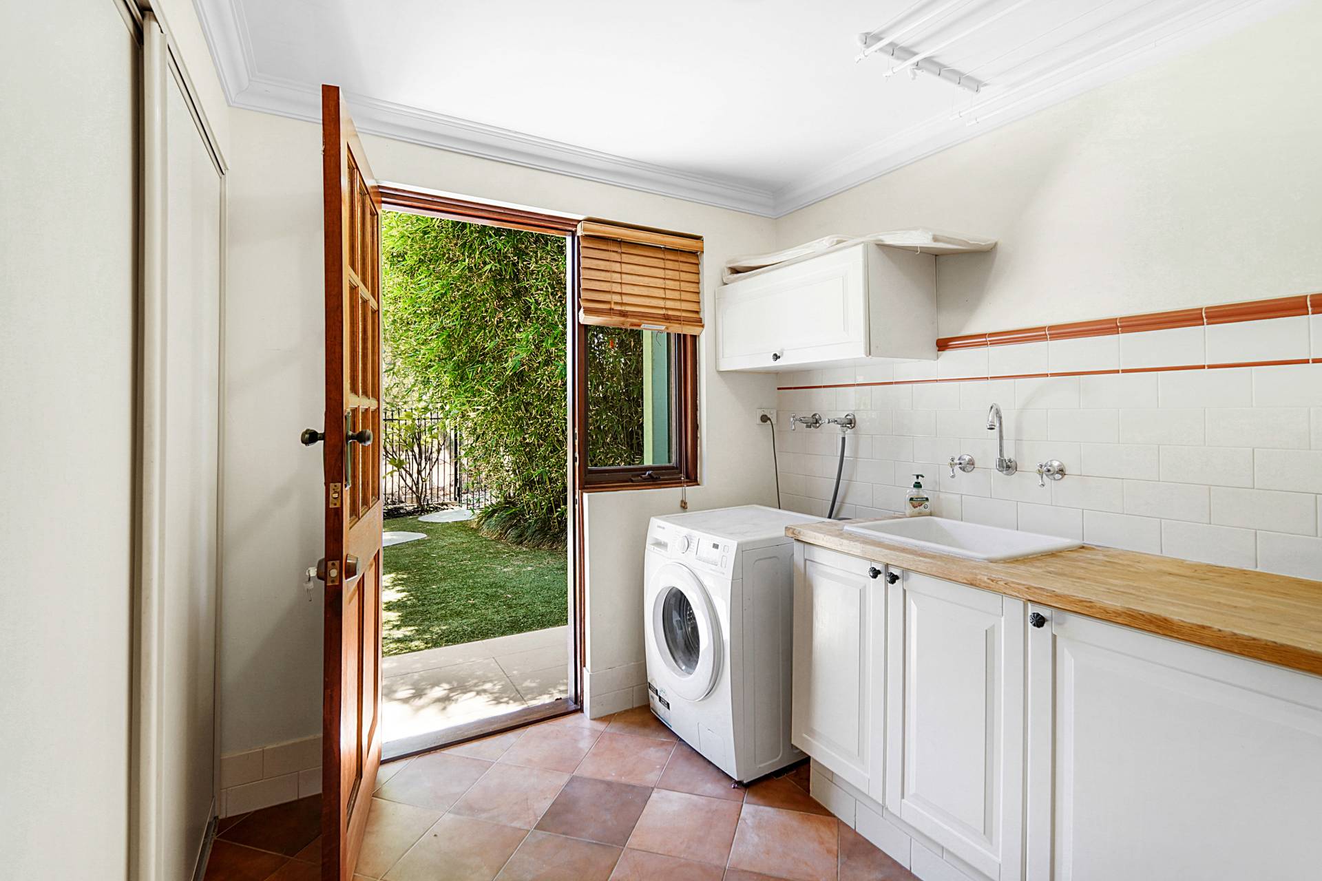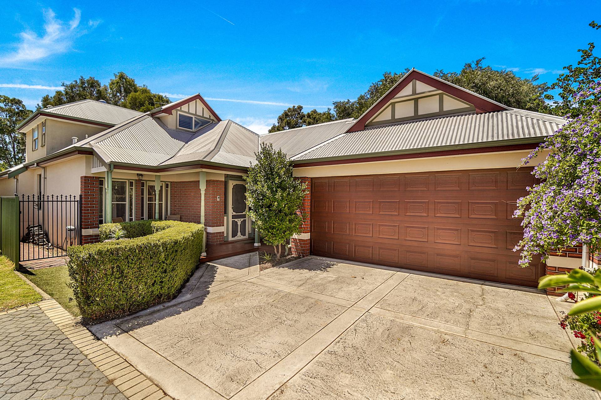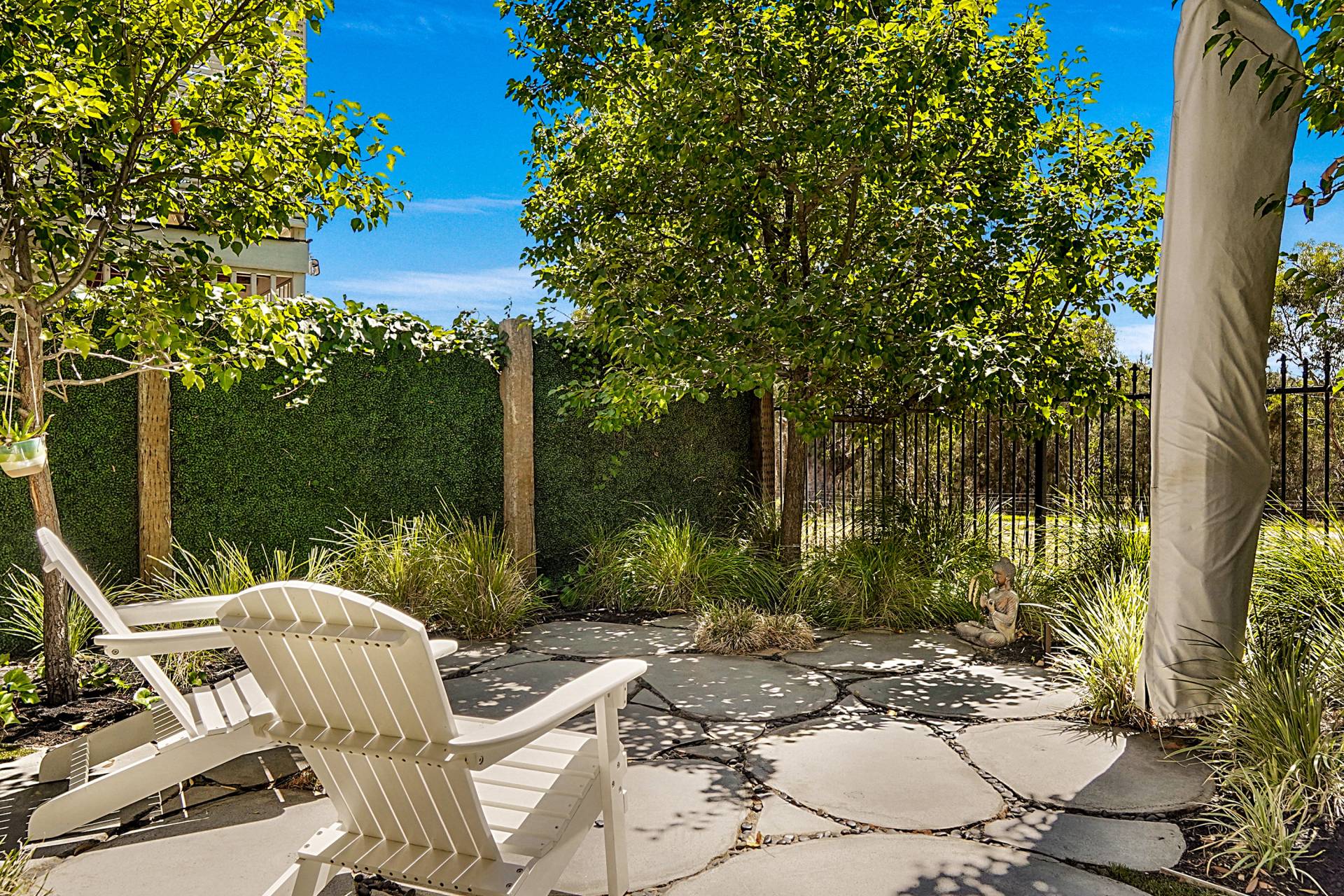 The north-east facing alfresco area provides an idyllic all-weather space to entertain and relax throughout the seasons. It features a timber-lined ceiling with a fan, built-in cupboards with a bar fridge, a wall-mounted TV, and picturesque wetland views. The easy-care gardens have established trees (including ornamental pears), quality artificial turf, large stepping stones, garden lighting, and retractable shade blinds - as well as a fixed market umbrella for those extra sunny days.