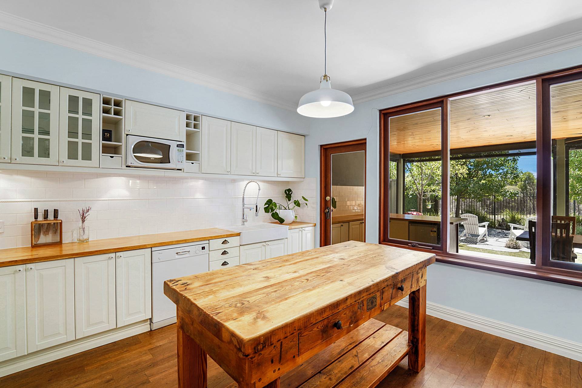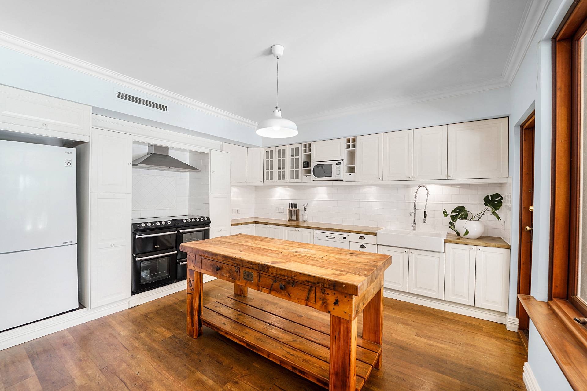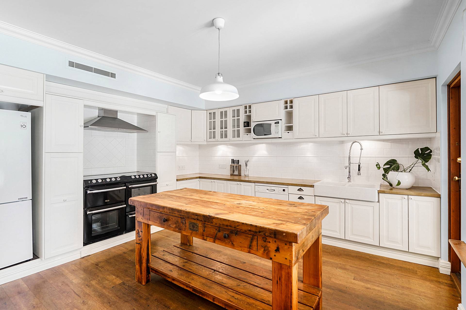 A charming blend of rustic and luxurious, you'll find cream-coloured cabinetry, a solid timber workbench, double ceramic basins and an impressive Belling gas cooker with double ovens, seven burners, a warming drawer and a grill. There's also a Bosch dishwasher, subway-tiled splashbacks and timber countertops.