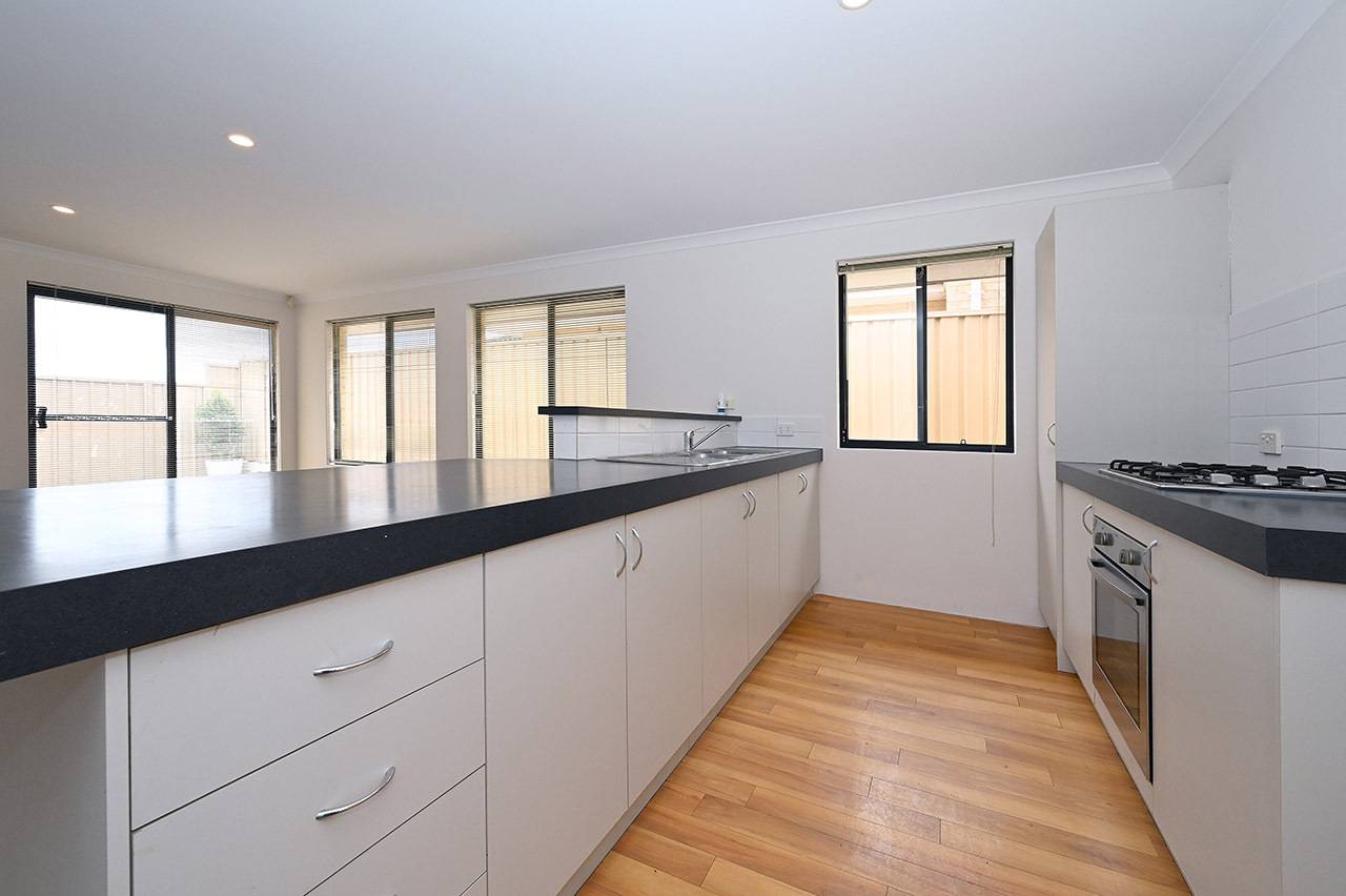Central kitchen with under bench oven, 4 burner gas cooktop, fridge recess and plenty of bench and cupboard space