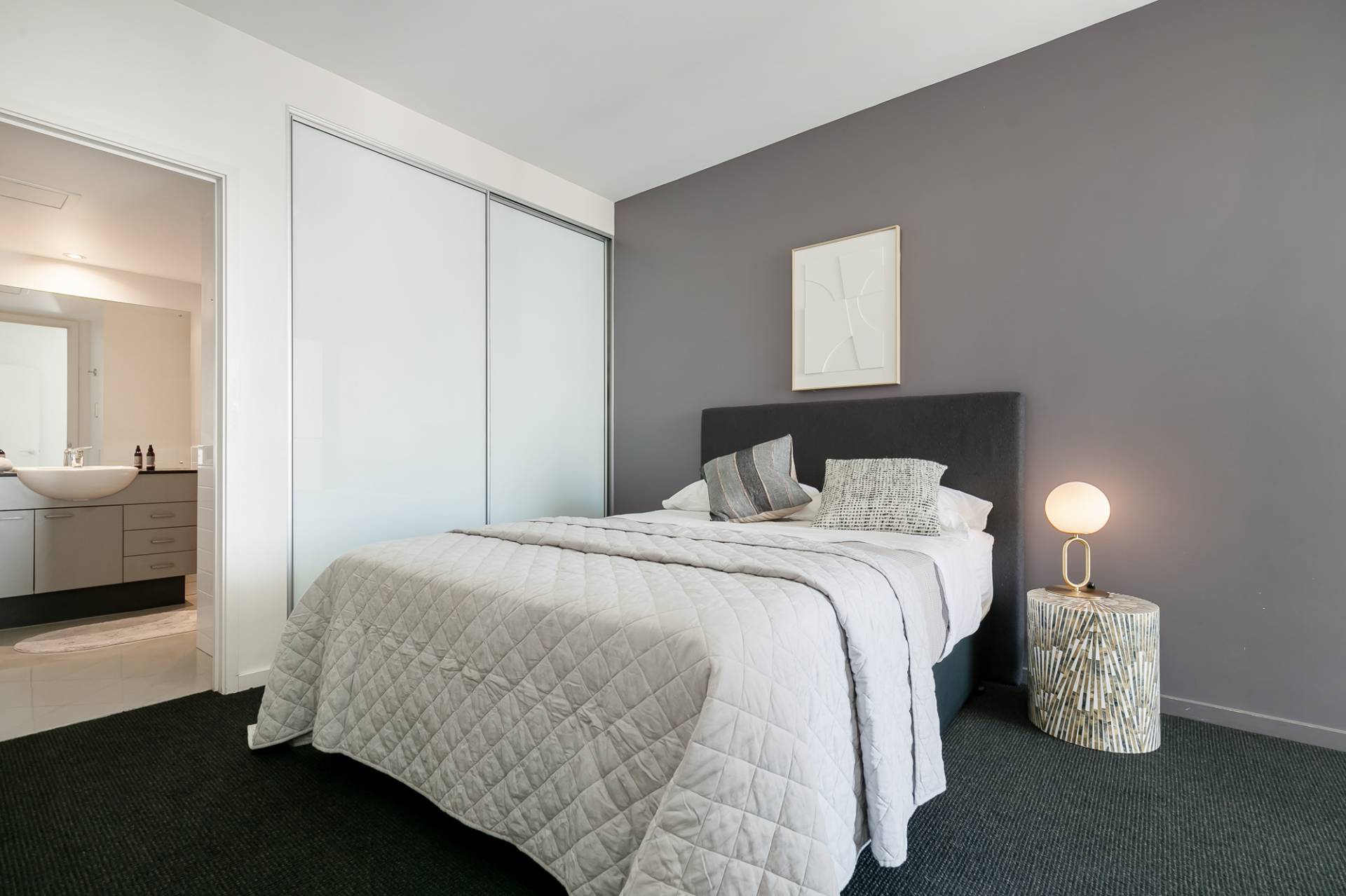 • Large main bedroom with built-in robe and sliding doors opening onto a smaller private balcony