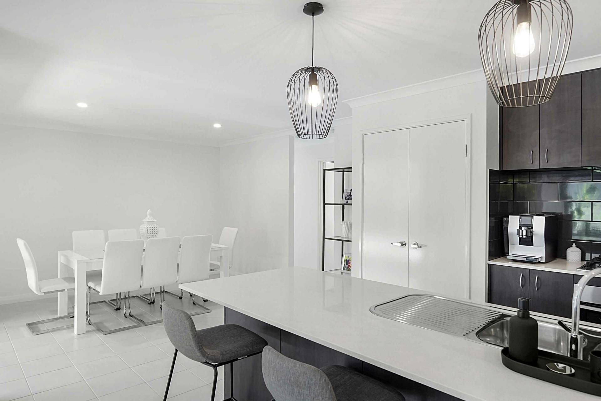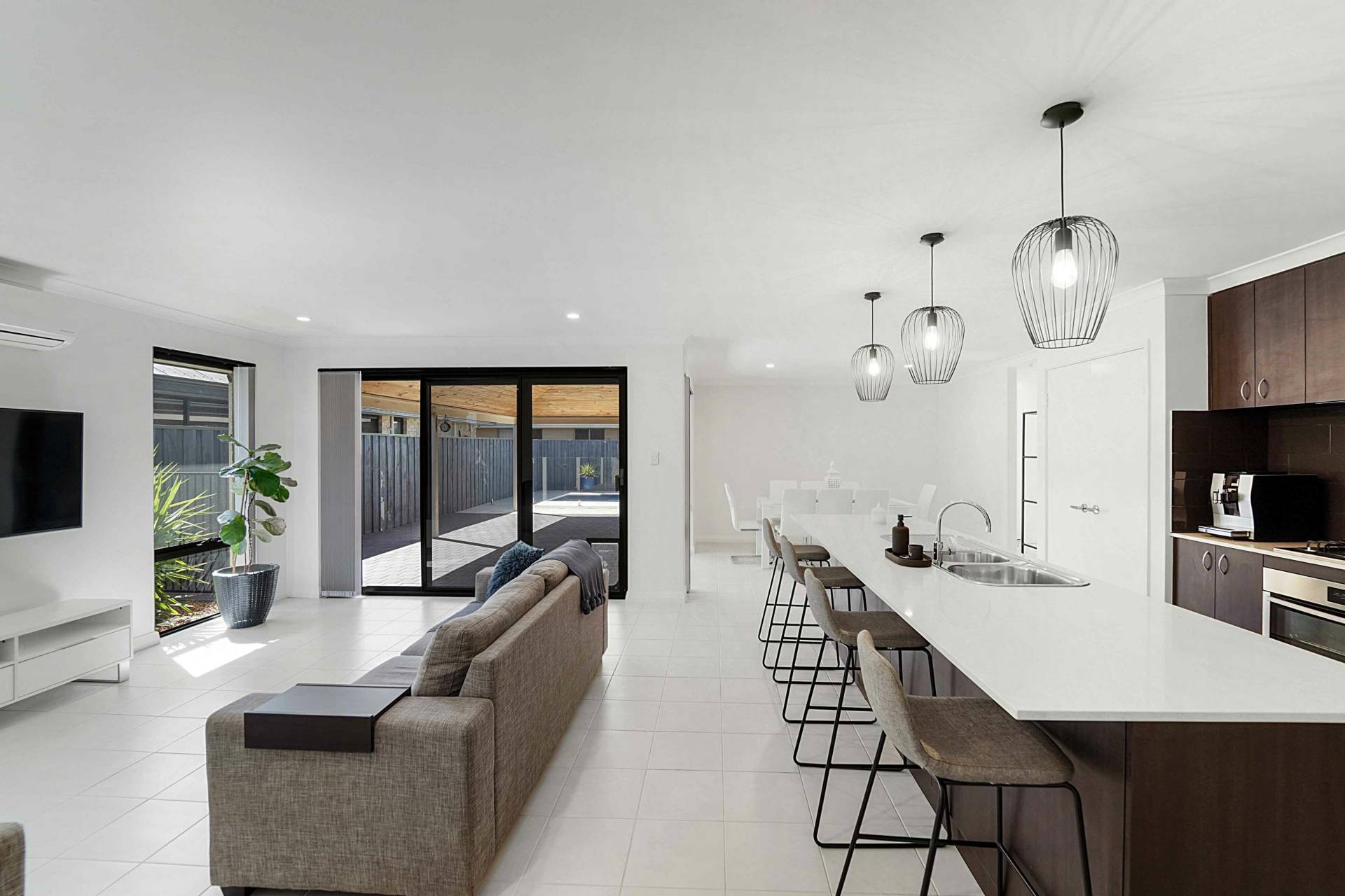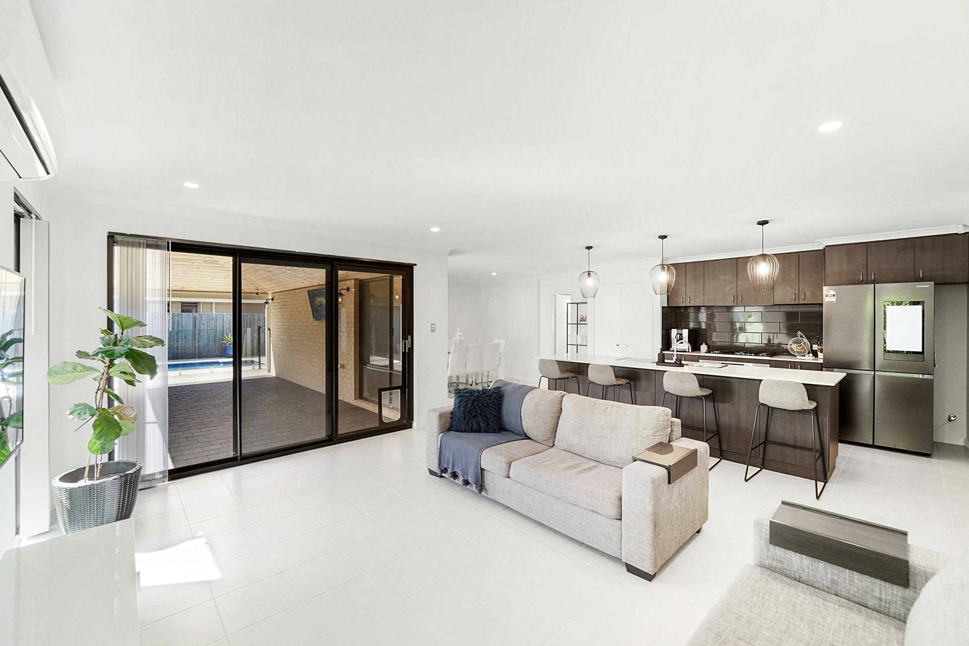 Through a double door entry, easy-care tiles in the wide hall lead to a carpeted front theatre or living room (with projector included), perfect for movie nights or more formal get-togethers. At the sunny rear of the property, the home expands into an open plan kitchen, living and dining with a breezy outlook to the sparkling swimming pool, surrounding greenery and alfresco.
