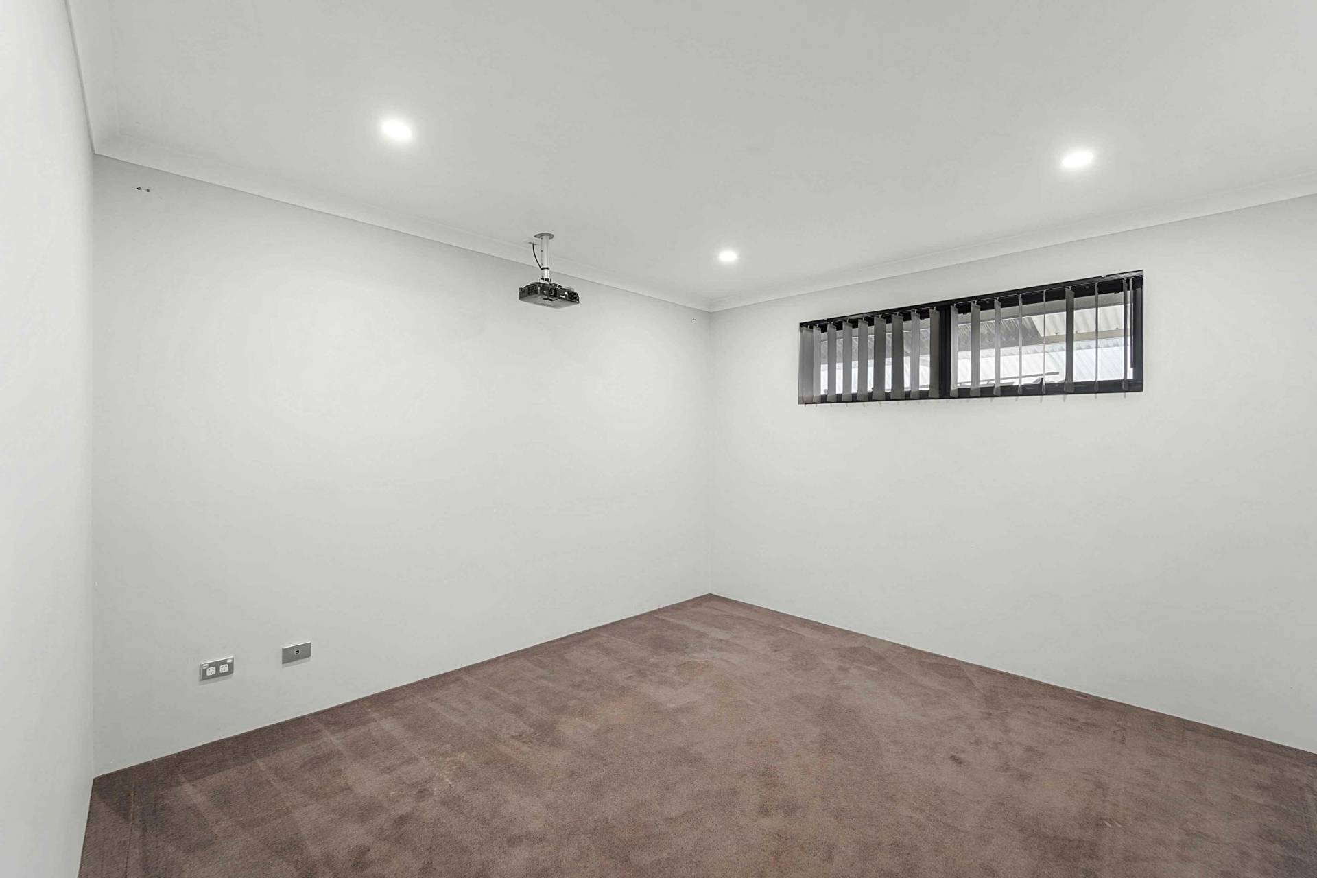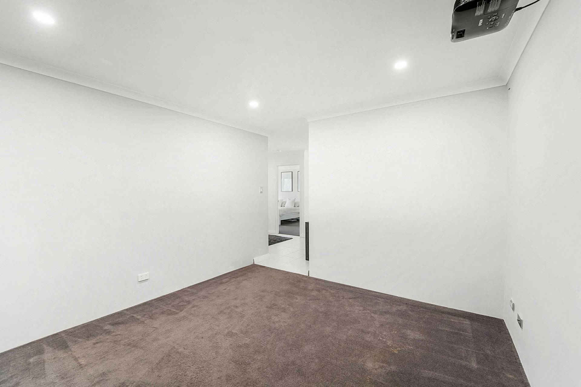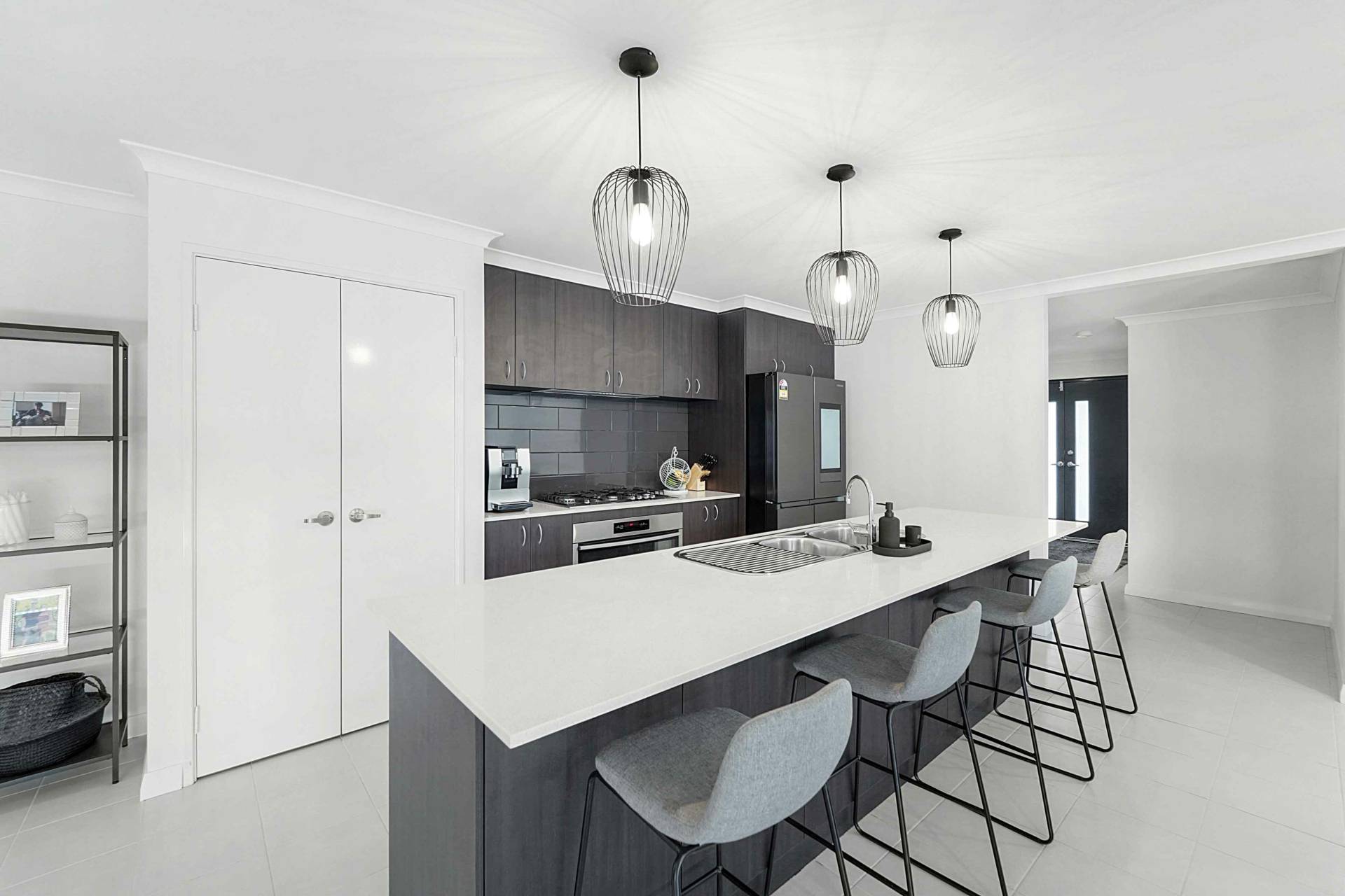Through a double door entry, easy-care tiles in the wide hall lead to a carpeted front theatre or living room (with projector included), perfect for movie nights or more formal get-togethers. At the sunny rear of the property, the home expands into an open plan kitchen, living and dining with a breezy outlook to the sparkling swimming pool, surrounding greenery and alfresco.