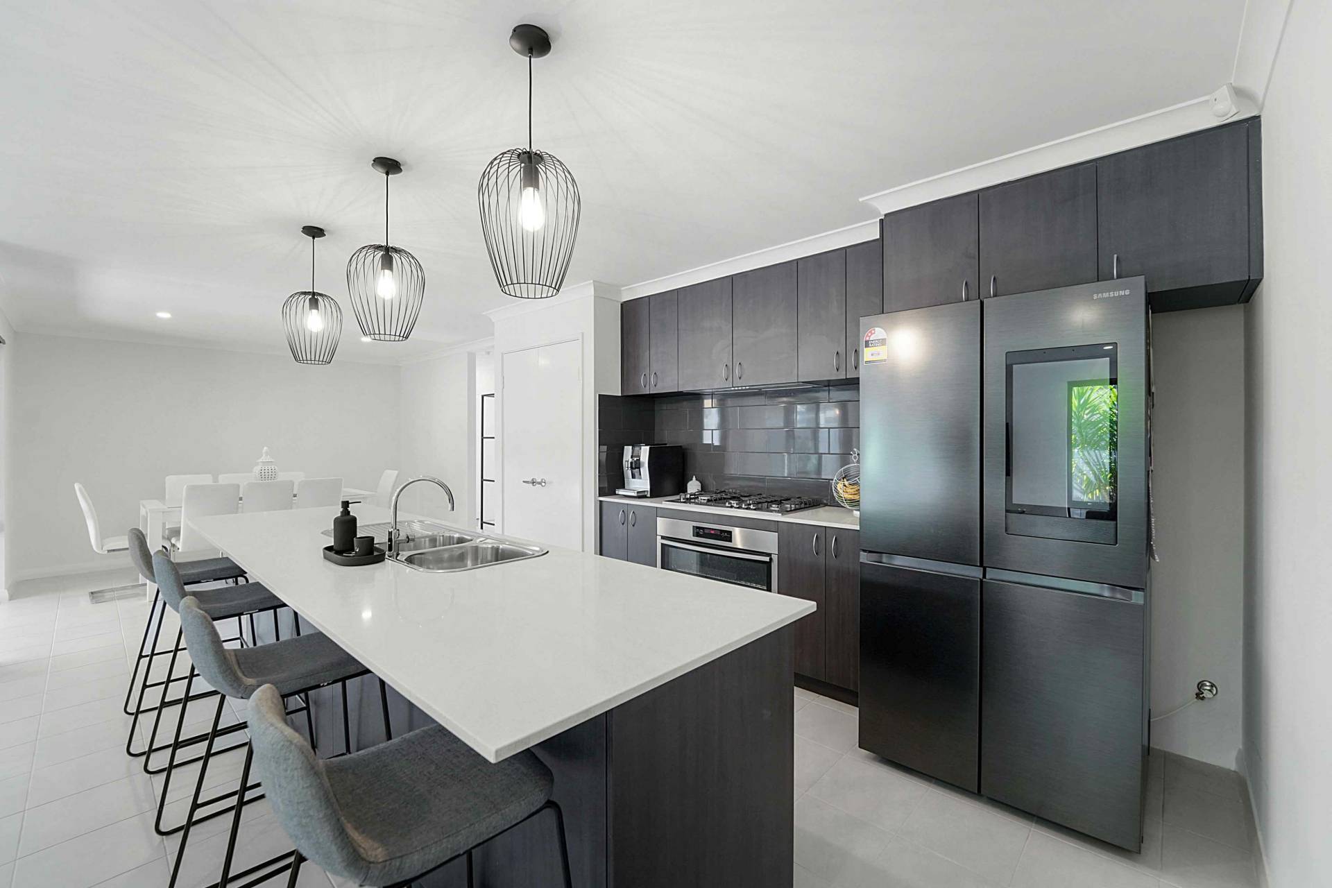 In the kitchen itself, discover a modern and practical layout with double sinks within the central kitchen island, a double pantry and fridge space, a five-burner gas stove top, and a large breakfast bar. The kitchen island also features additional under-storage, while the adjoining casual living and dining areas are a great place to cool off, thanks to split system air conditioning and sliding doors to the private outside zone.