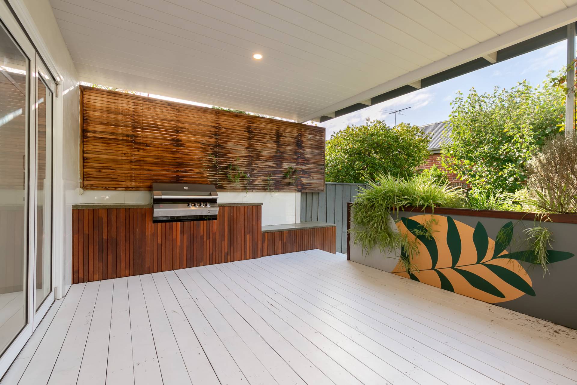 • Decked alfresco with high-quality Ziegler and Brown built-in BBQ, polished concrete benchtops and built-in timber seating