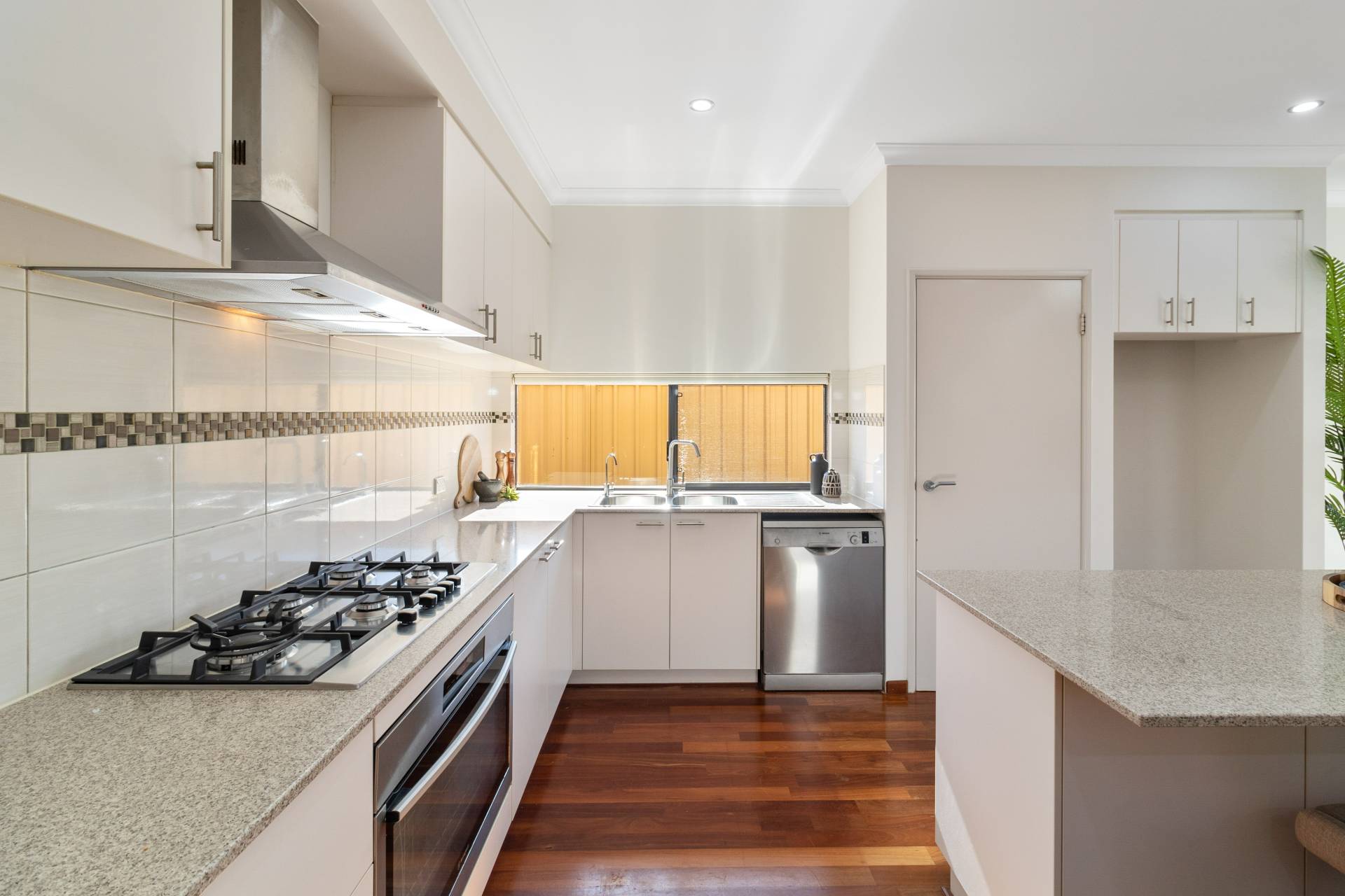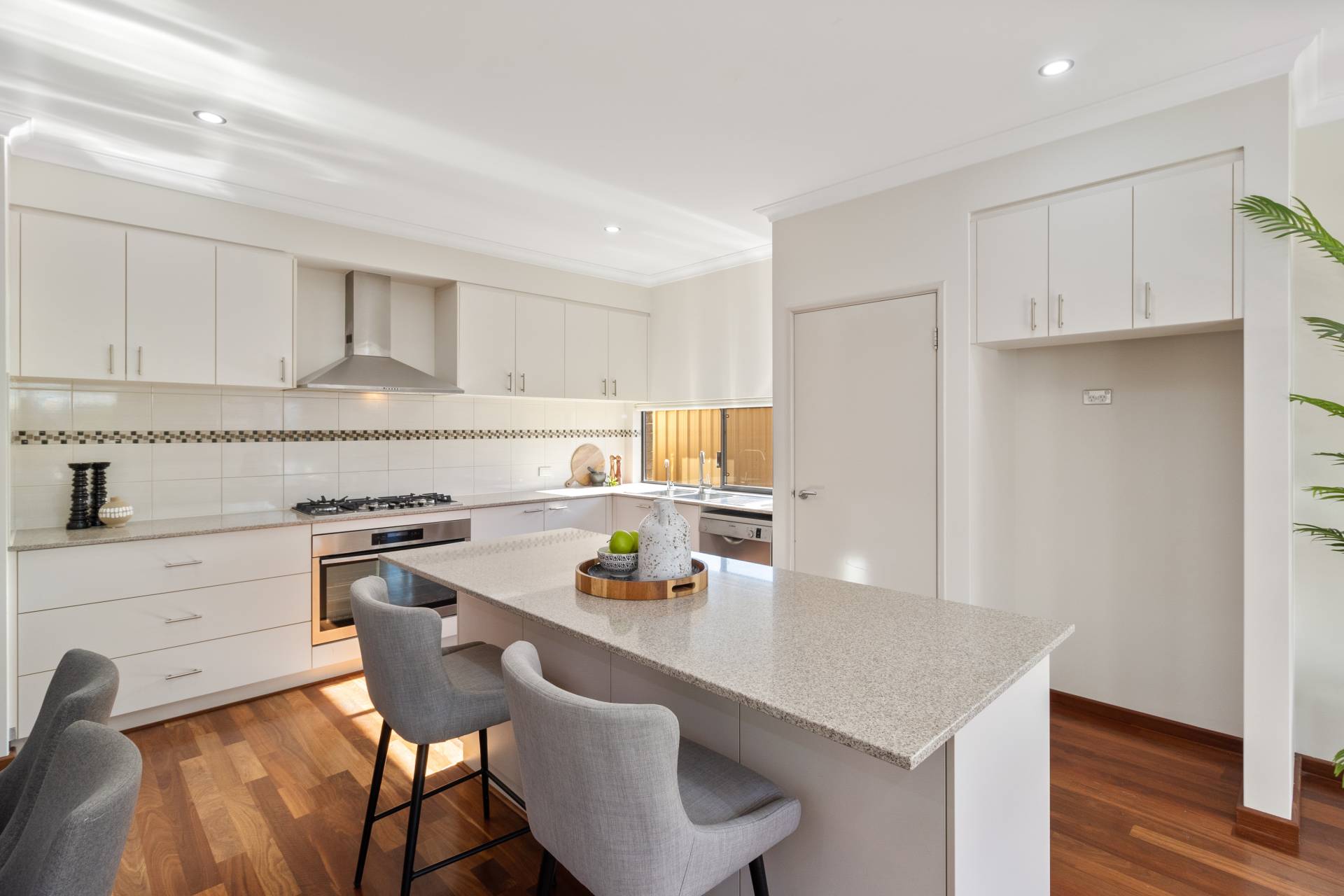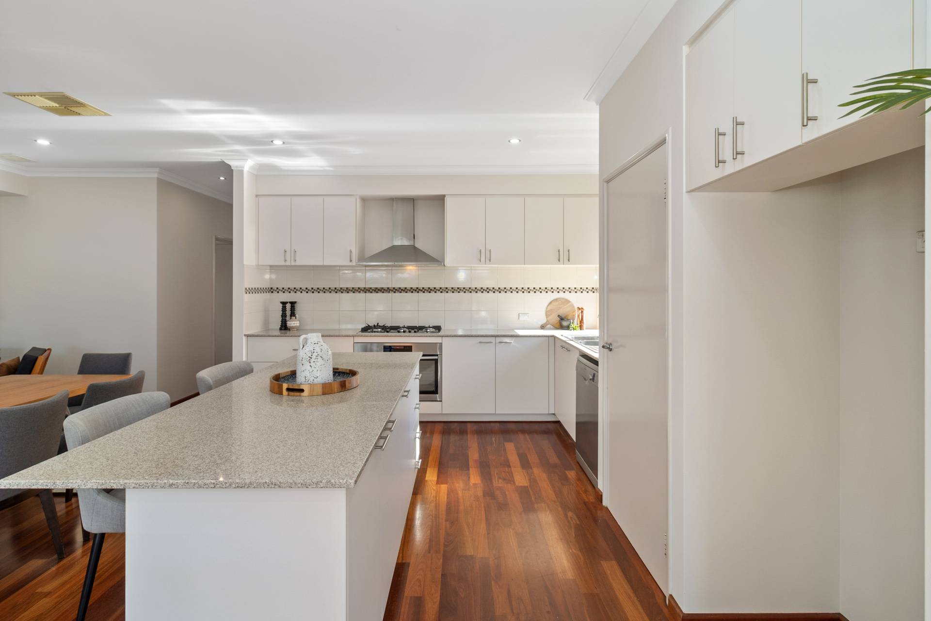 Featuring four bedrooms and two bathrooms, this home is built on a 390sqm easy-care block with a build area of 216 sqm. The house was built in 2013 and boasts high-quality finishes, including Jarrah wooden floors, 31c ceilings throughout, and stone benchtops.