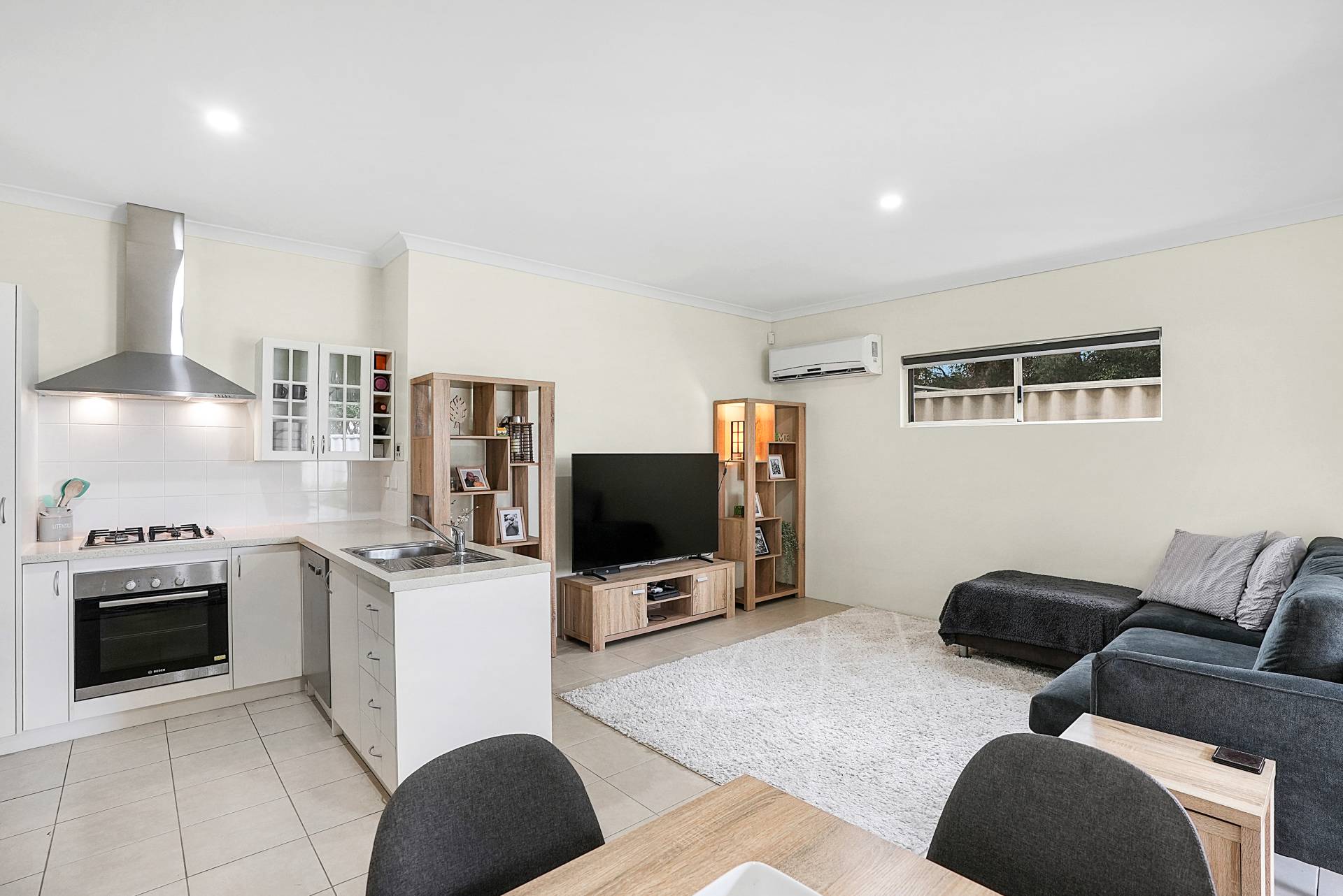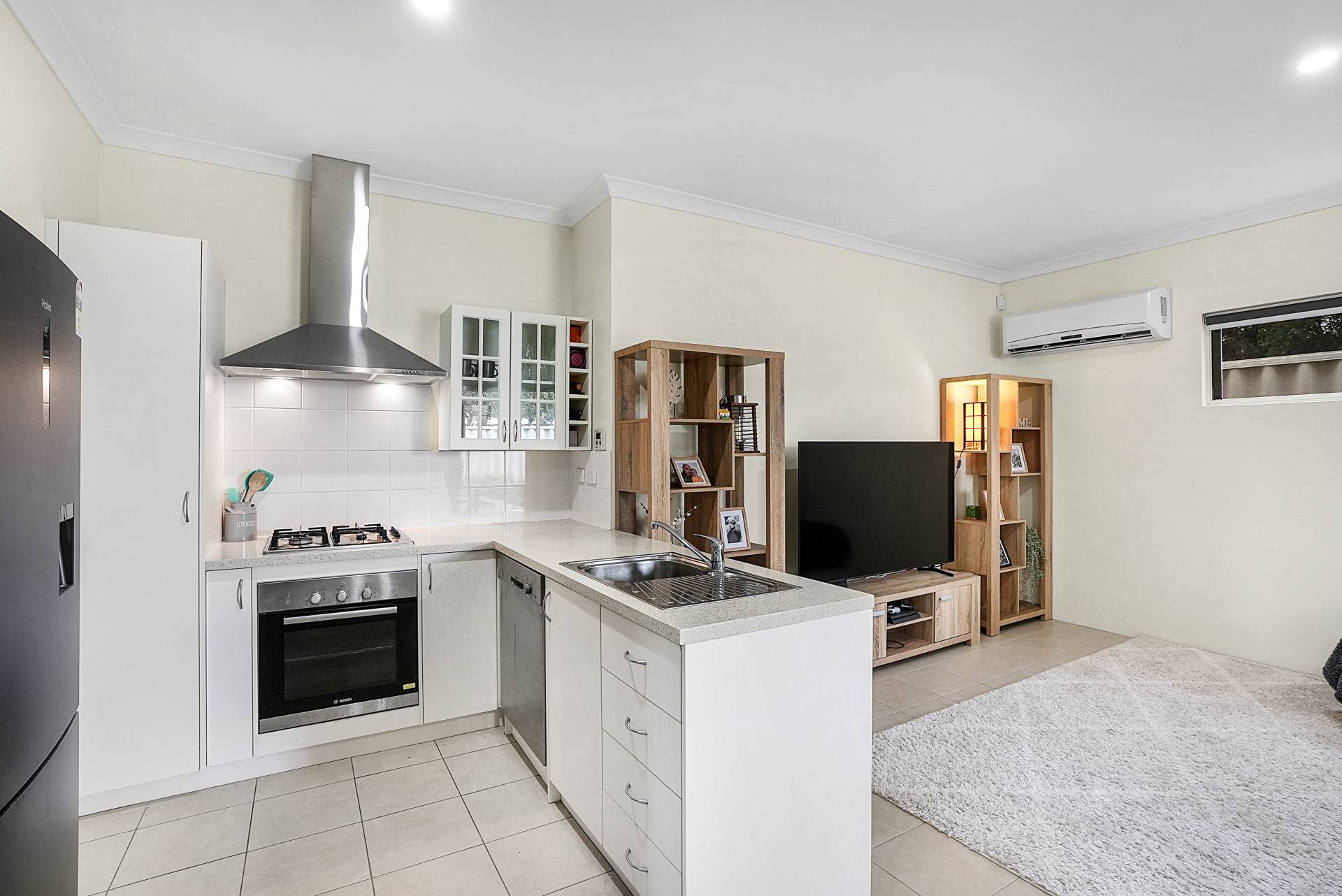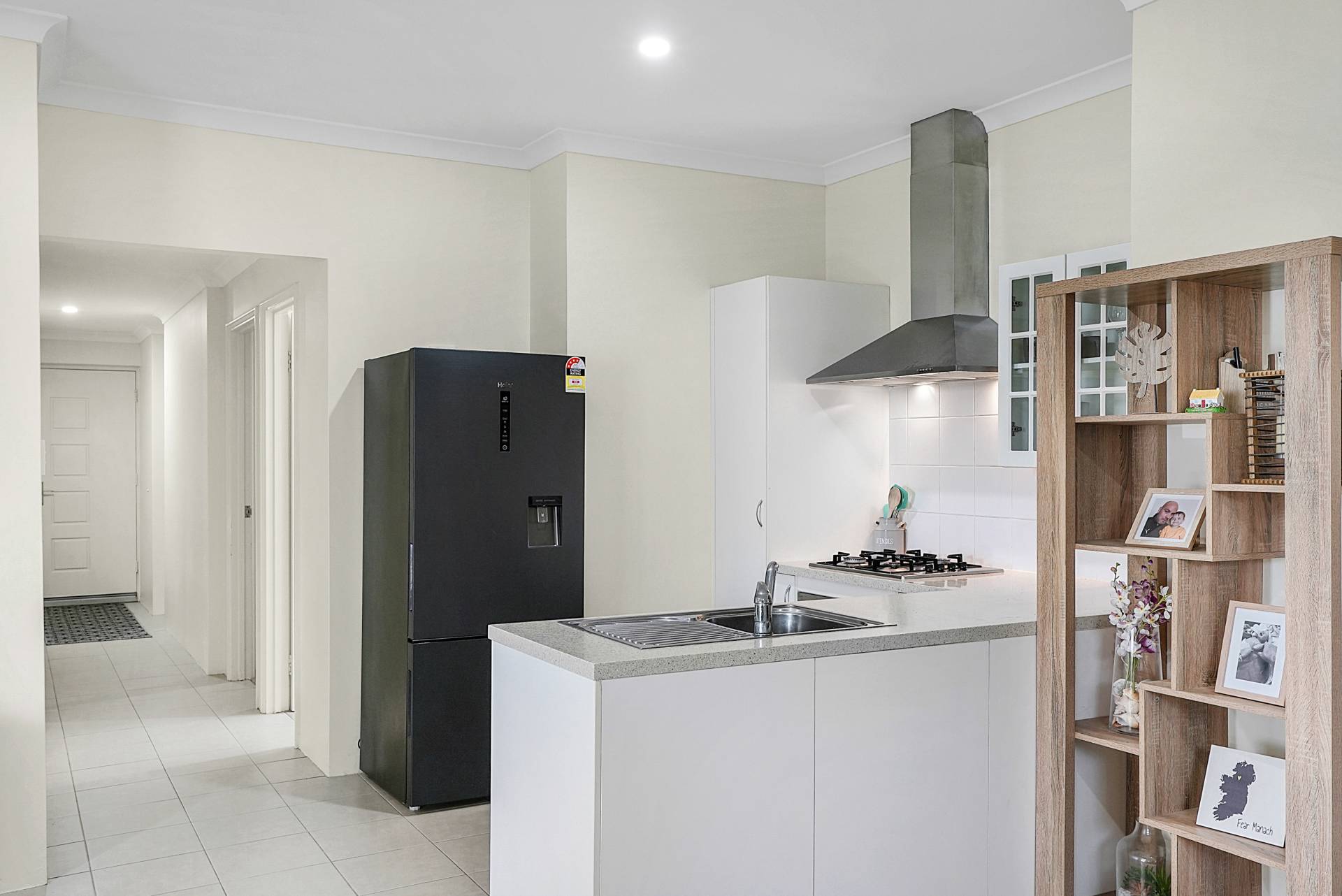 - Kitchen comes complete with stone look laminate benchtops, under-bench oven, wide fridge recess, 4 burner gas cook top with stainless steel canopy rangehood and space for a dishwasher