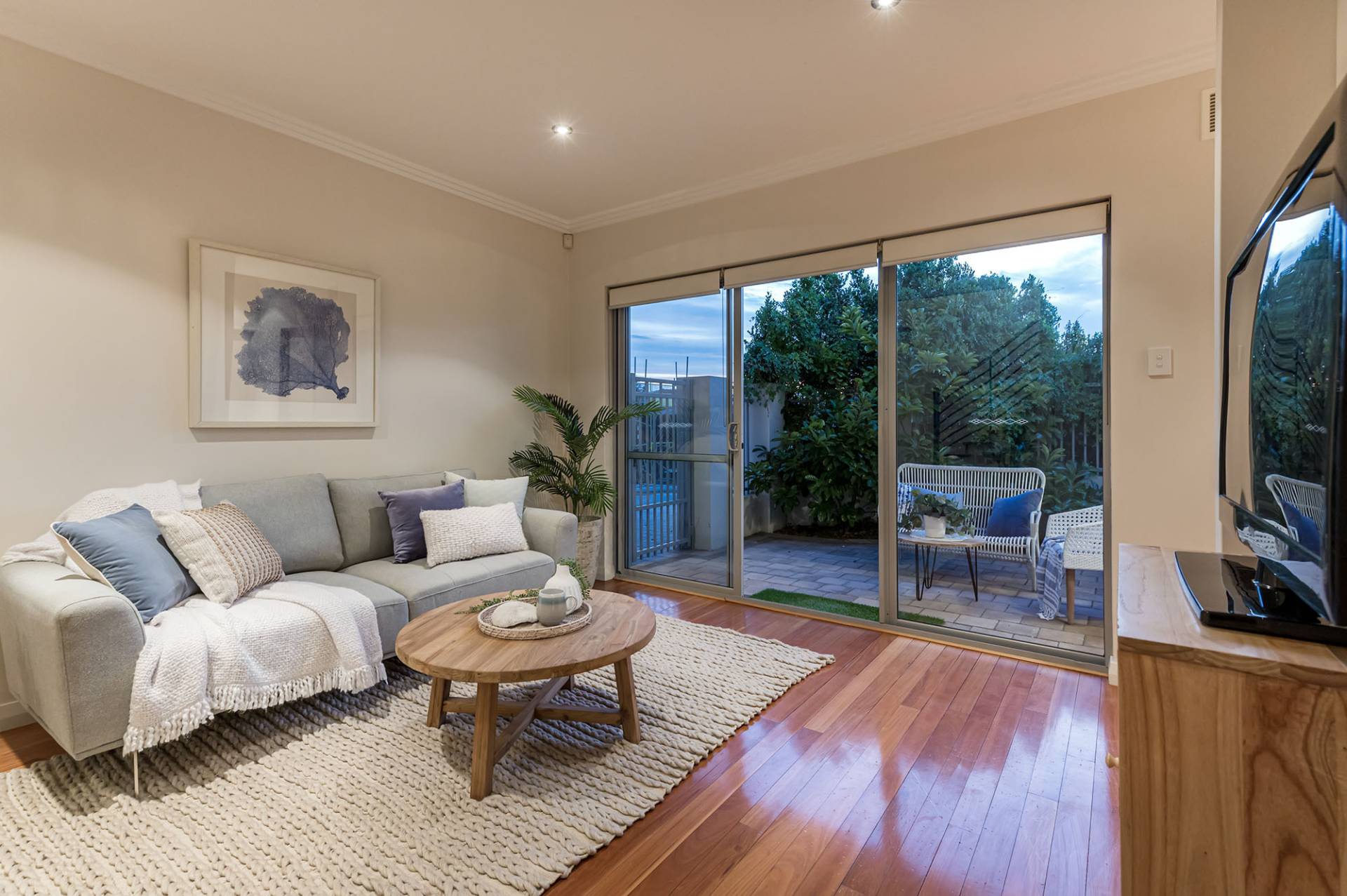 Upon entry, find solid timber floors that unify the ground-floor living area, the split-level staircase, and the upper level. The residence presents the flexibility of having bedrooms and living areas on both floors, perfect for versatile living options or accommodating guests. The lower level boasts two spacious bedrooms with built-in robes and a contemporary main bathroom with a shower, bath, vanity, and separate WC. The living area leads to a fully paved west-facing courtyard, providing a tranquil outdoor setting for relaxing and entertaining.