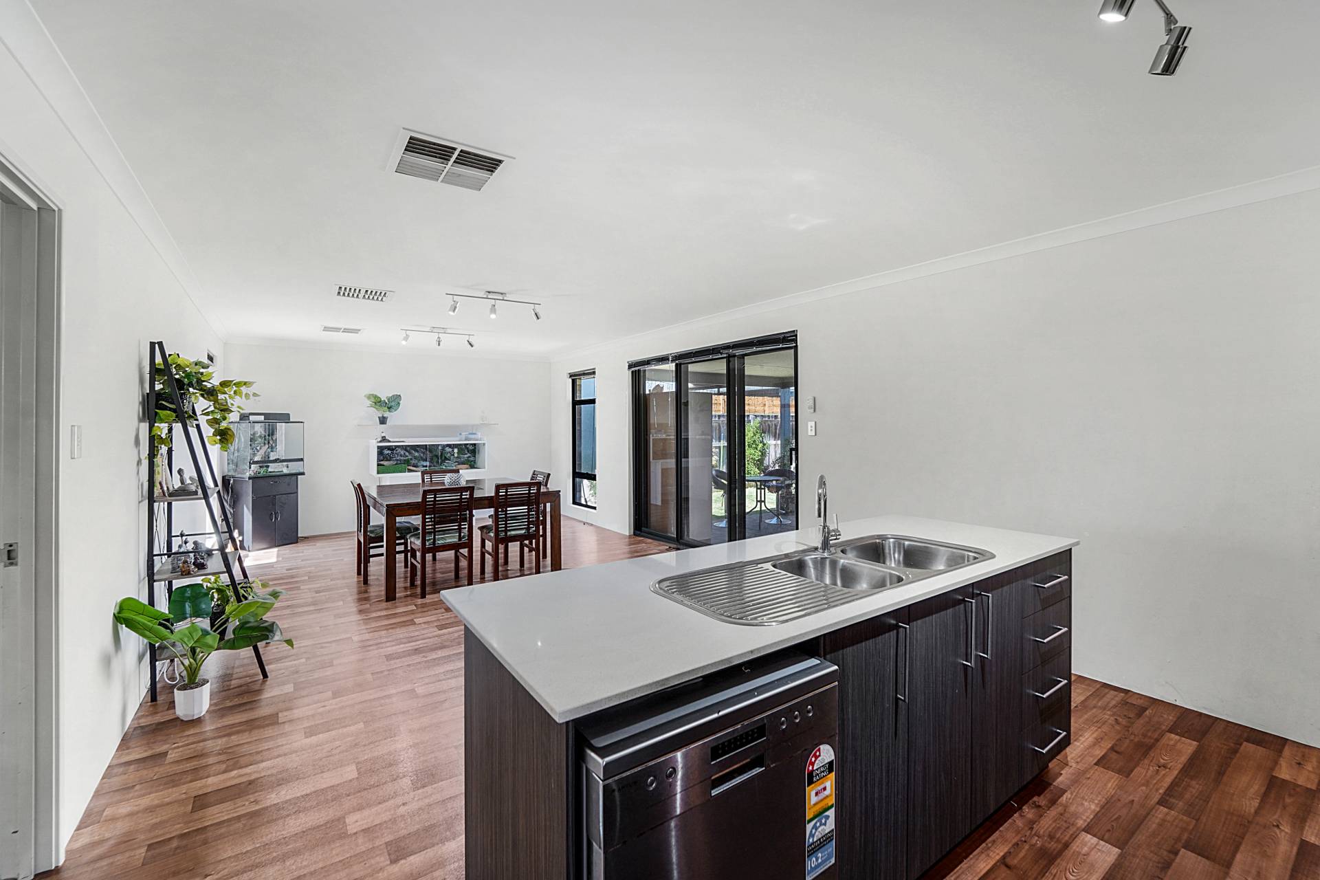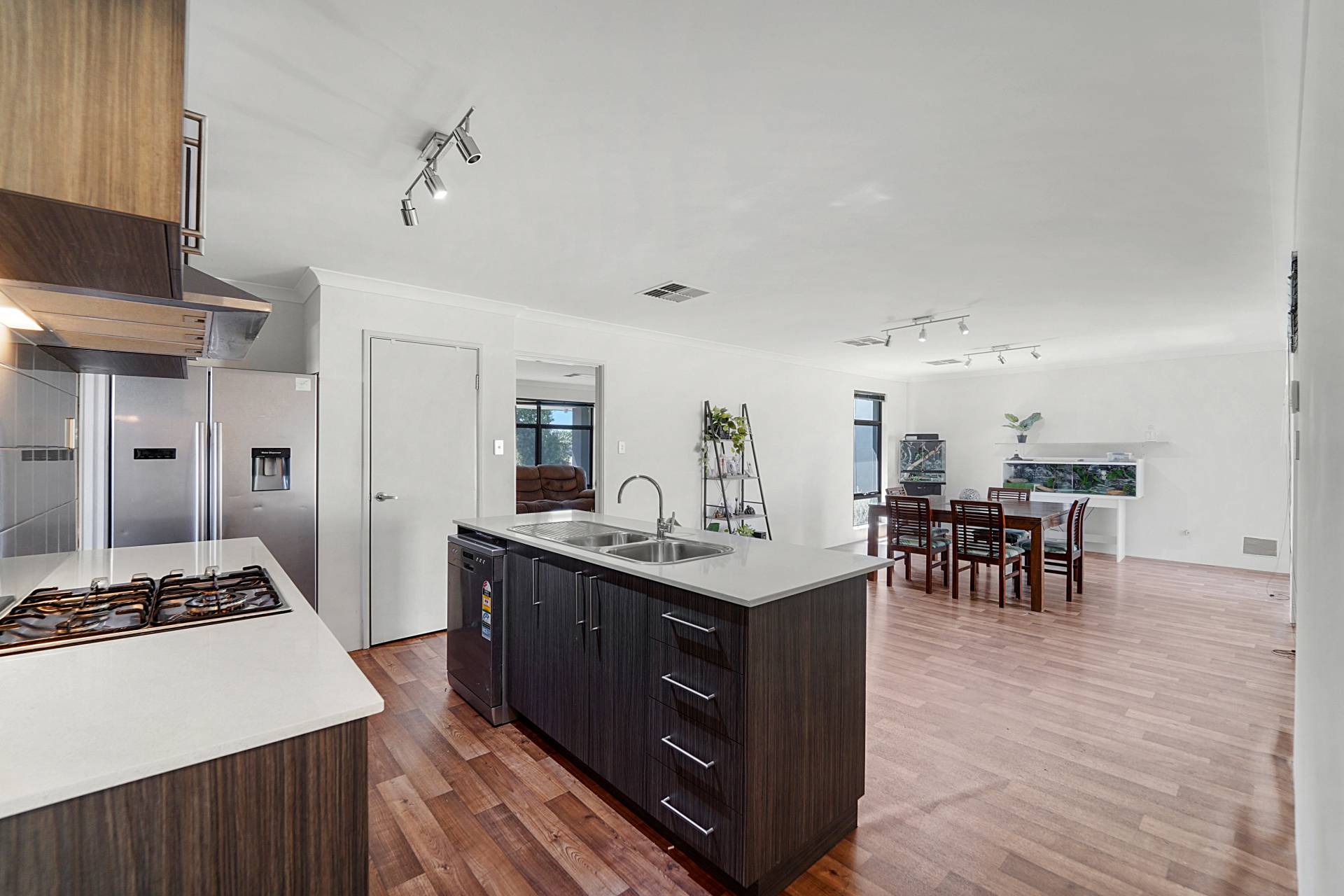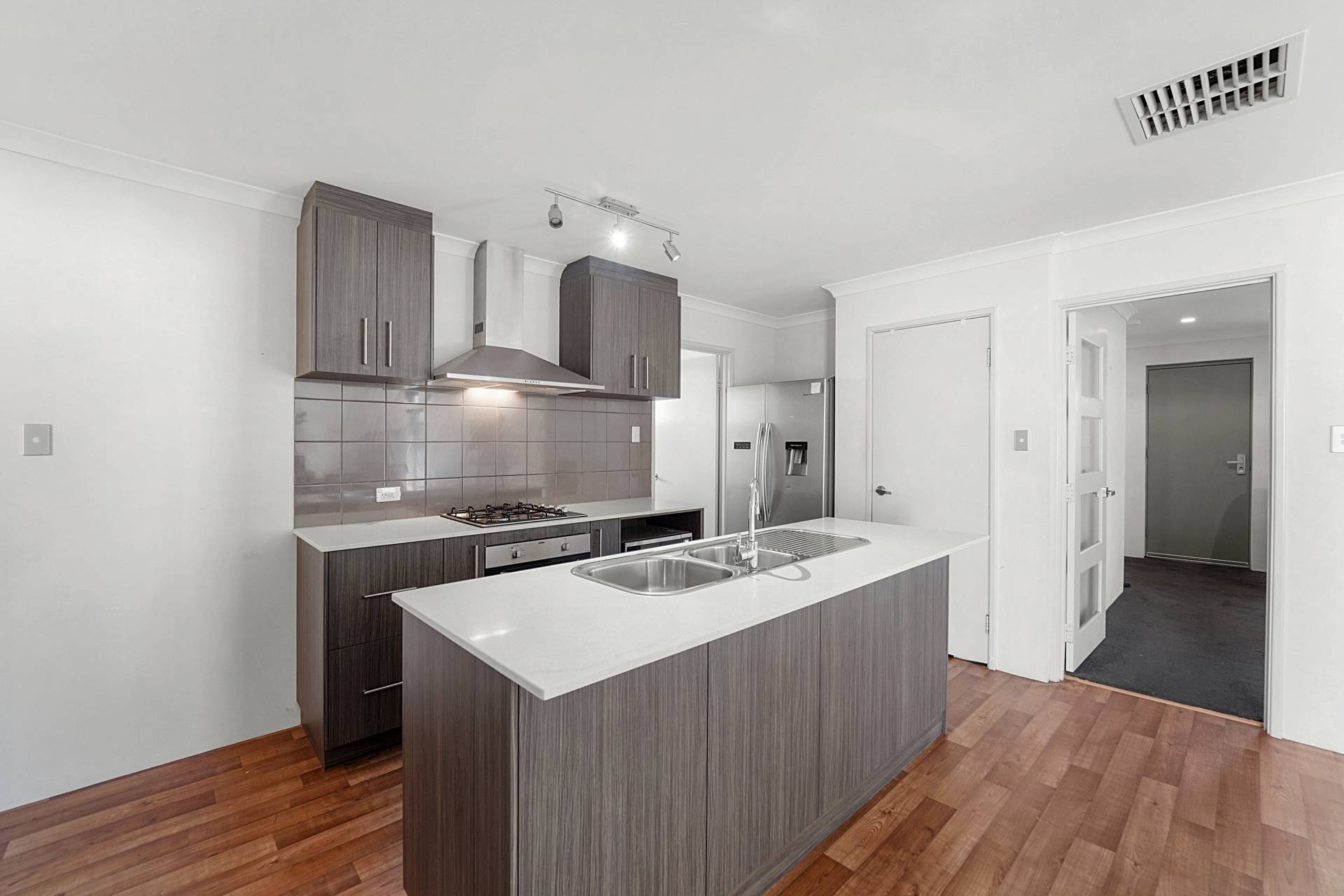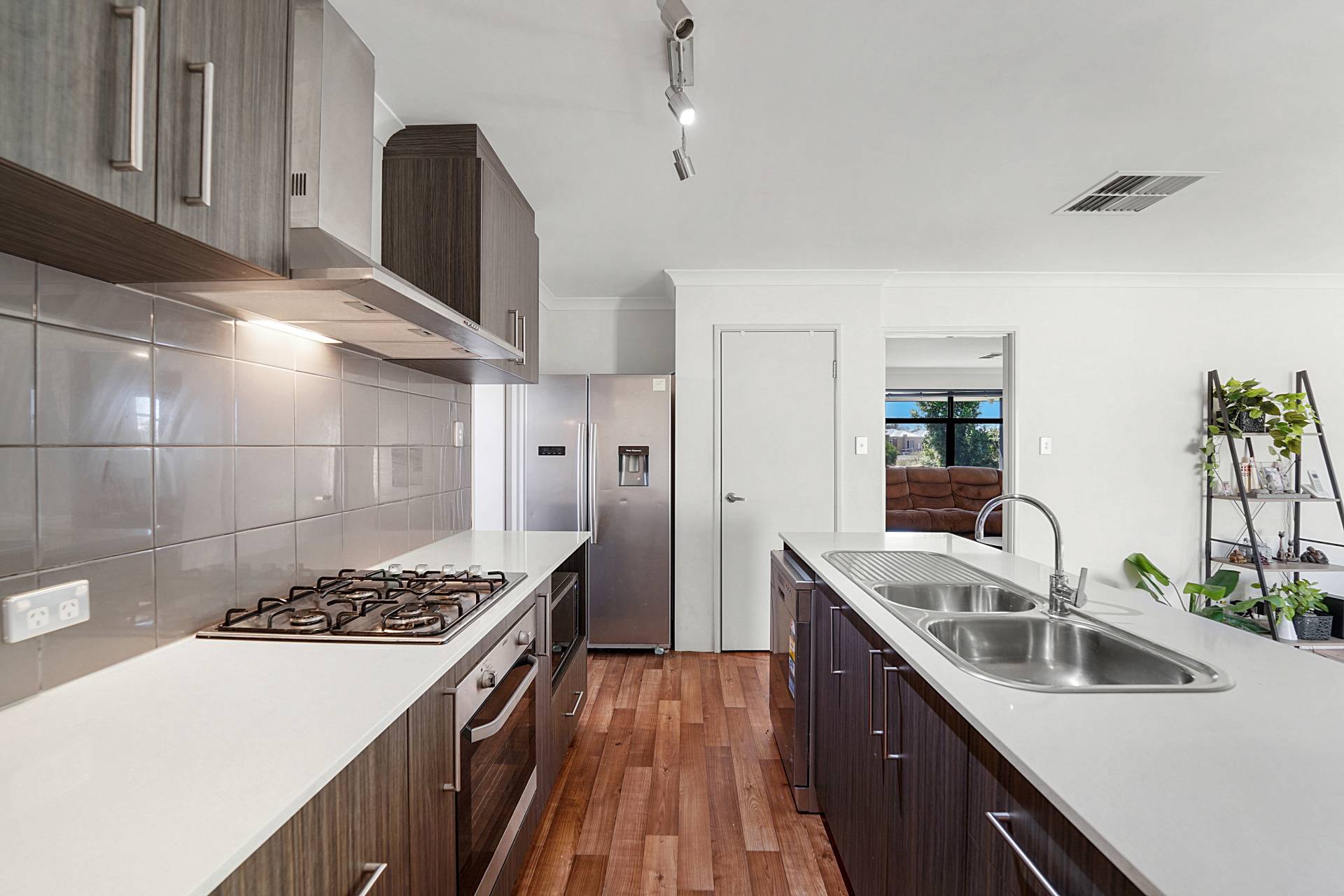 - Well-equipped modern kitchen includes space for a dishwasher, double door fridge recess, 4 burner gas cooktop, oven, stainless steel rangehood, double sink and plenty of storage with overhead cabinetry