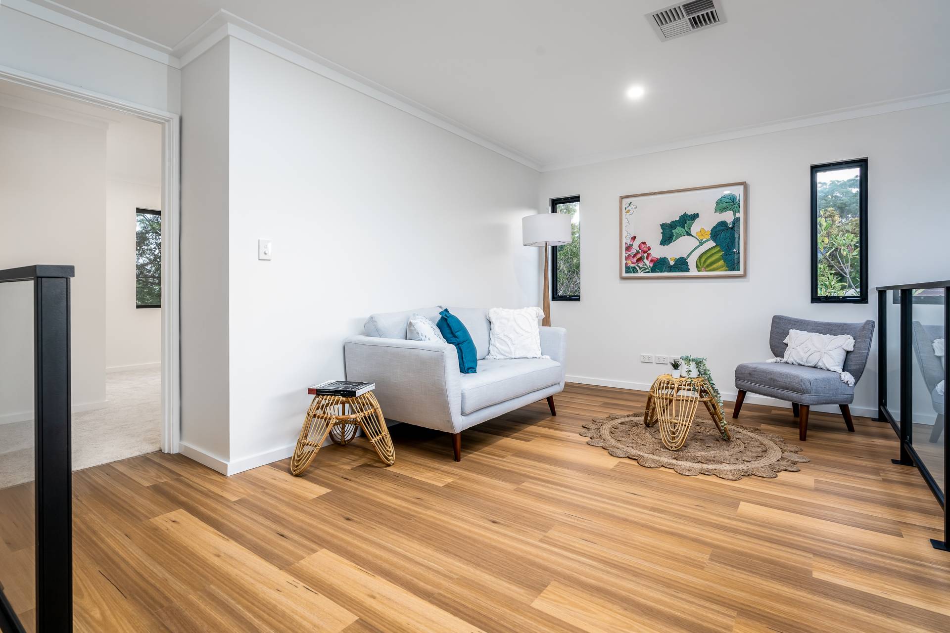 - Beautiful timber styled flooring flows from the entrance and sweeps through the living areas both upstairs and down