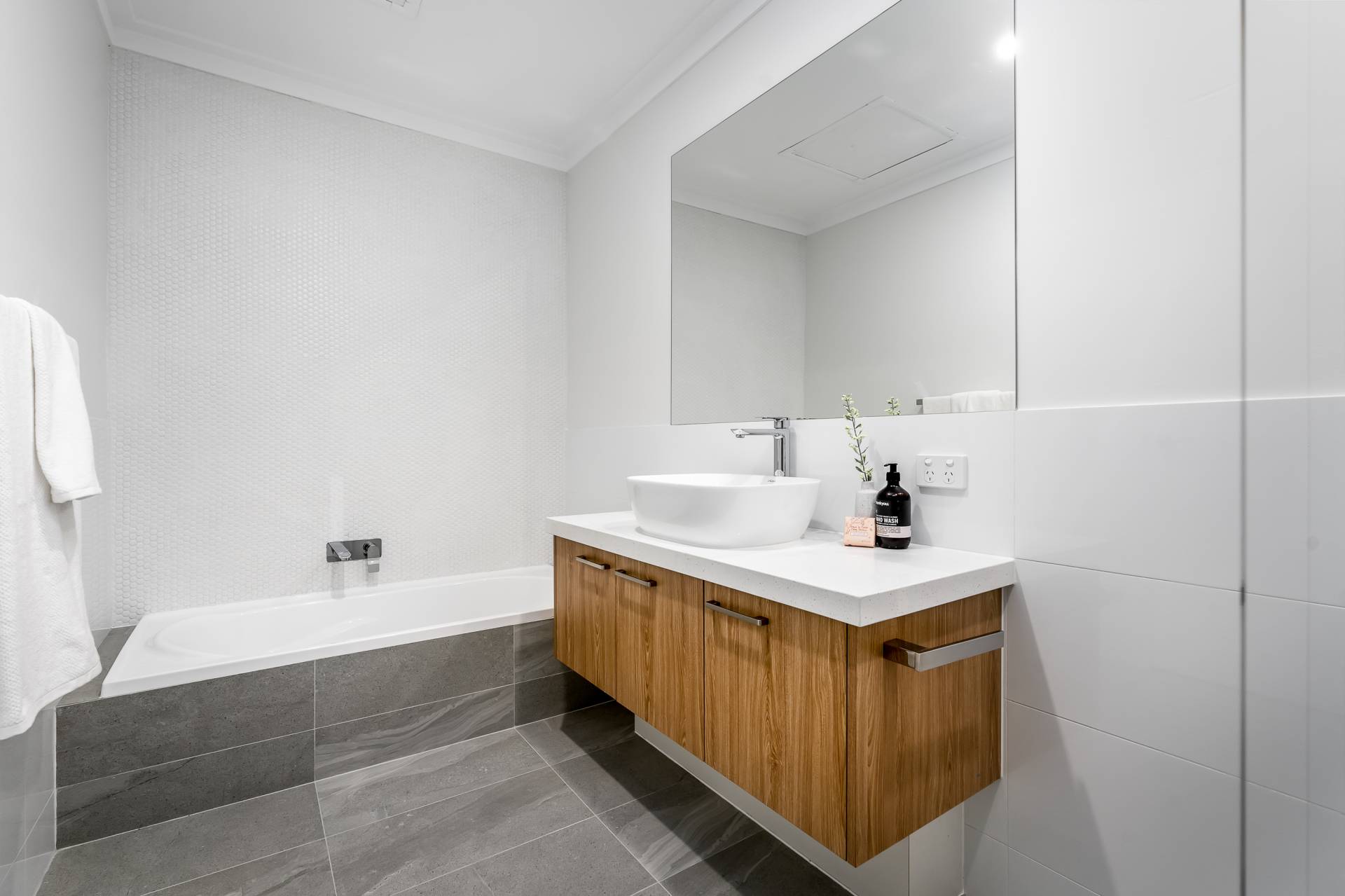 - Main bathroom complete with a separate bath and shower, feature mosaic tile, beautiful wood finished cupboards, sparkling stone benchtop and designer sink.