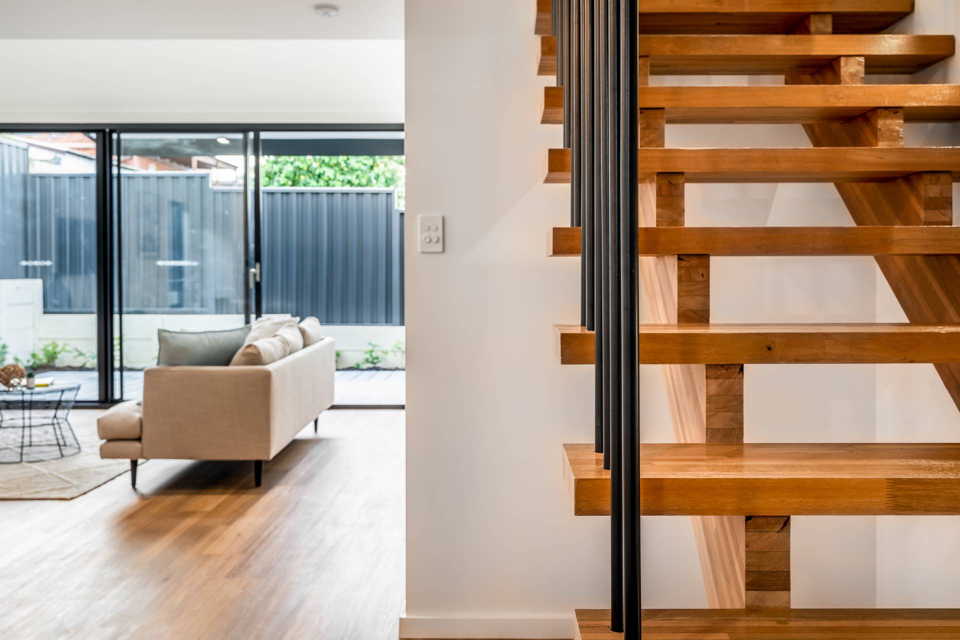 - Beautiful feature wood staircase connects the upstairs and downstairs living
