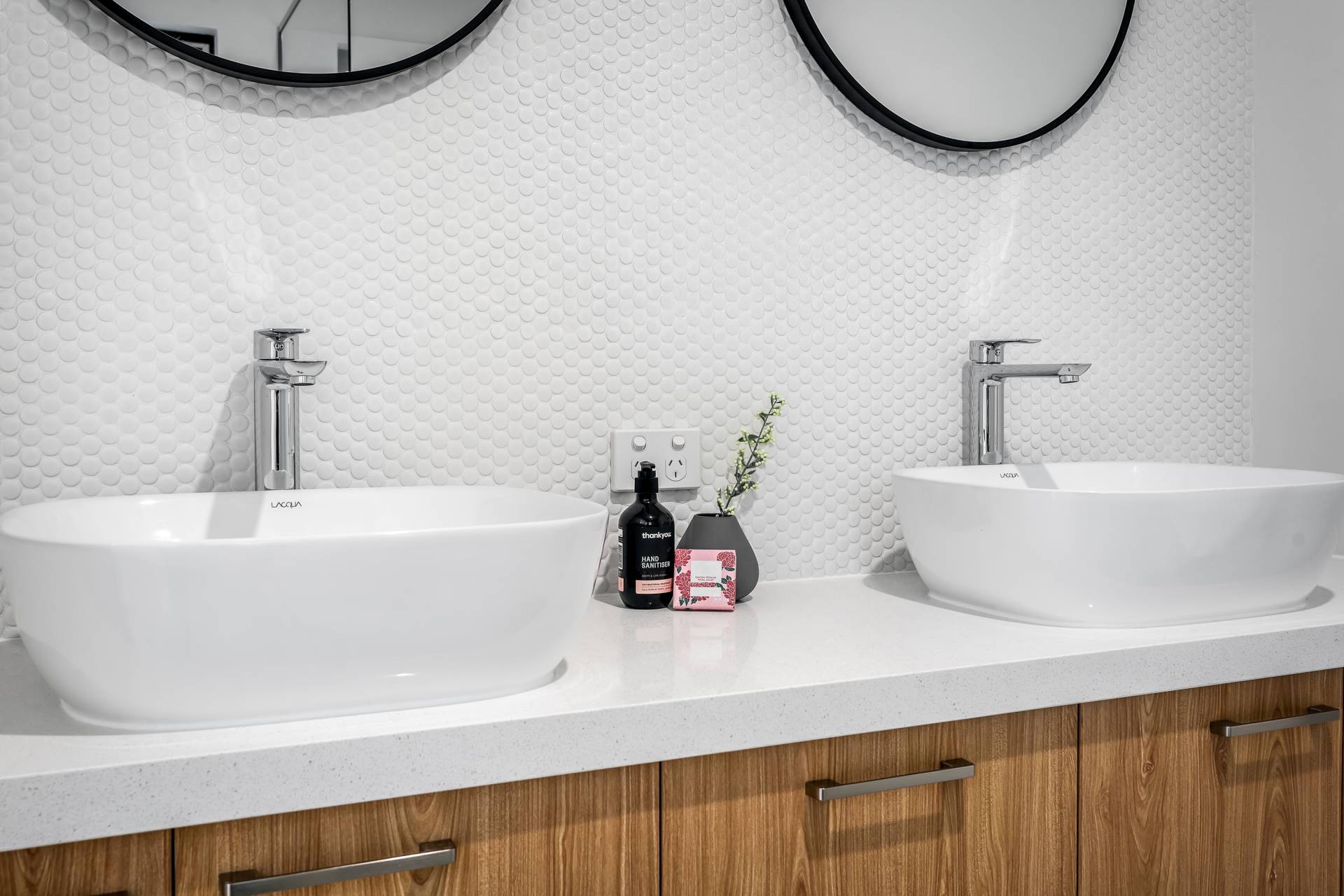 - Floor to ceiling feature mosaic tiled ensuite, wood finished cupboards, sparkling stone benchtop, and his and her designer sinks