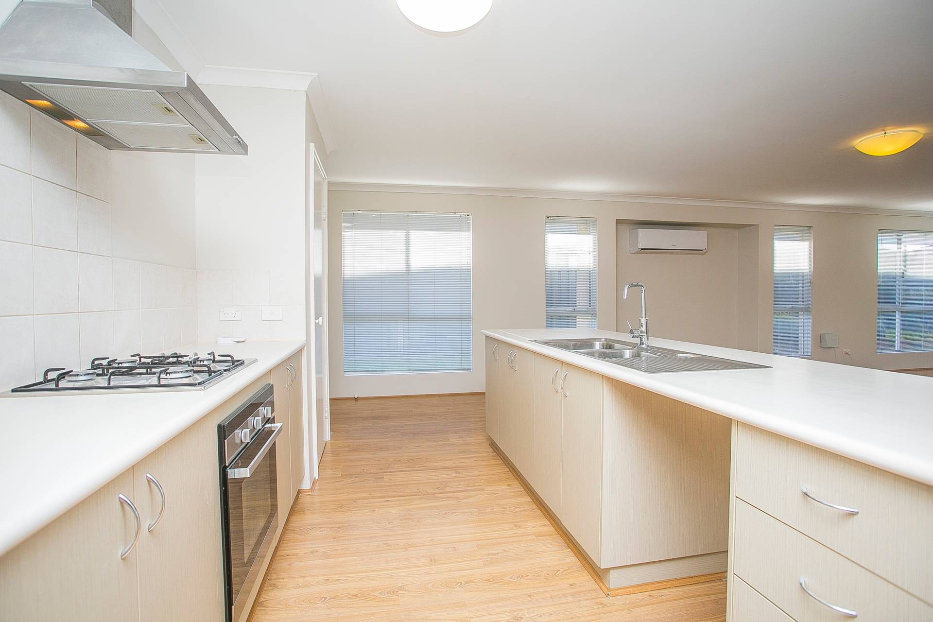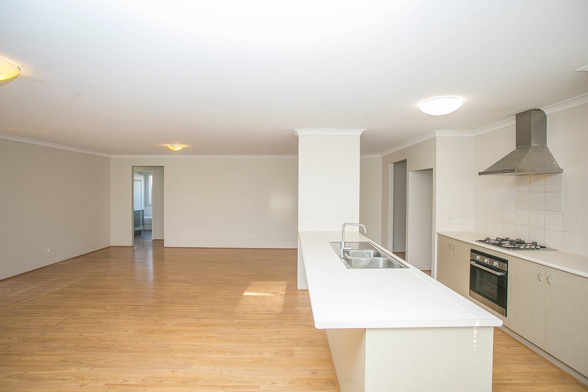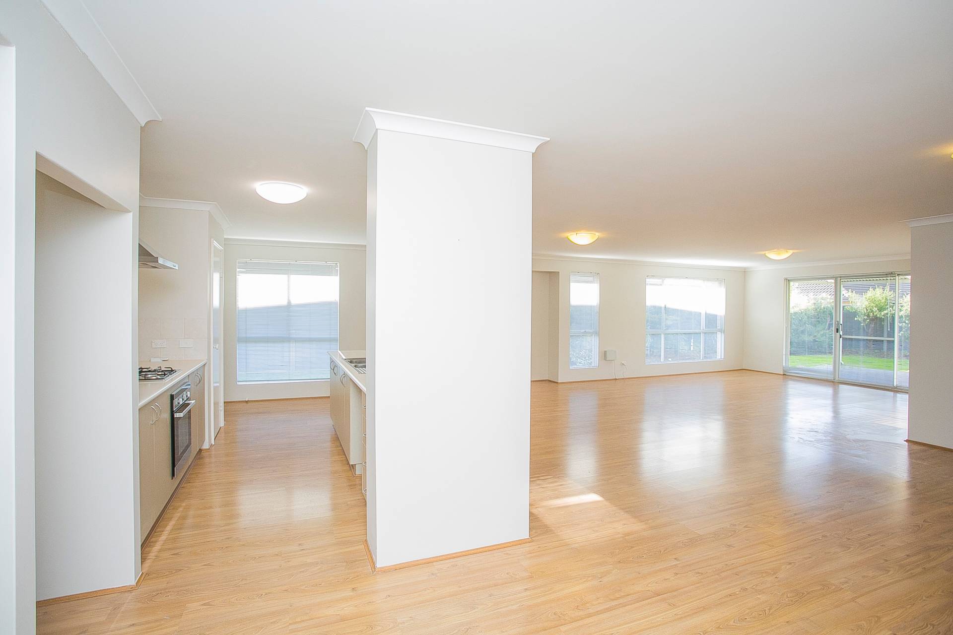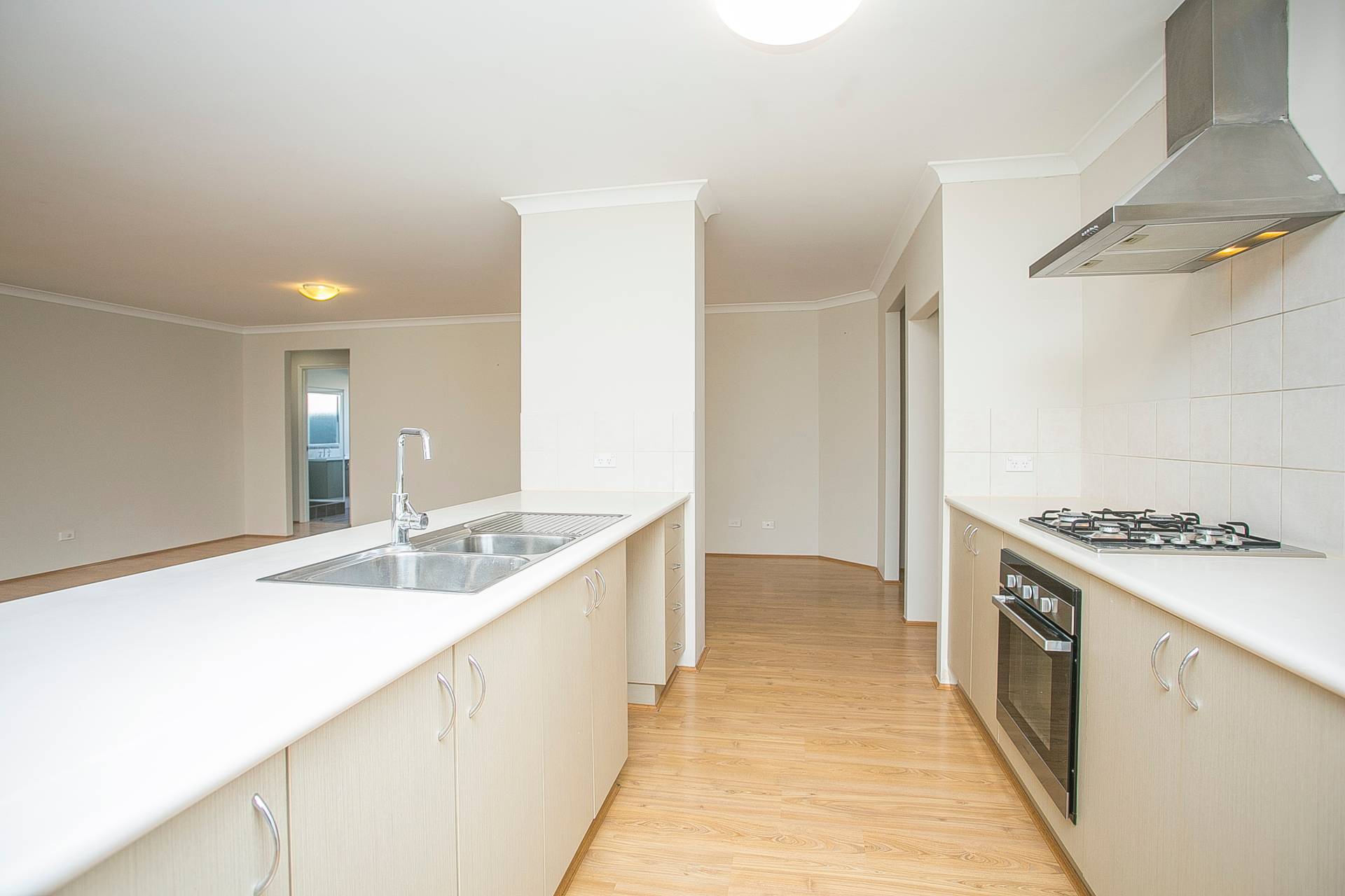 Beyond the bedrooms, the house unfolds into a spacious open-plan living area, underpinned by blonde engineered flooring. The galley-style kitchen, equipped with stainless steel cooking appliances, awaits your culinary adventures, whether it's a weeknight dinner or a weekend feast with family and friends.