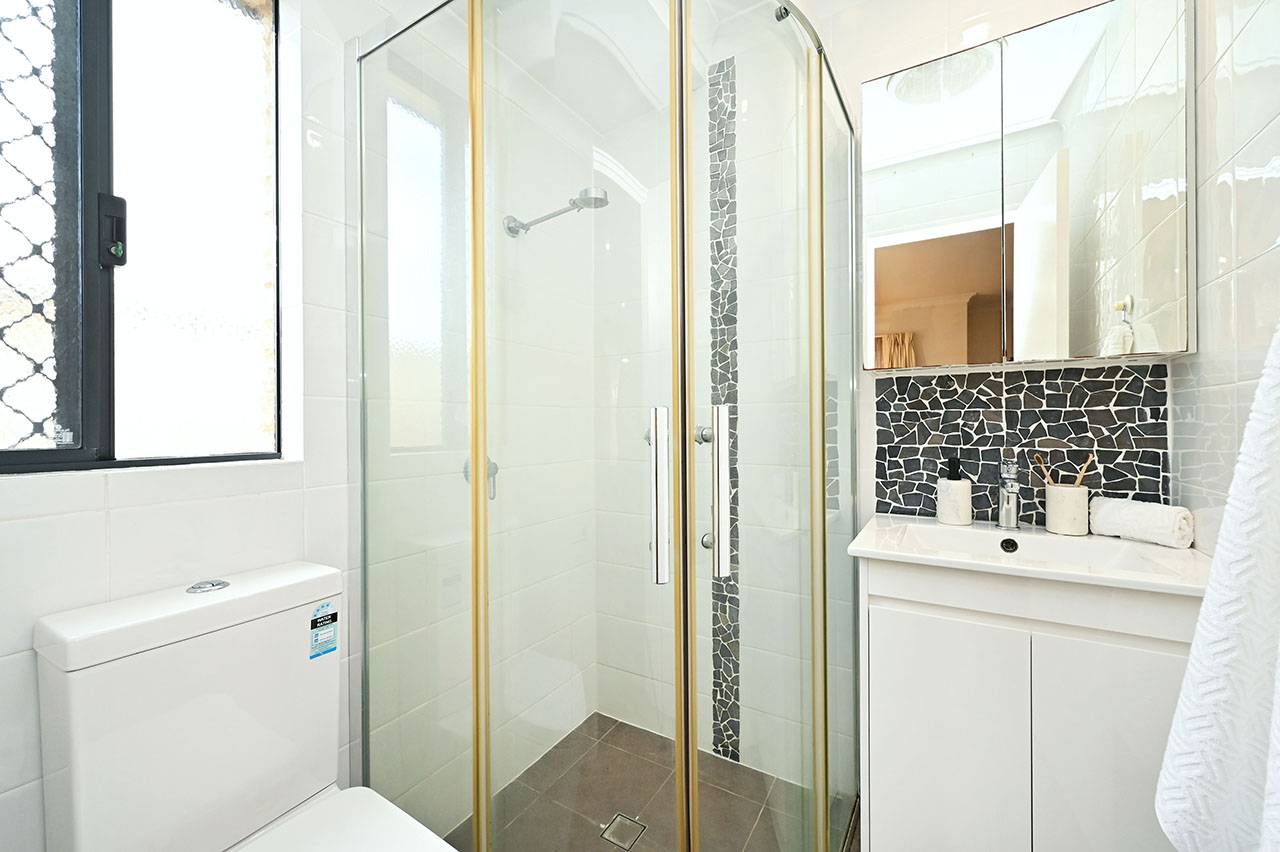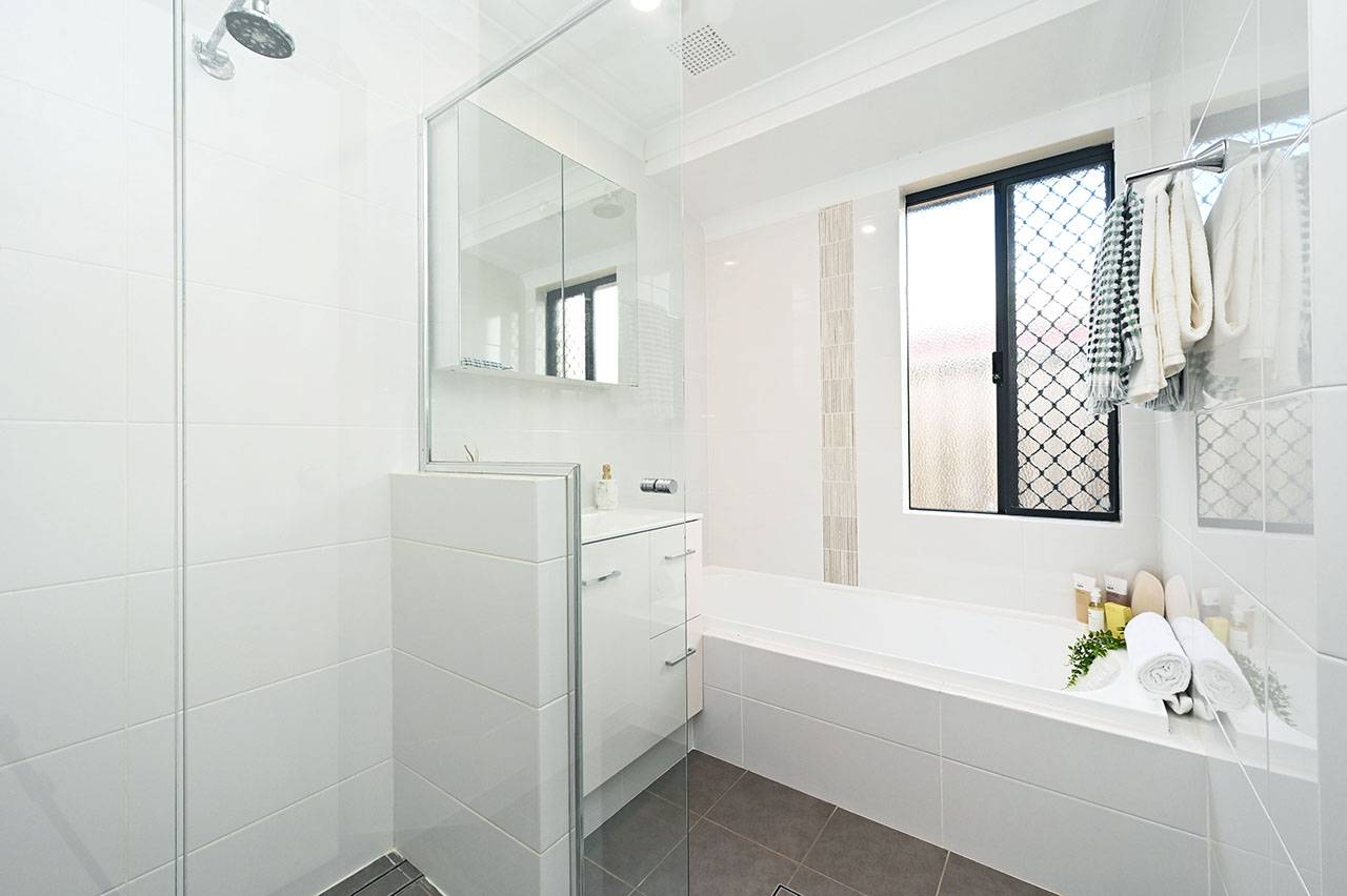 Renovated 2nd bathroom with bath, shower with glass screen and full height tiling