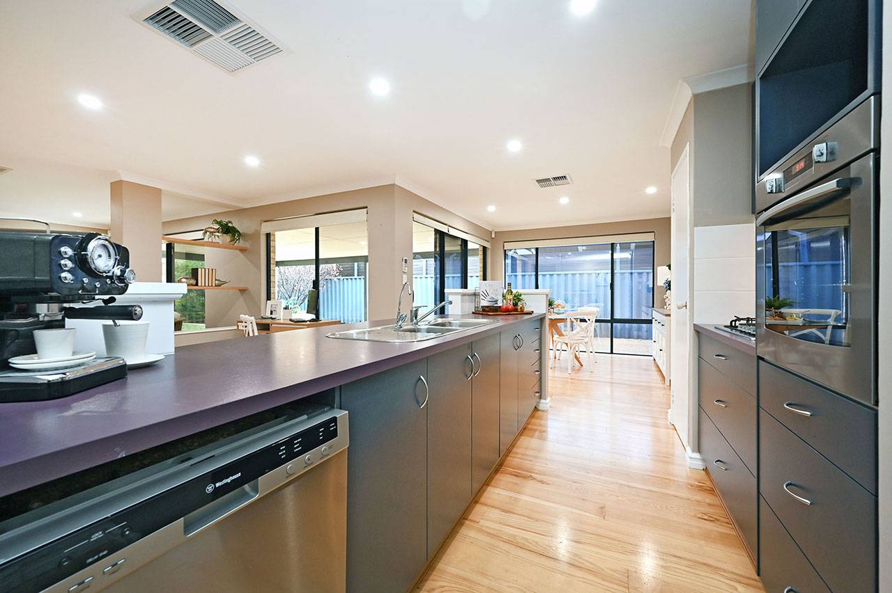 Central kitchen with stainless steel appliances, rangehood, fridge recess, microwave recess, dishwasher, overhead inbuilt cupboards and plenty of bench space