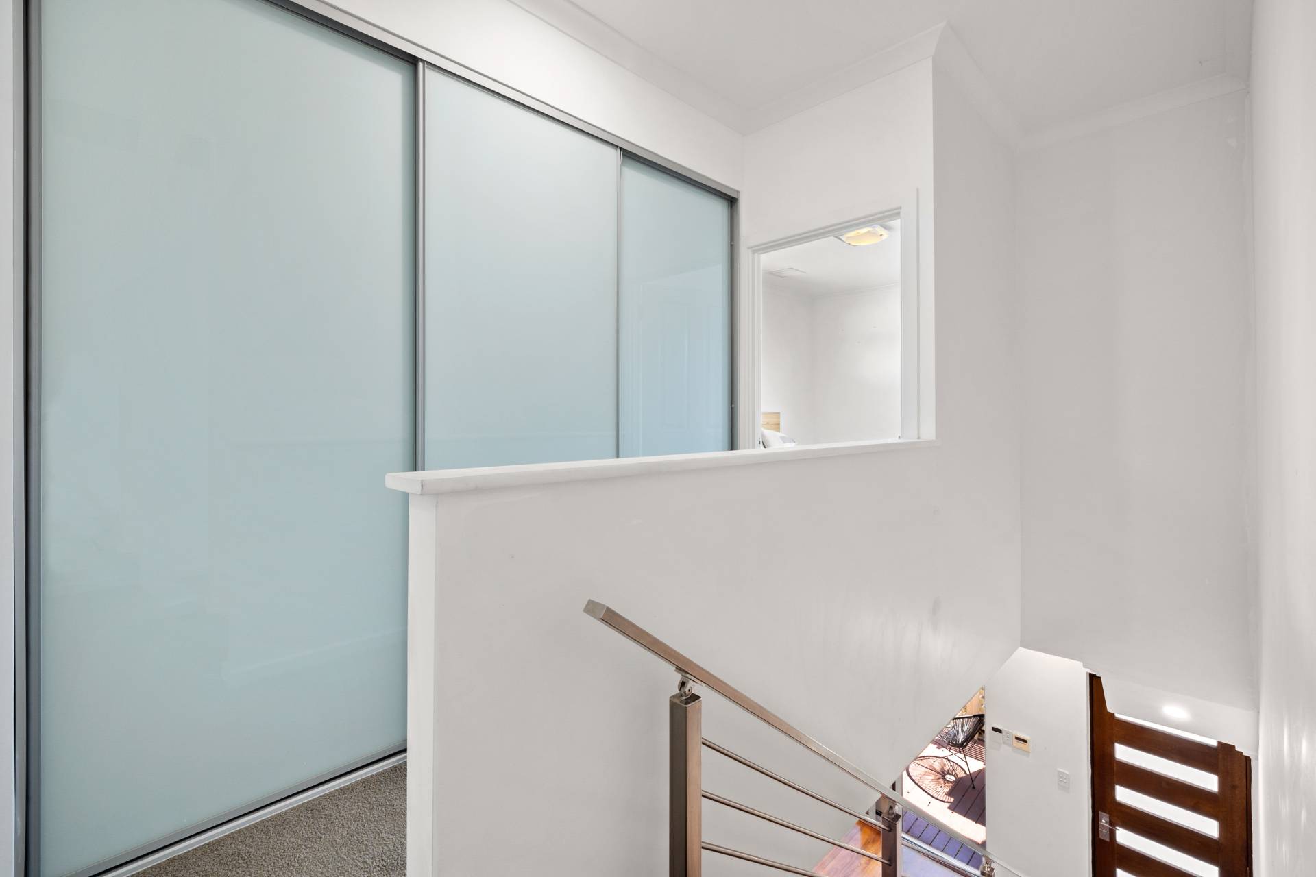 • Solid timber, metal with stainless steel railing staircase takes you upstairs to spacious bedrooms and loads of storage with large three panel frosted sliding glass door storage in the passage.