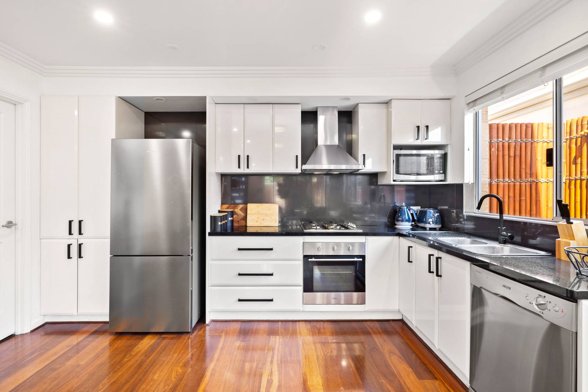 • Kitchen with stainless steel appliances, black fittings, black granite benchtops and glass splashback adds to the contemporary style.