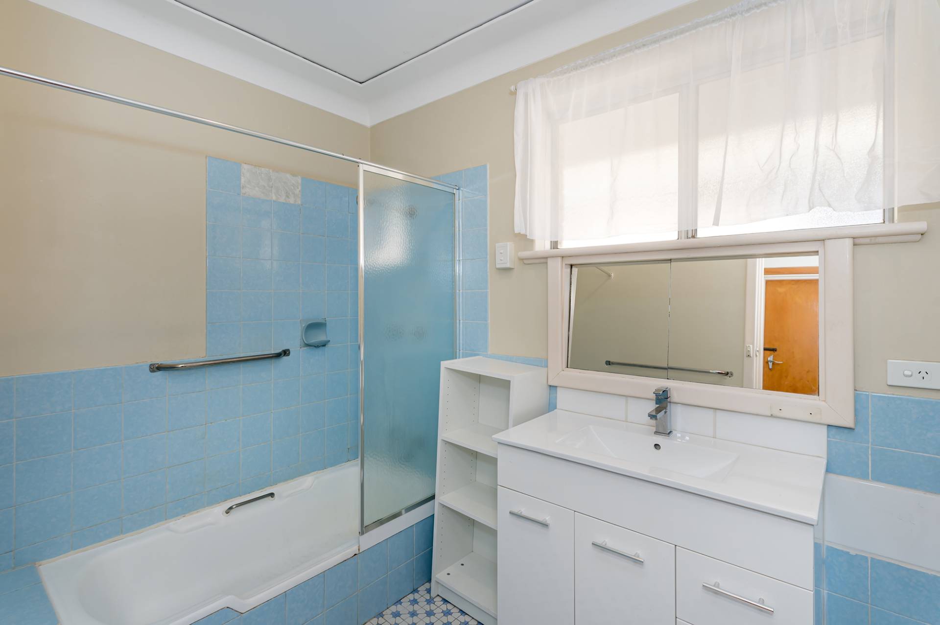 Step inside and feel right at home, with recently added laminate timber floors flowing through every room and updated lighting and window treatments. Delve into the retro-style kitchen, fitted with an upright electric oven, cooktop, and timber cabinetry, complimented by the wooden door frames, window sills and skirting boards. The bathroom is a fresh, bright space with a touch of vintage flair. Finished in white and powder blue, it includes a tub and chic patterned floor tile.