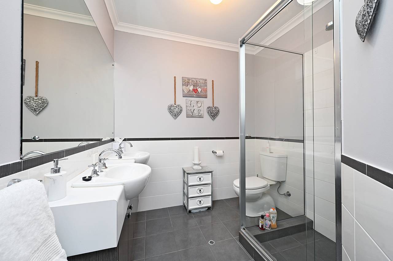 Light and bright modern ensuite with stylish fixtures and fittings, full length twin vanity and mirror, plus shower with glass screen